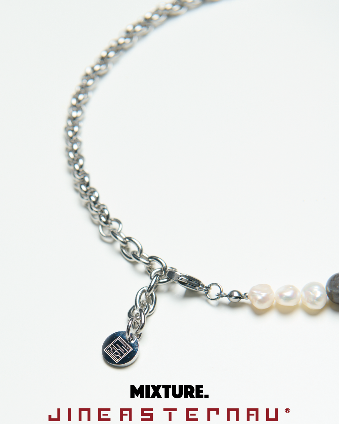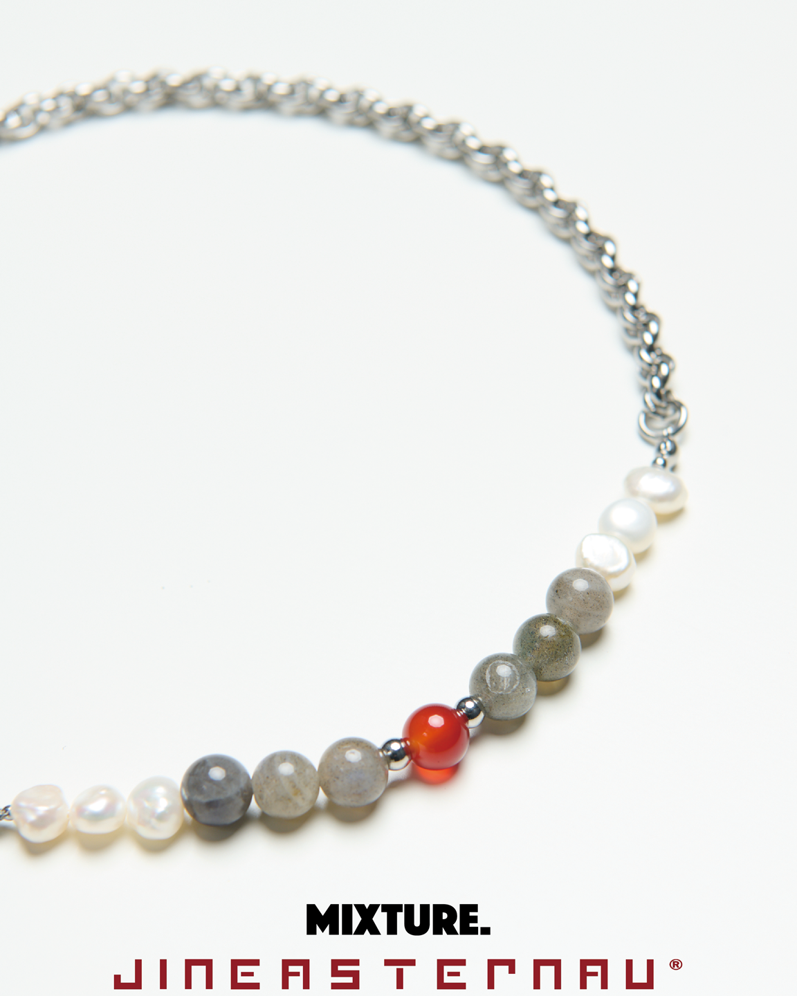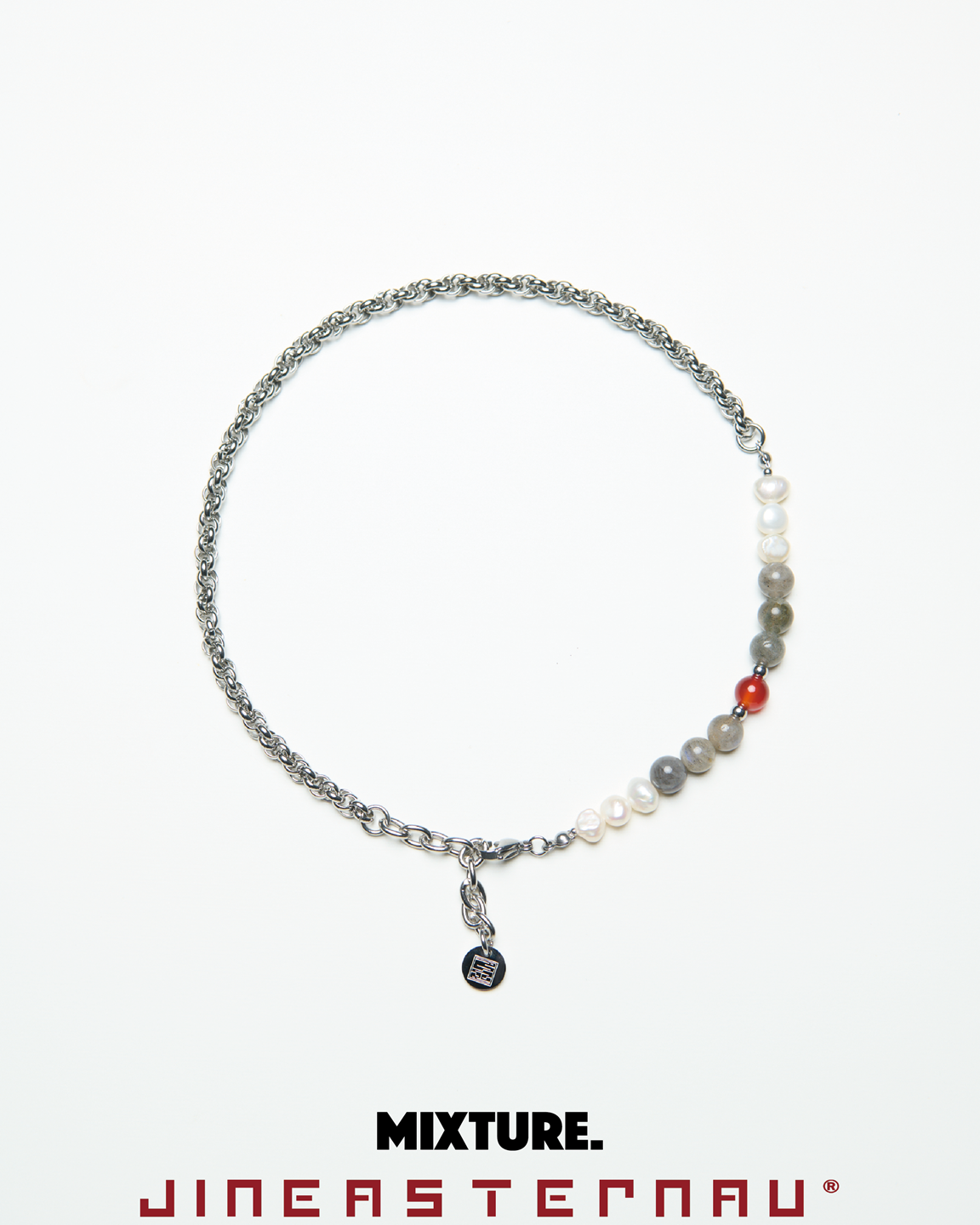 *材質:使用鋼/ 淡水珍珠 / 天然月光石切割圓珠 /天然紅瑪瑙切割圓珠 / 拼接而成之款式,因皆為天然生成之玉石珠,每款顏色及紋路皆為獨一無二之款式。尾部扣有雙品牌特製聯名鋼牌