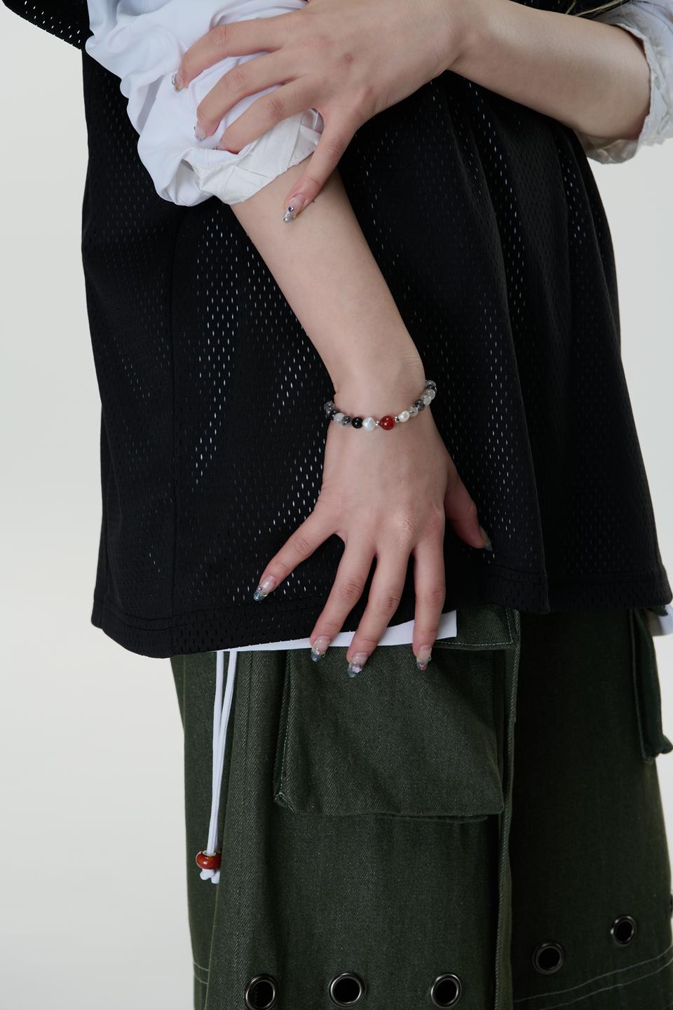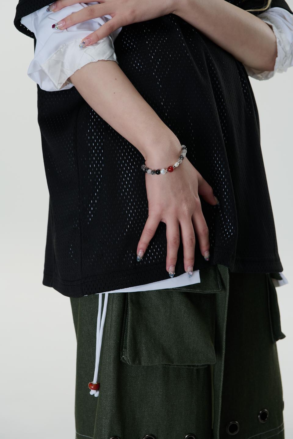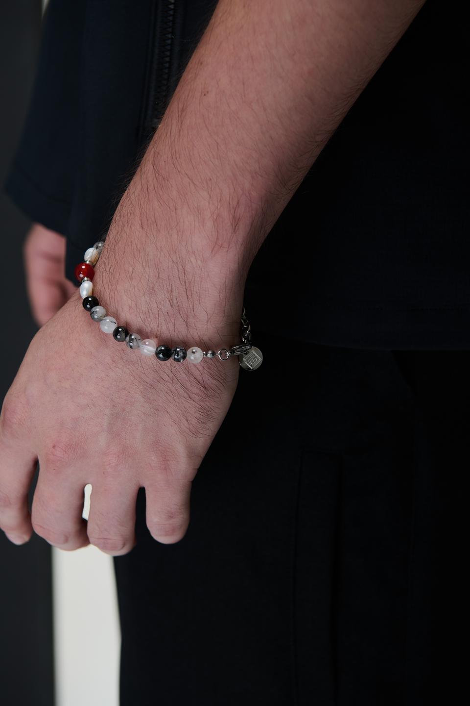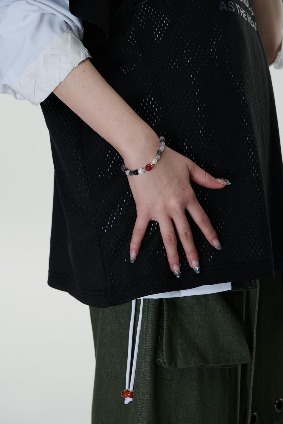 *材質:使用鋼/ 淡水珍珠 / 天然黑髮晶切割圓珠/天然紅瑪瑙切割圓珠/因皆為天然生成之玉石珠,每款顏色及紋路皆為獨一無二之款式。尾部扣有雙品牌特製聯名鋼牌