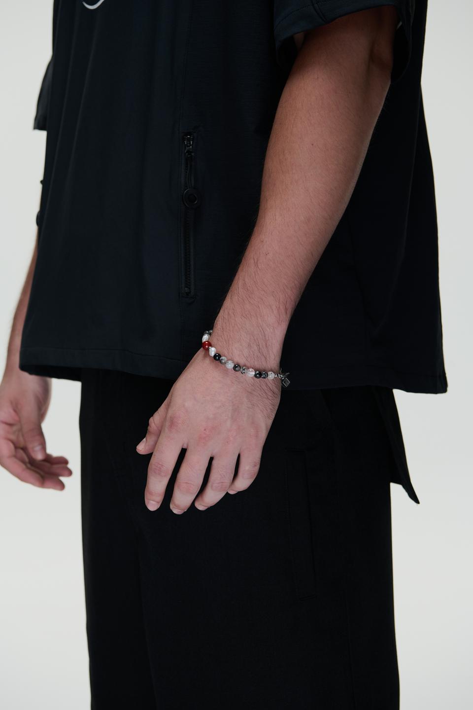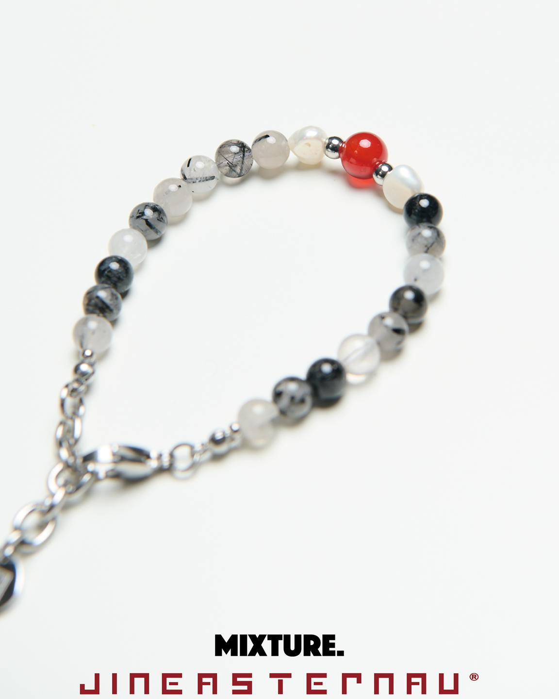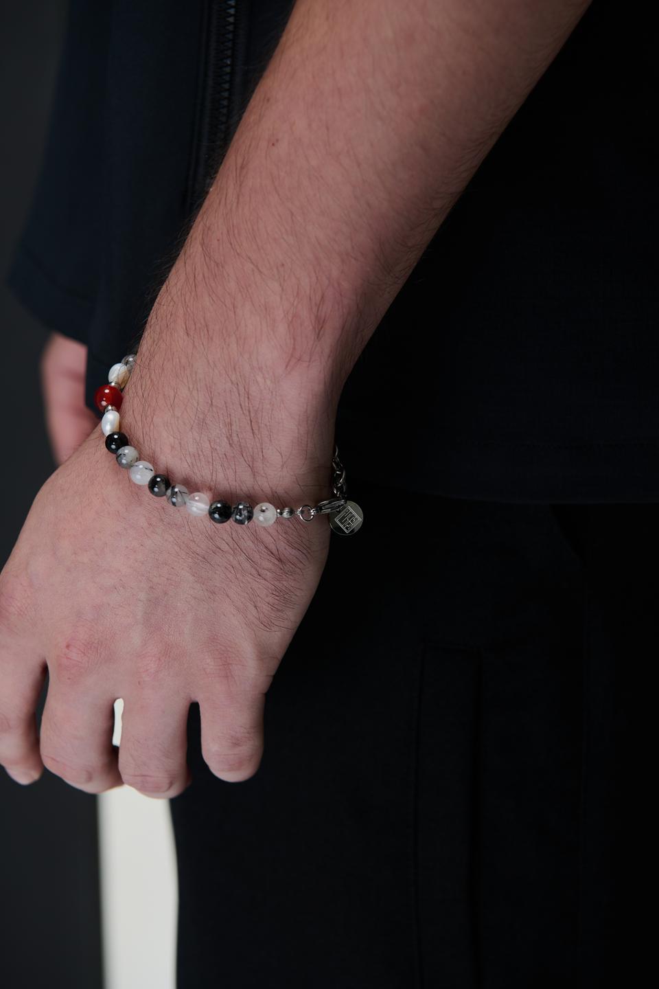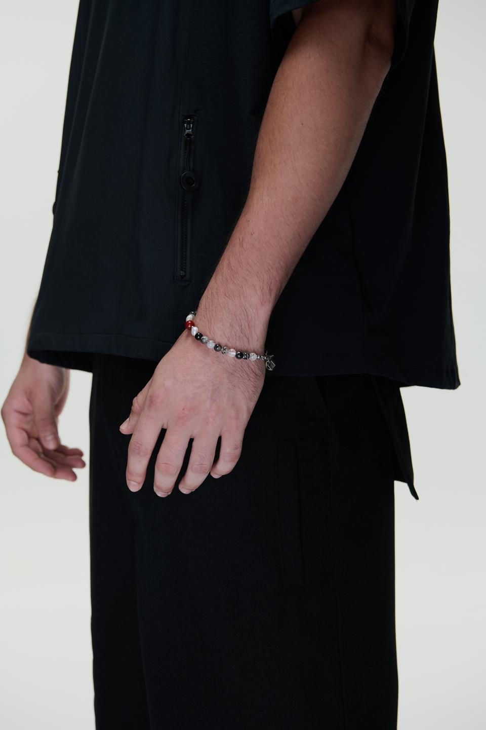 *材質:使用鋼/ 淡水珍珠 / 天然黑髮晶切割圓珠/天然紅瑪瑙切割圓珠/因皆為天然生成之玉石珠,每款顏色及紋路皆為獨一無二之款式。尾部扣有雙品牌特製聯名鋼牌