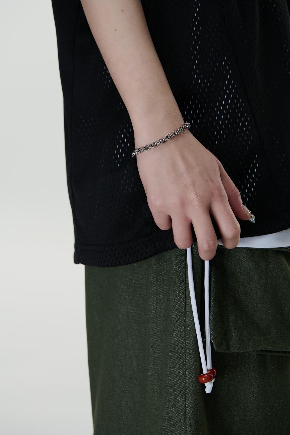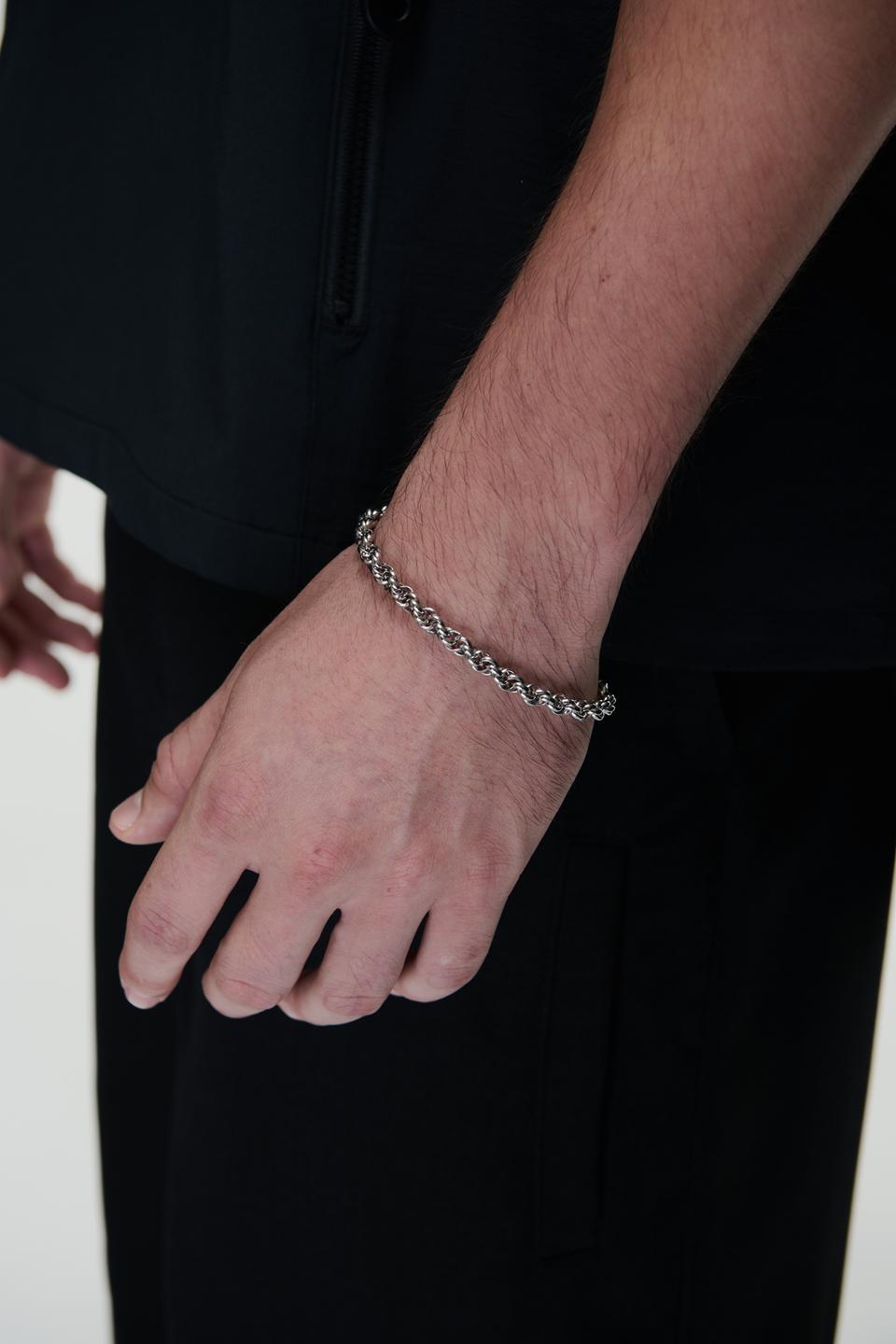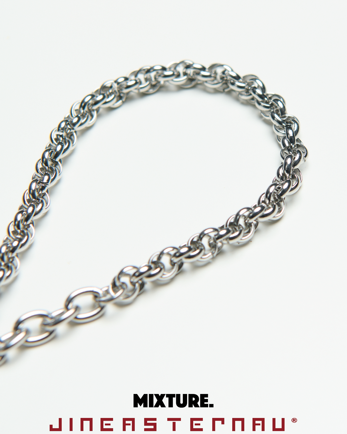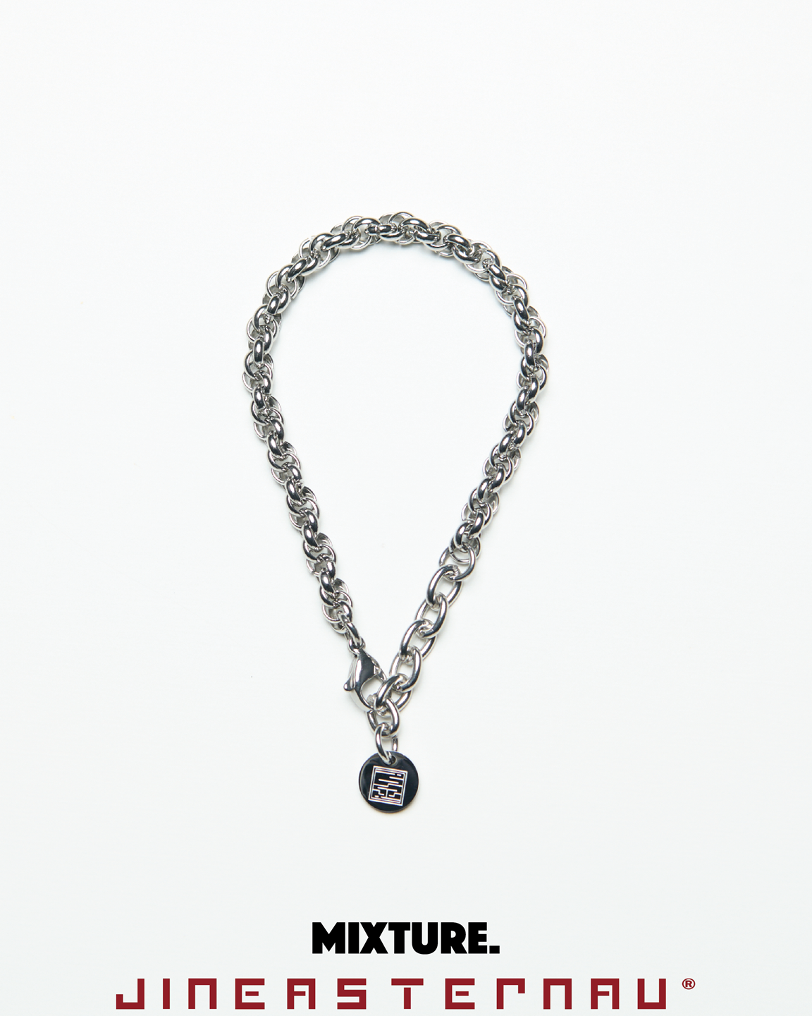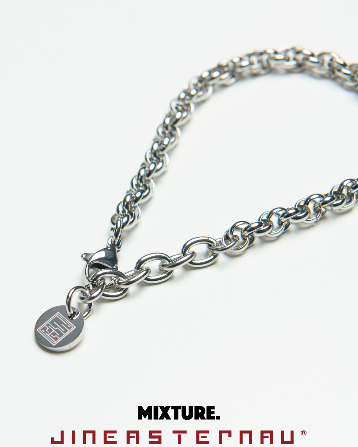 *使用雙股交織編織鏈,以強烈的立體編織紋理打造出極具份量感的輪廓,鍊身細節採用細密鏈節層層交織,象徵中式結繩文化中的「連結」、「守護」寓意。亦有同款項鍊可成套搭配。尾部扣有雙品牌特製聯名鋼牌