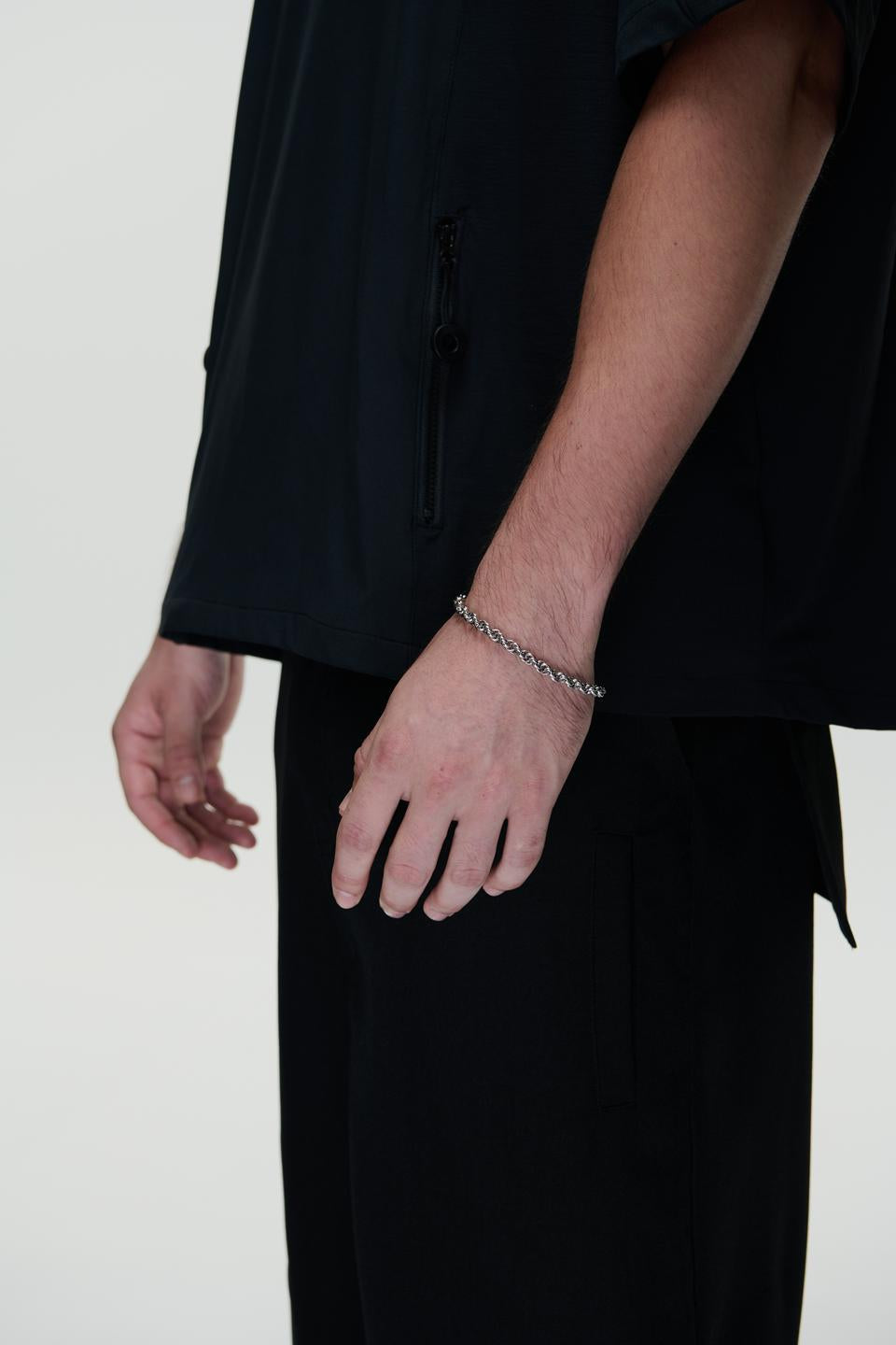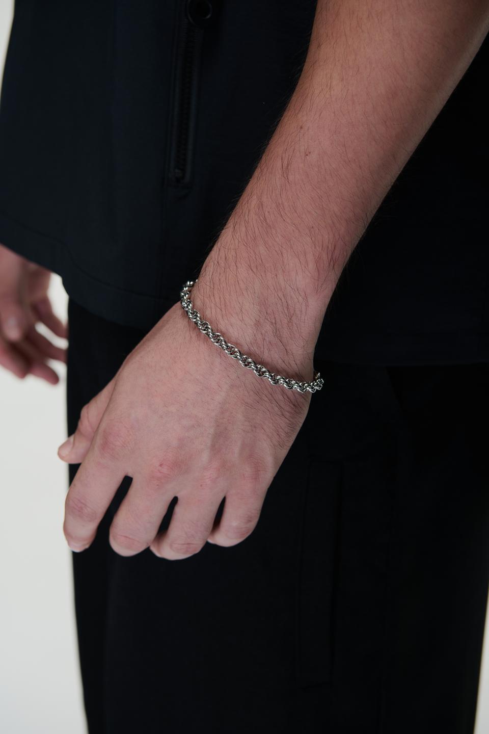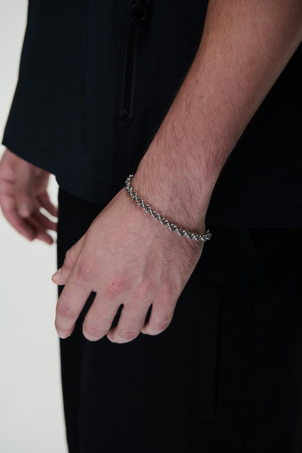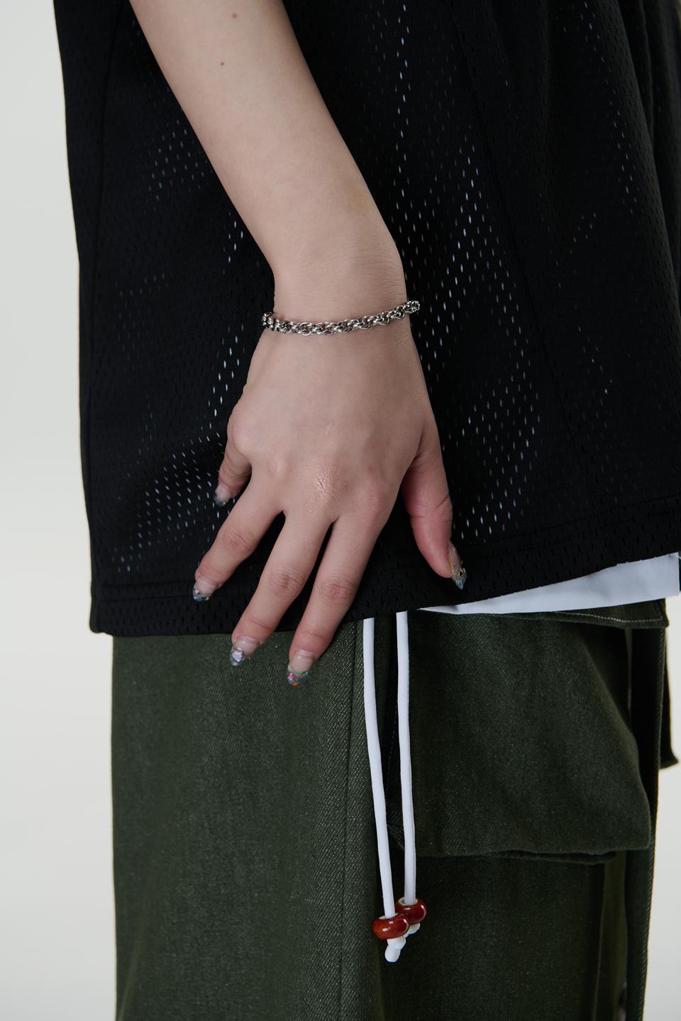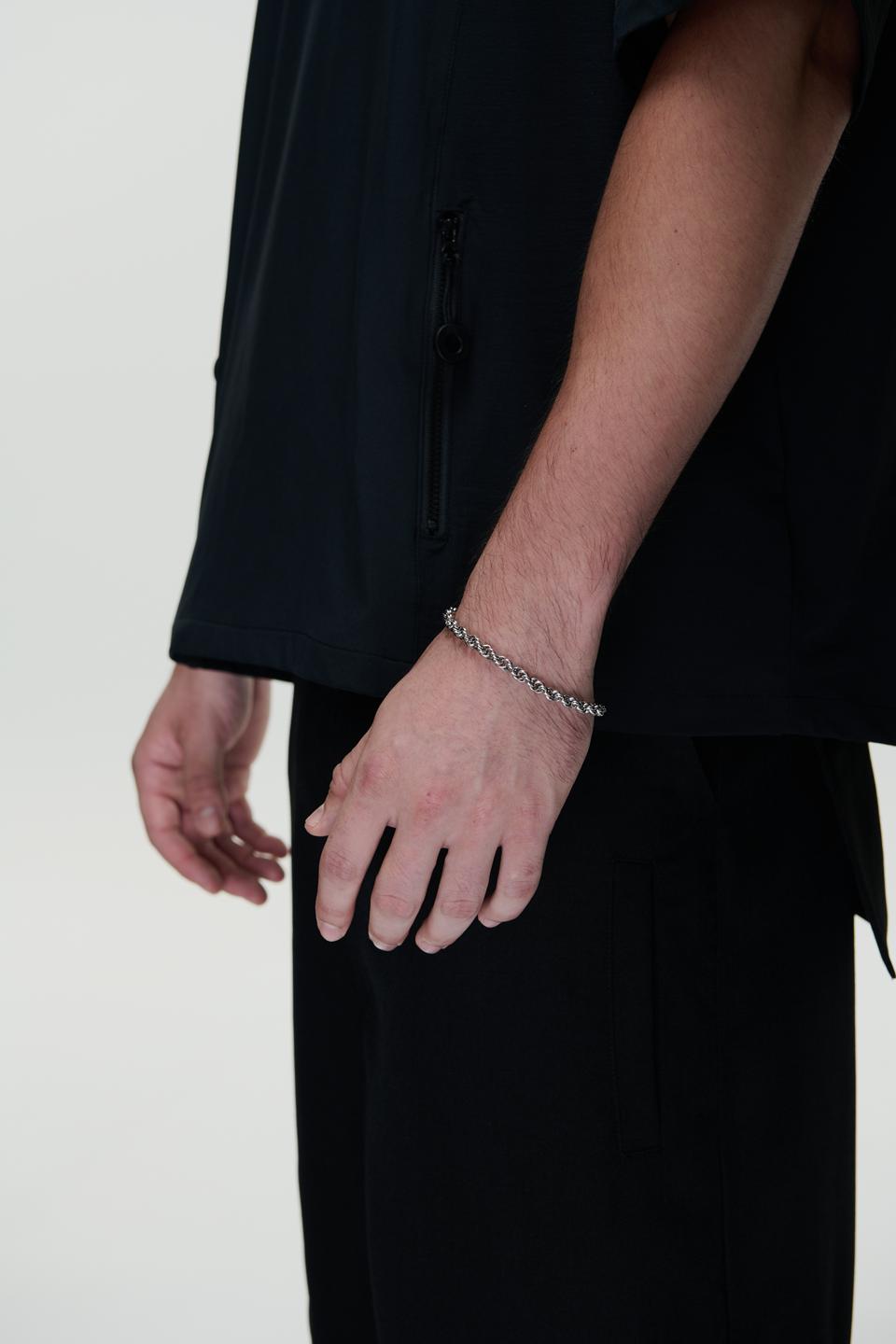 *使用雙股交織編織鏈,以強烈的立體編織紋理打造出極具份量感的輪廓,鍊身細節採用細密鏈節層層交織,象徵中式結繩文化中的「連結」、「守護」寓意。亦有同款項鍊可成套搭配。尾部扣有雙品牌特製聯名鋼牌