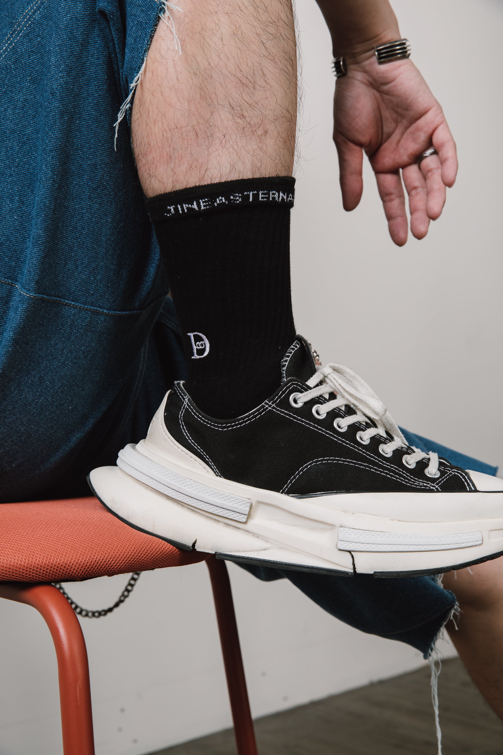 襪身以高磅純棉織造,紮實包覆力適合長時間穿著。踝側雙面電繡 Logo,行走間若隱若現,是屬於細節控的暗號;而緹花編織的 JINEASTERNAU 字樣,讓整體層次更有變化,搭配高筒或反摺穿法都成立。