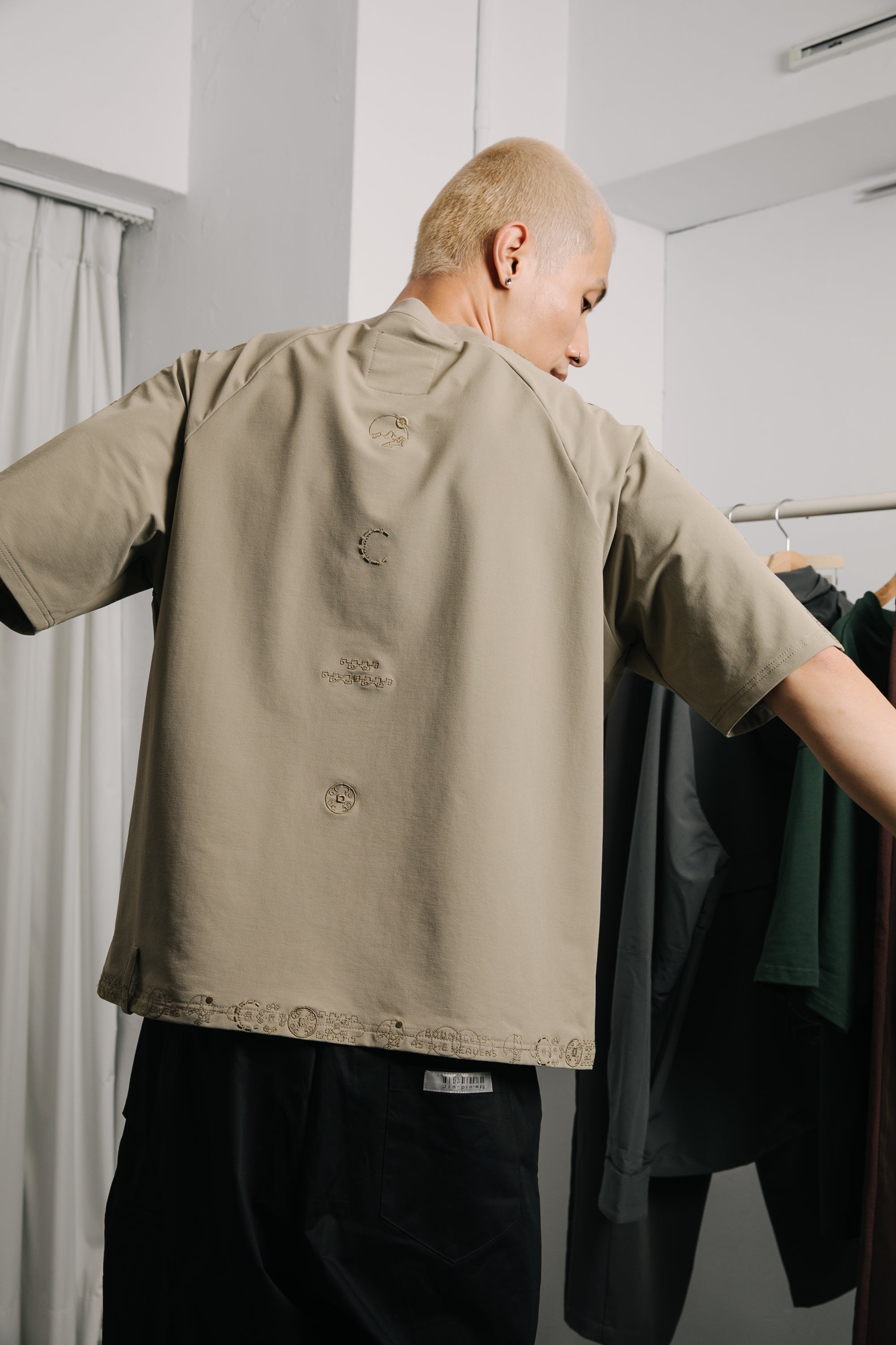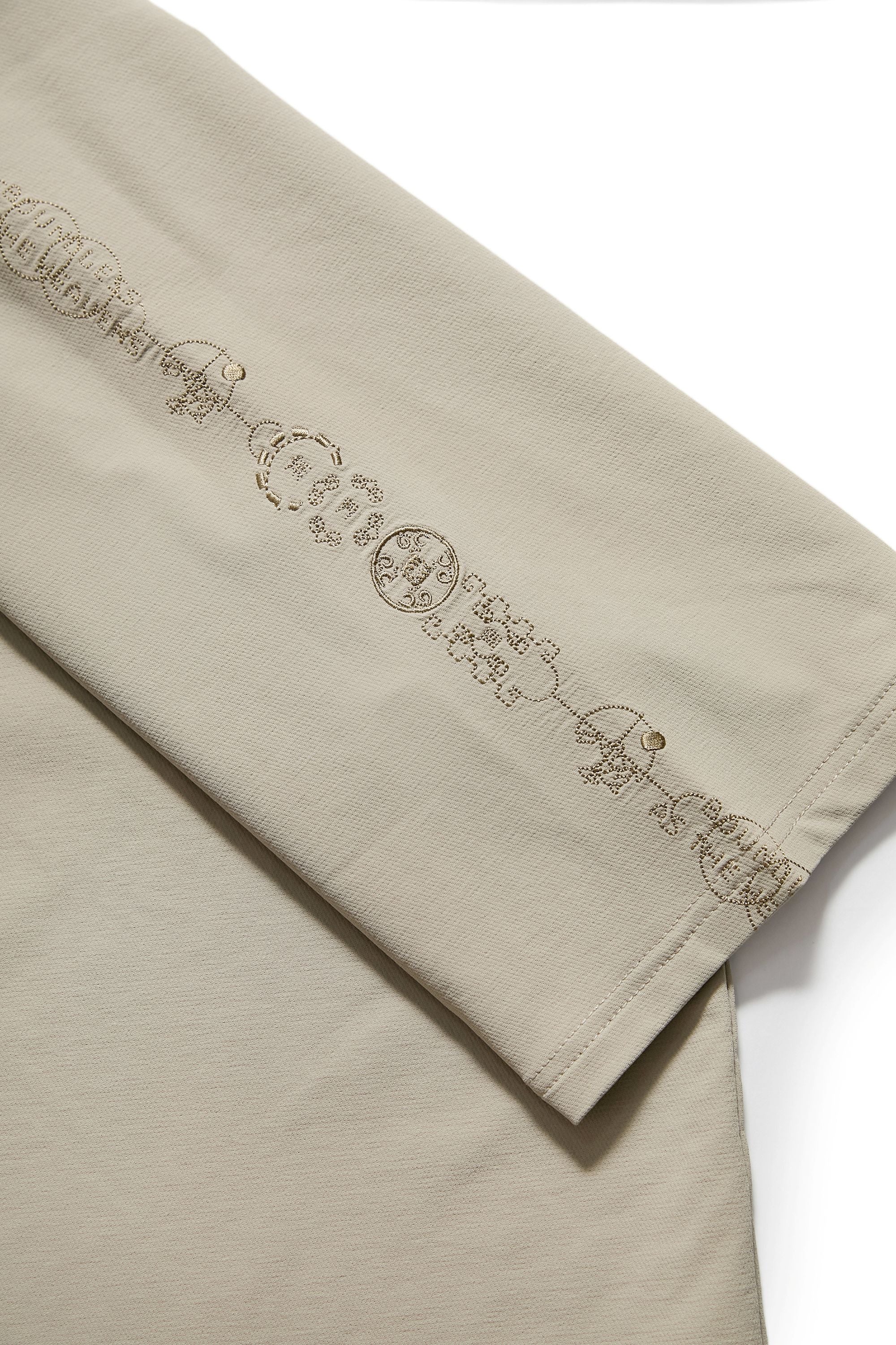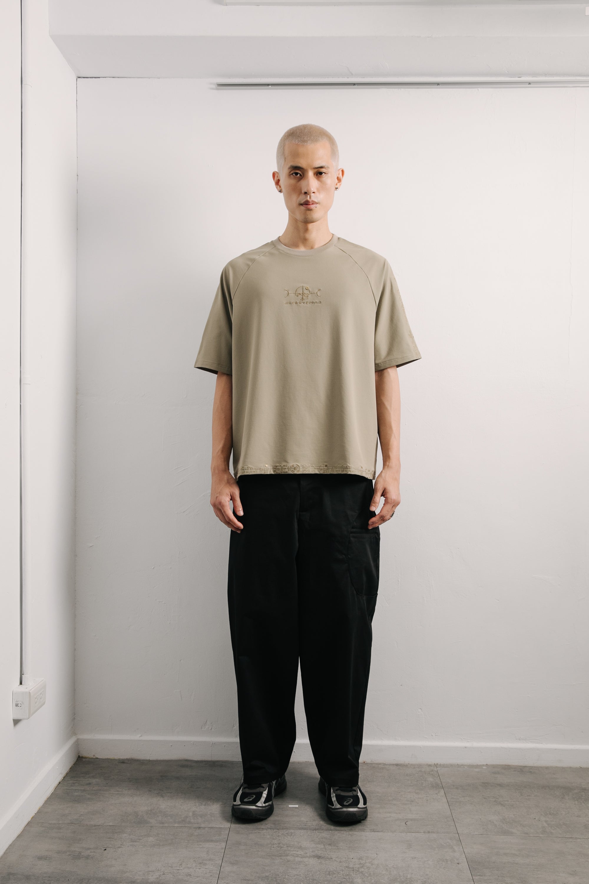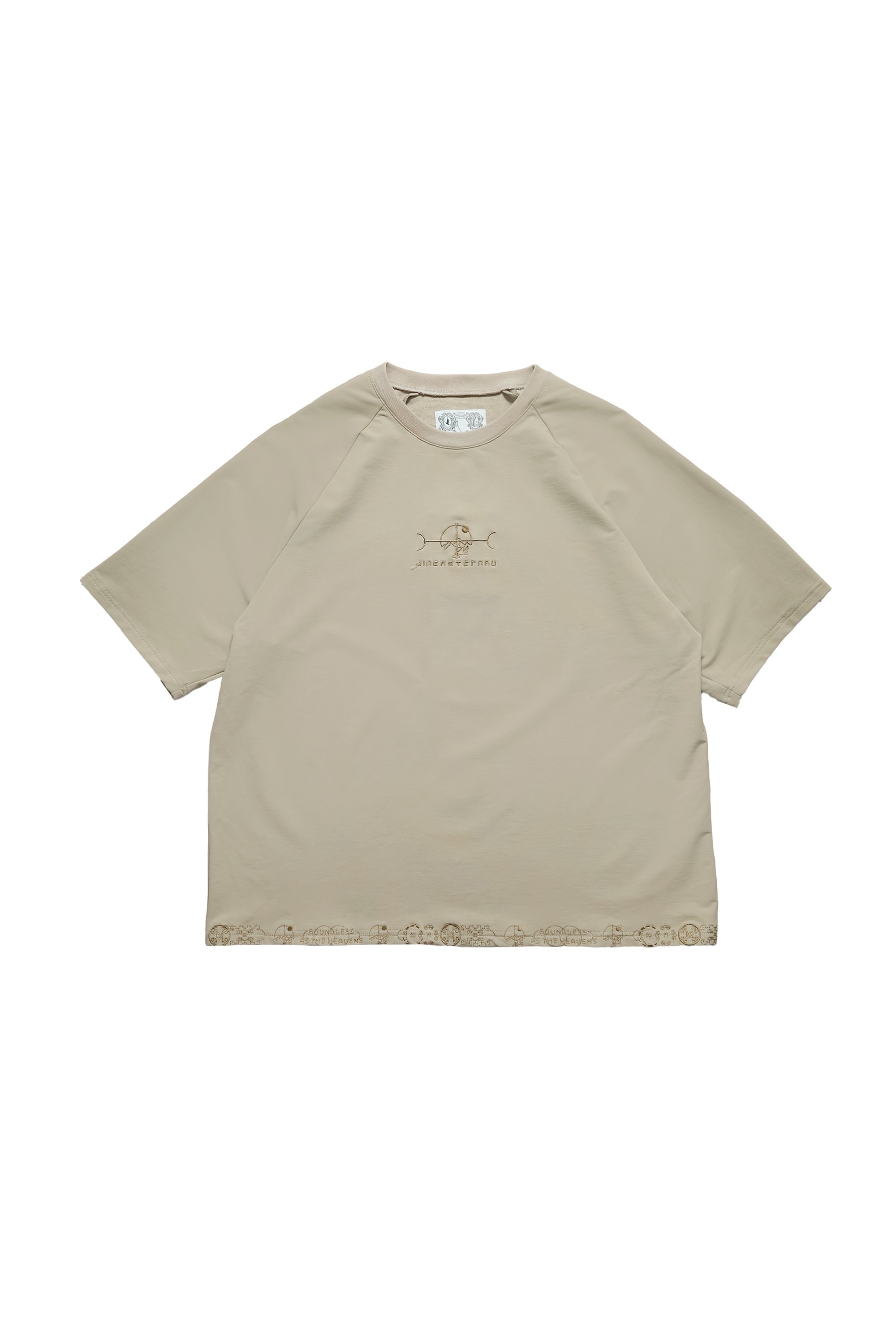 本款以“天圓無界”為靈感,將方與圓的傳統東方哲學延伸至服裝結構之中。透過 JINEASTERNAU 擅長的尼龍面料與電繡語彙,打造出這款拉克蘭袖短上衣,整體剪裁呈現更自然的線條流動。