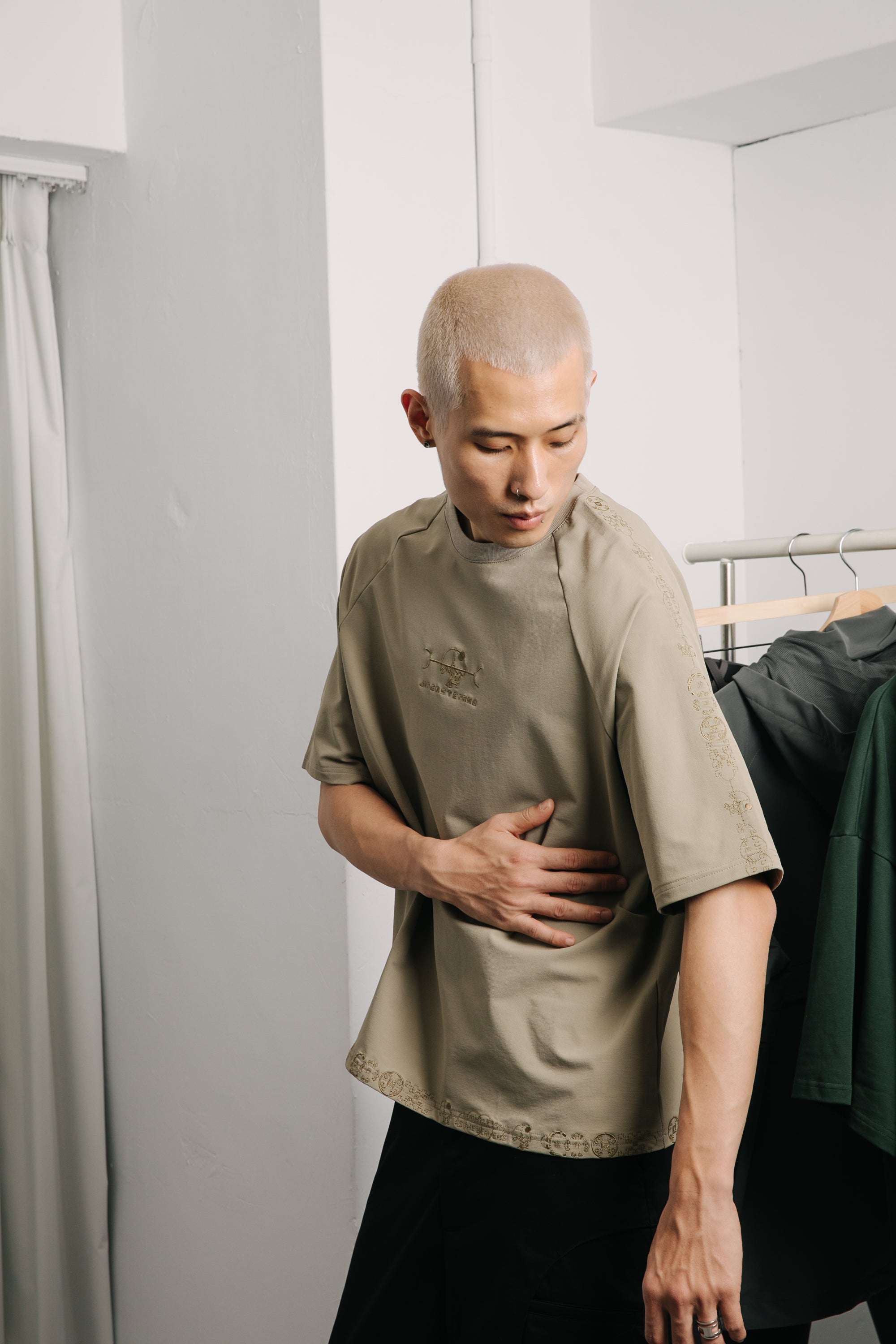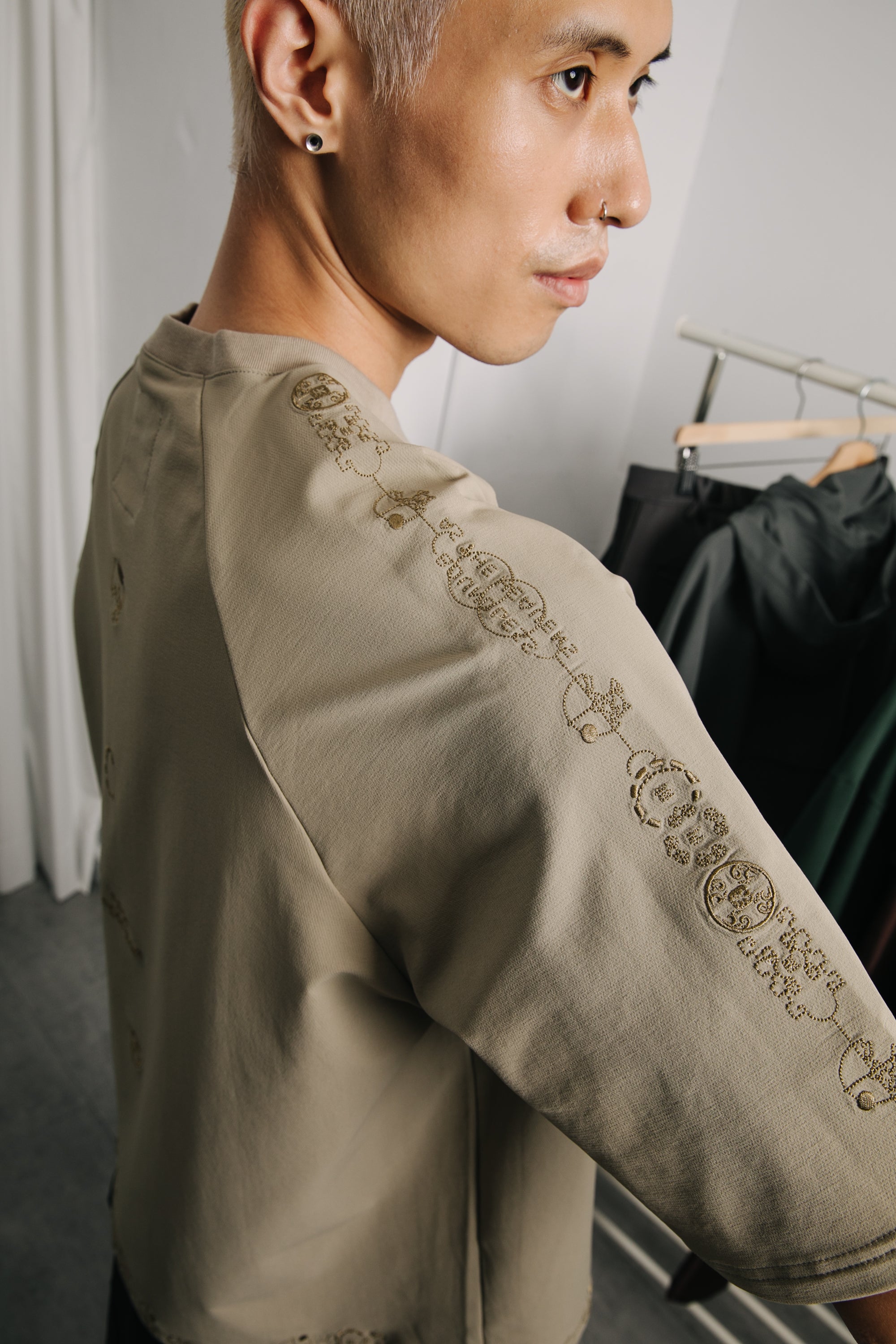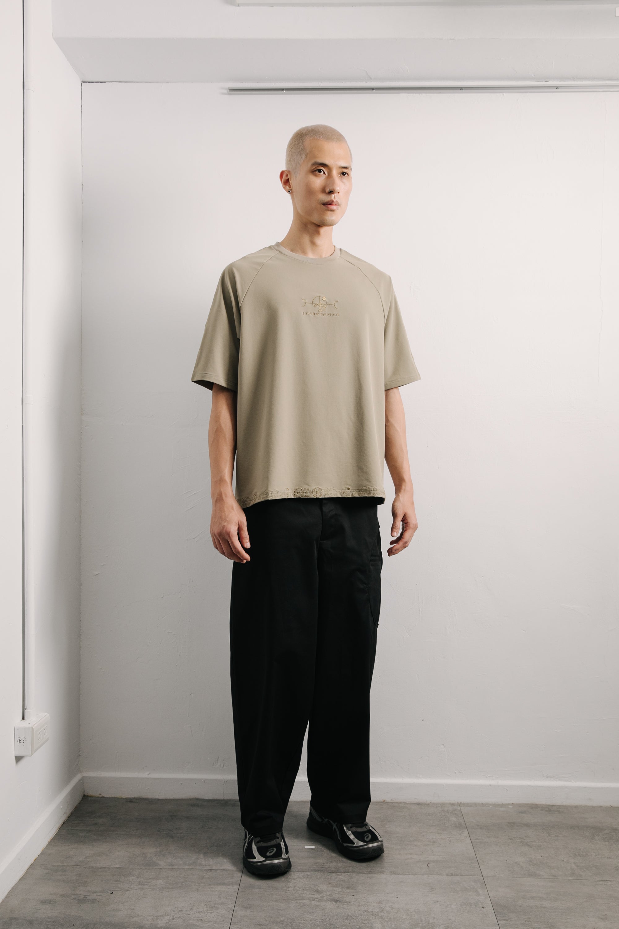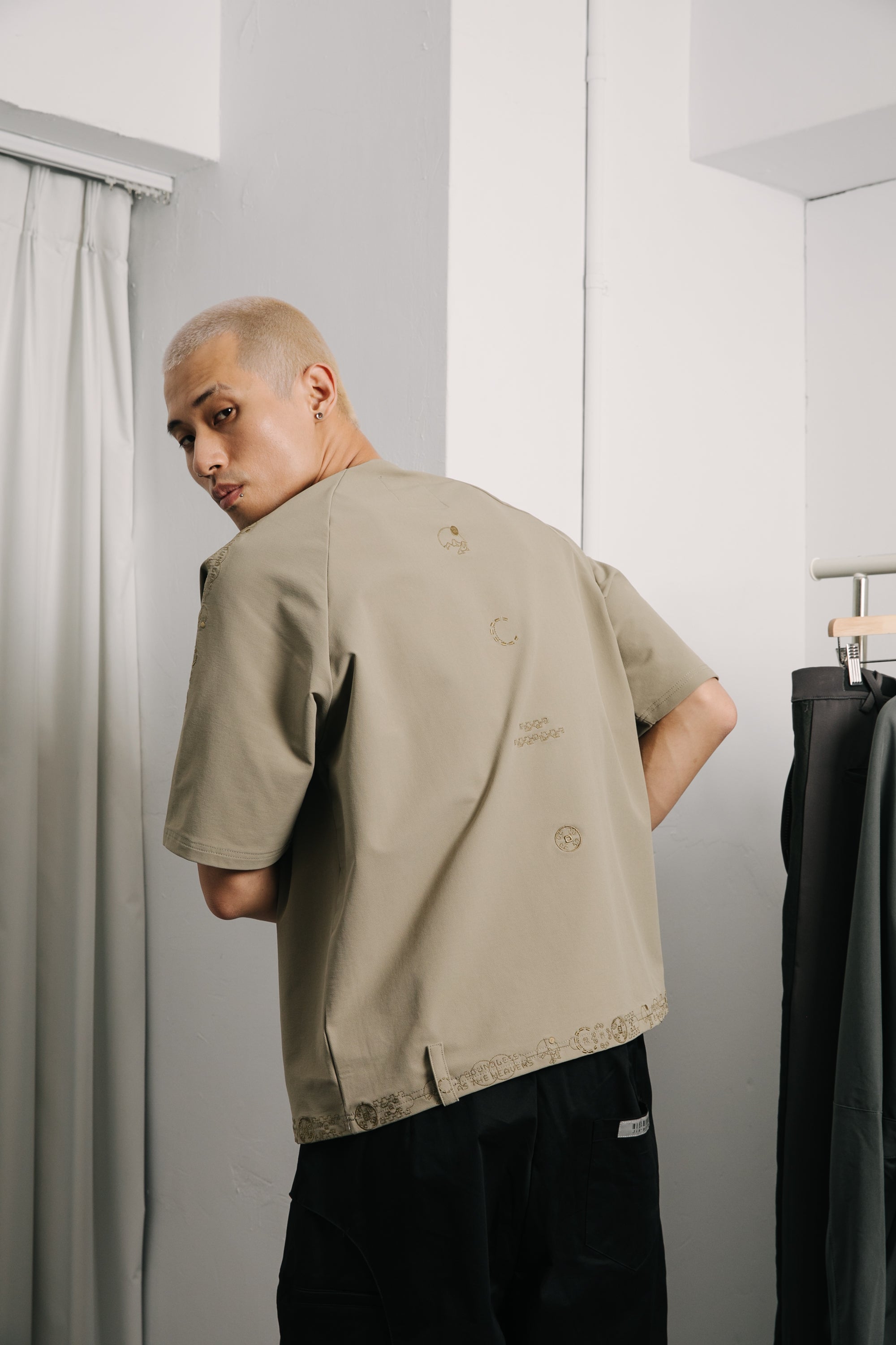 本款以“天圓無界”為靈感,將方與圓的傳統東方哲學延伸至服裝結構之中。透過 JINEASTERNAU 擅長的尼龍面料與電繡語彙,打造出這款拉克蘭袖短上衣,整體剪裁呈現更自然的線條流動。
