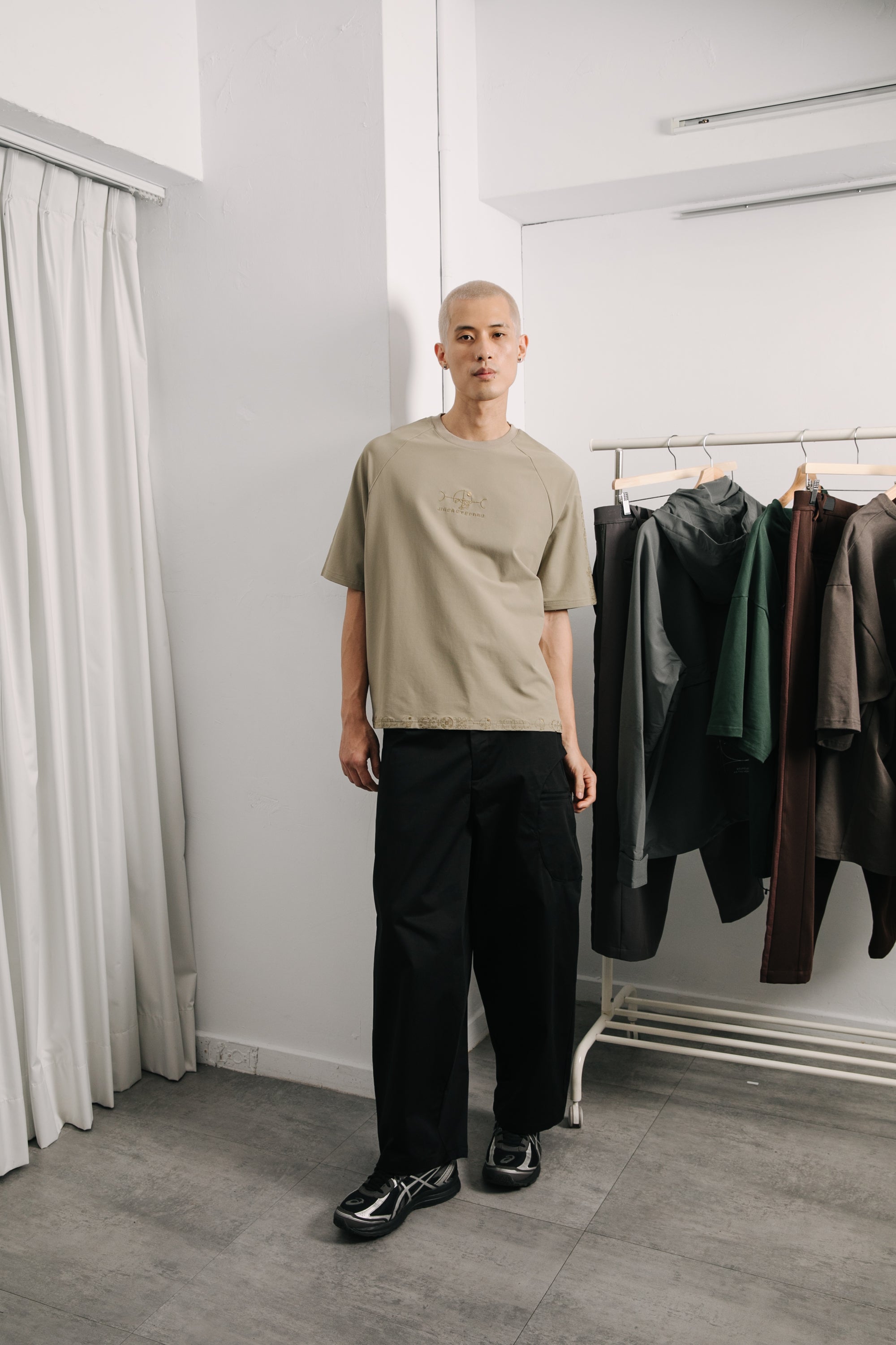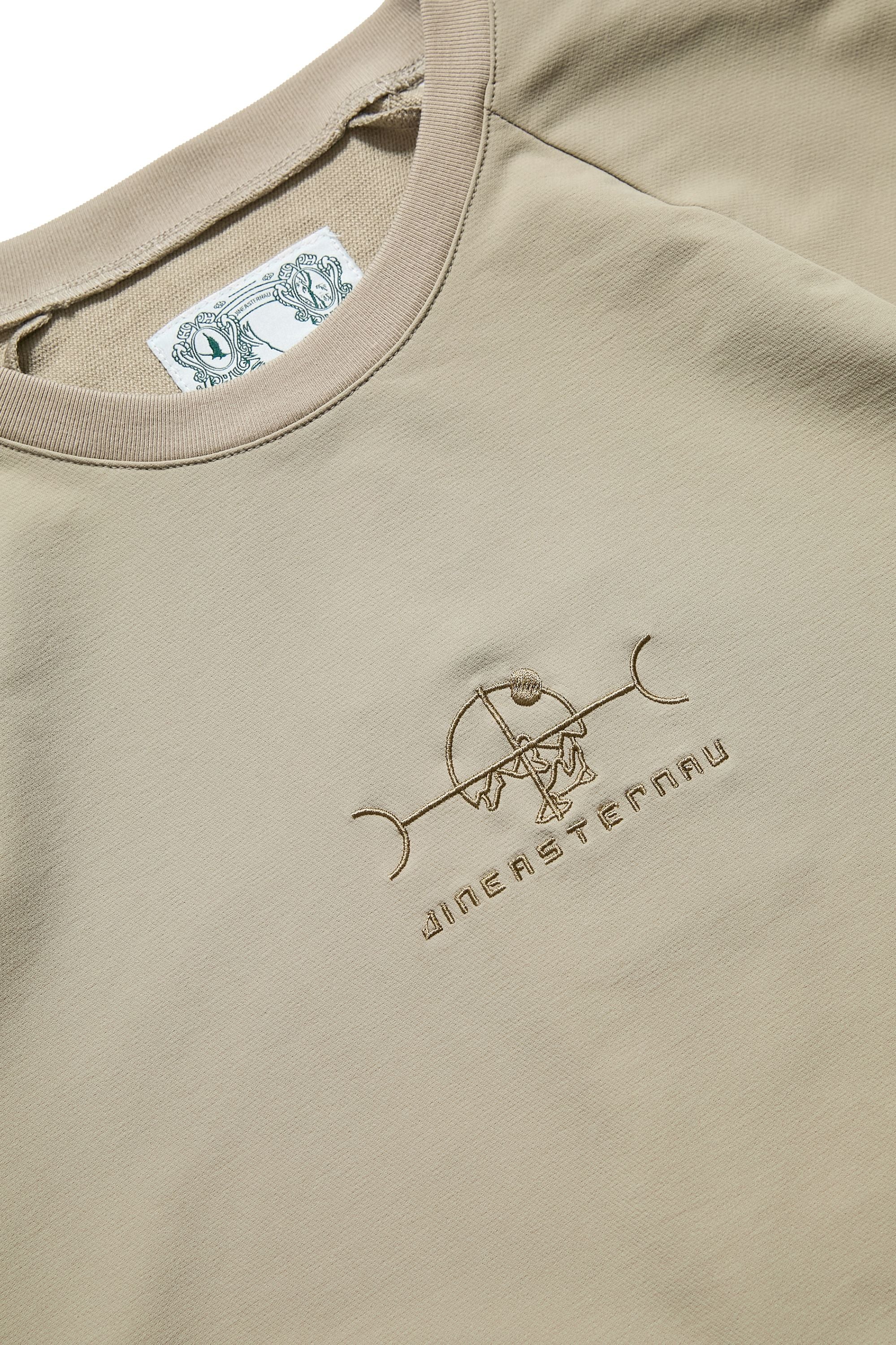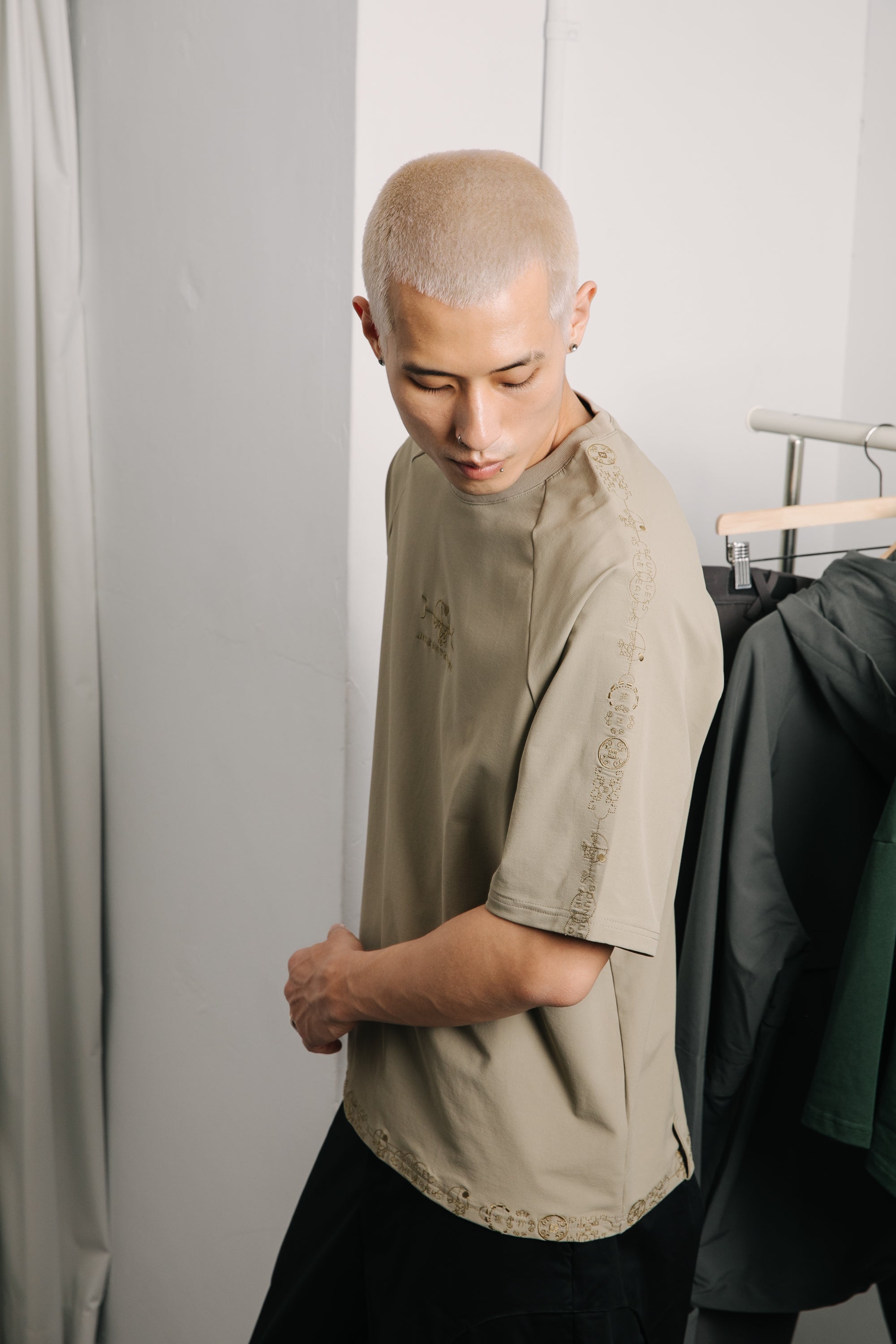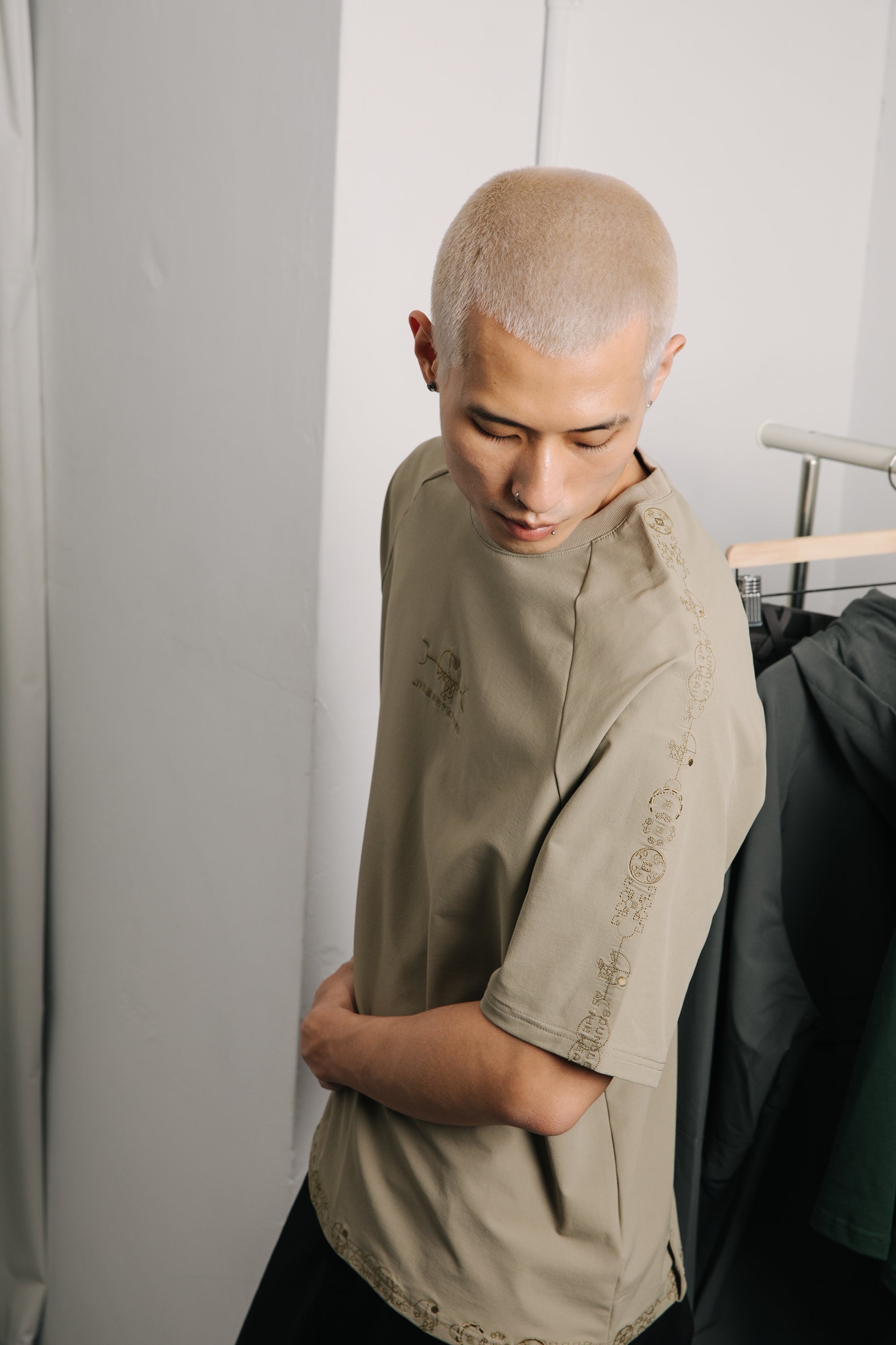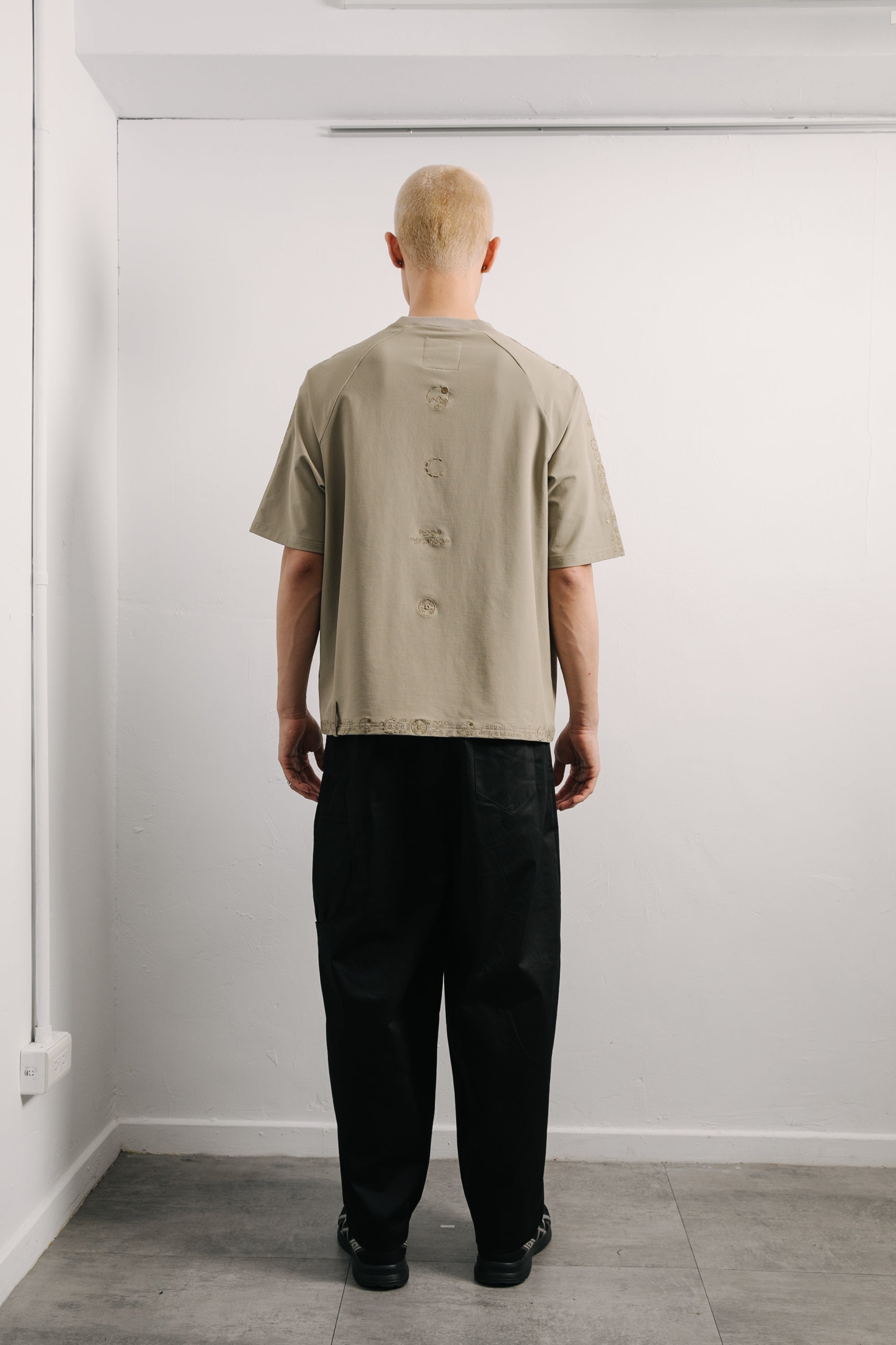 本款以“天圓無界”為靈感,將方與圓的傳統東方哲學延伸至服裝結構之中。透過 JINEASTERNAU 擅長的尼龍面料與電繡語彙,打造出這款拉克蘭袖短上衣,整體剪裁呈現更自然的線條流動。