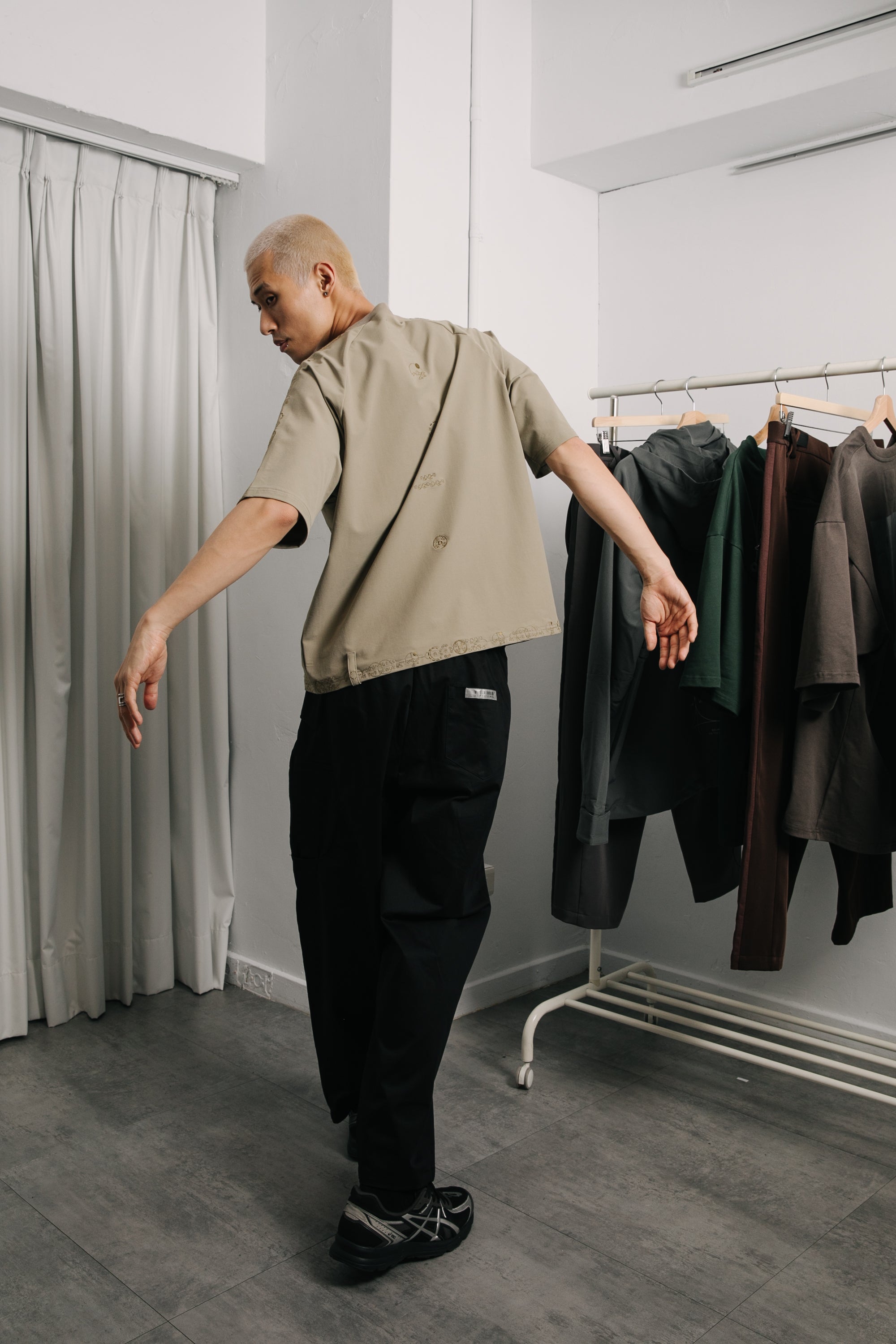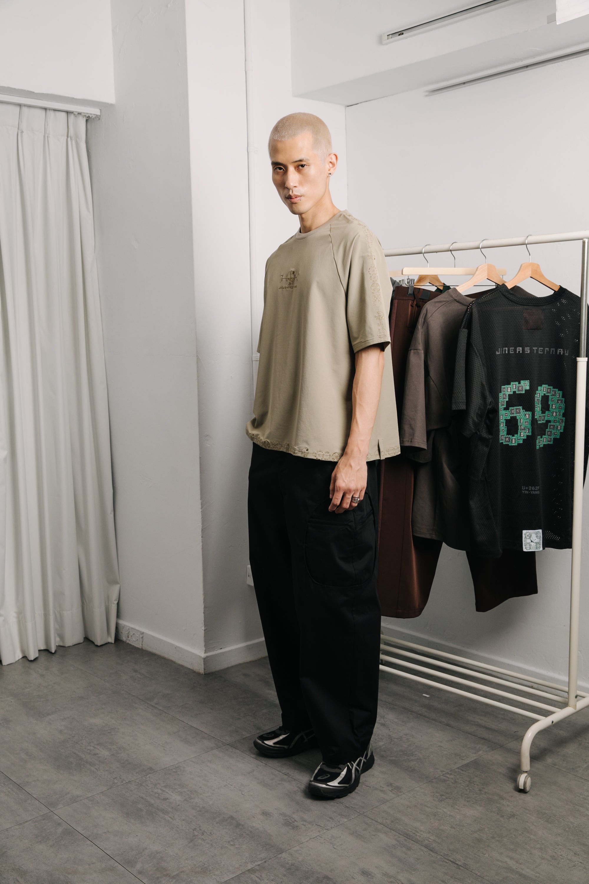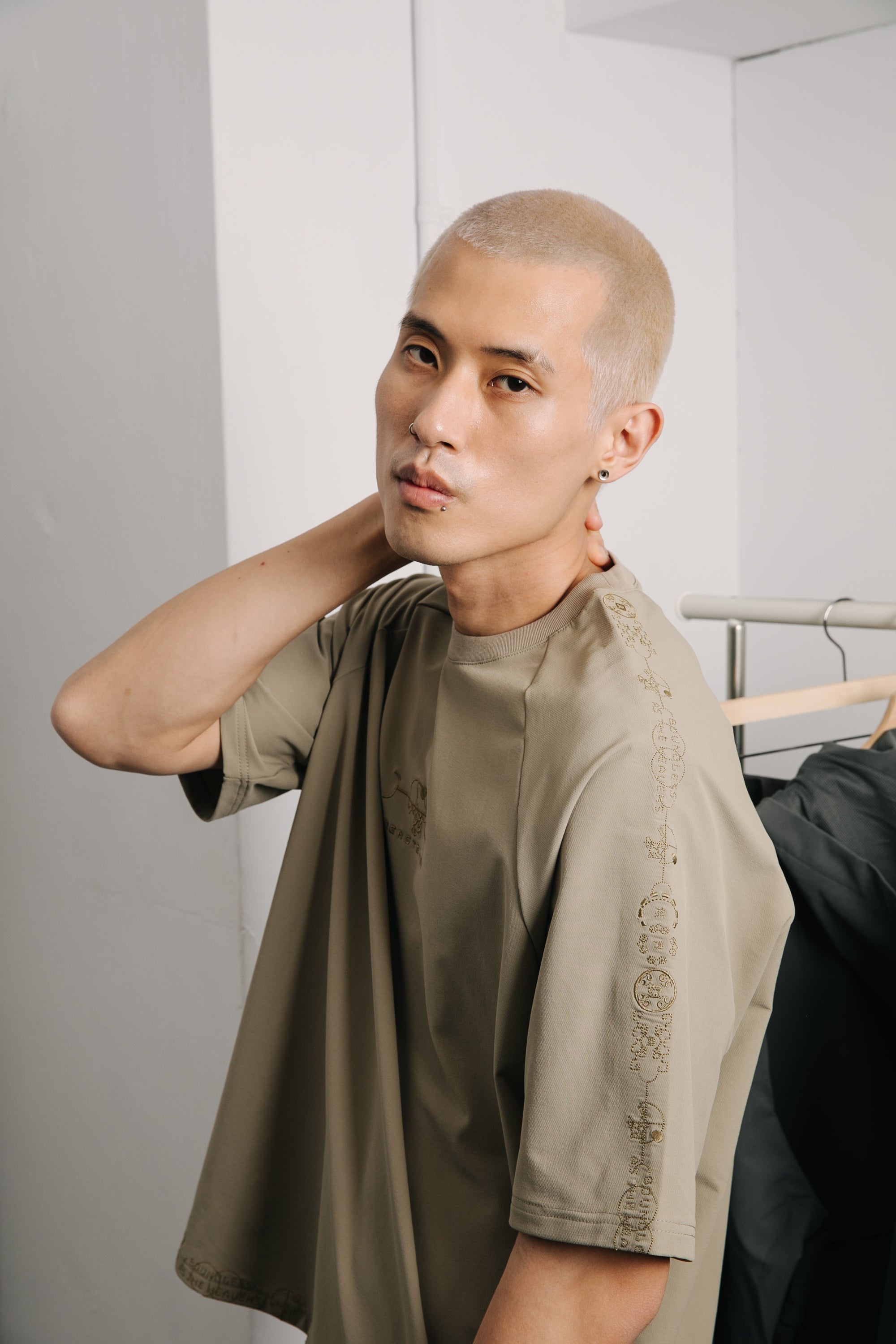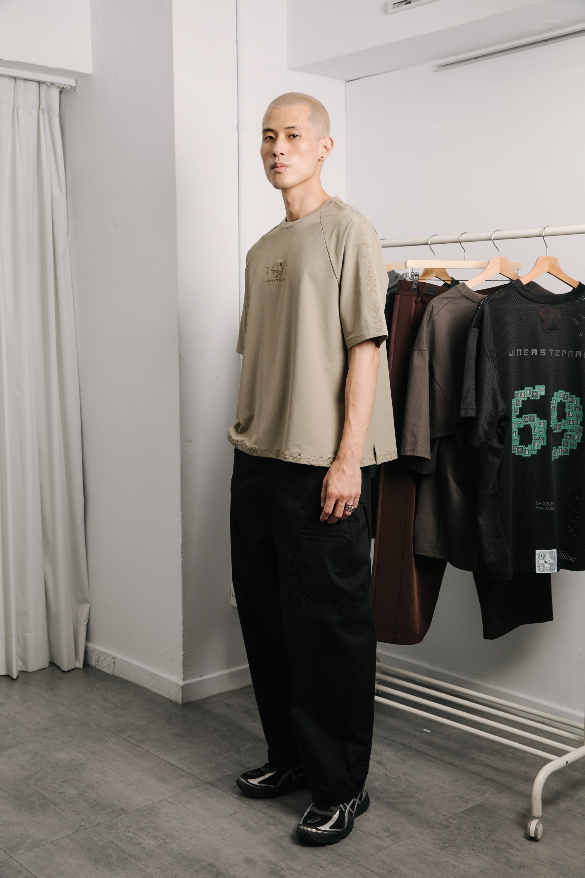 本款以“天圓無界”為靈感,將方與圓的傳統東方哲學延伸至服裝結構之中。透過 JINEASTERNAU 擅長的尼龍面料與電繡語彙,打造出這款拉克蘭袖短上衣,整體剪裁呈現更自然的線條流動。