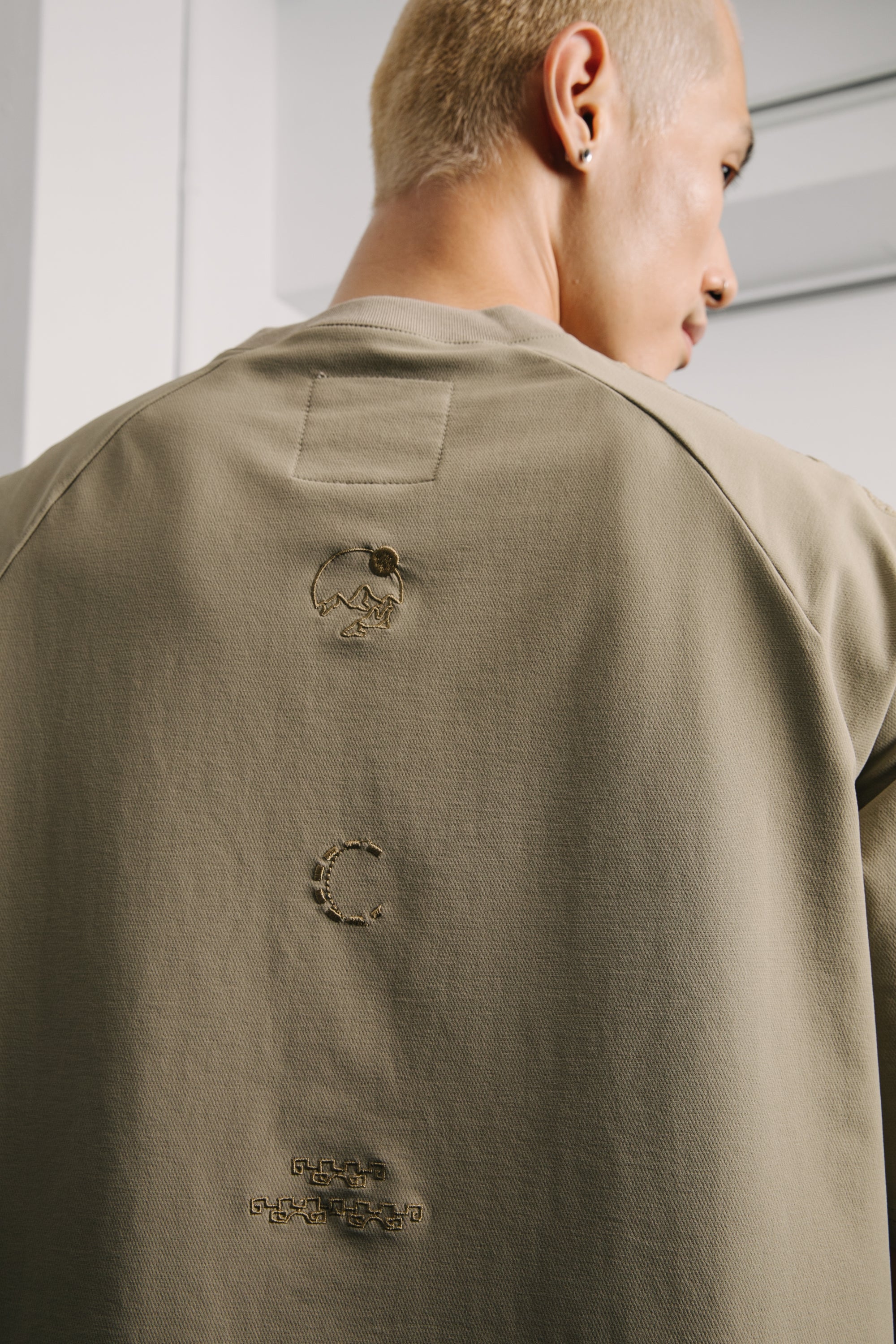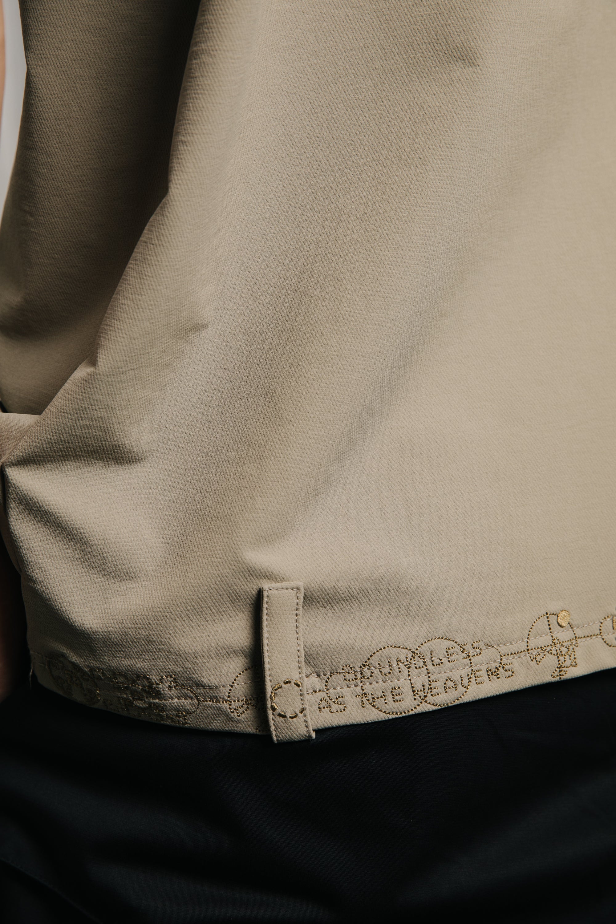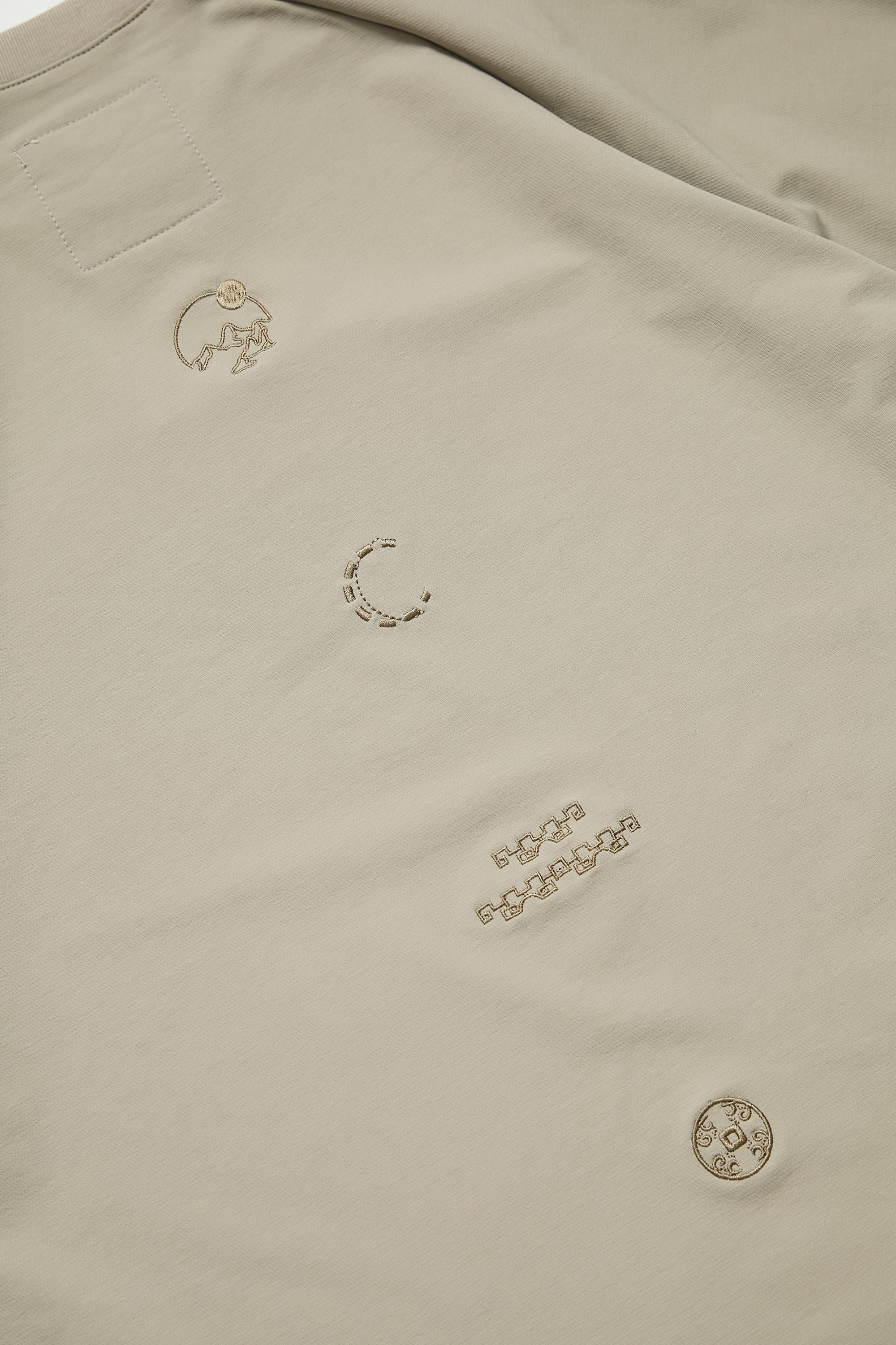 衣身採用輕量高密度尼龍布料,手感滑順、質地舒適。胸前與肩部以同色電繡隱藏本季的核心圖騰,背部則以象徵本季「天圓無界」的圖像低調呈現,內斂卻處處藏有細節張力。