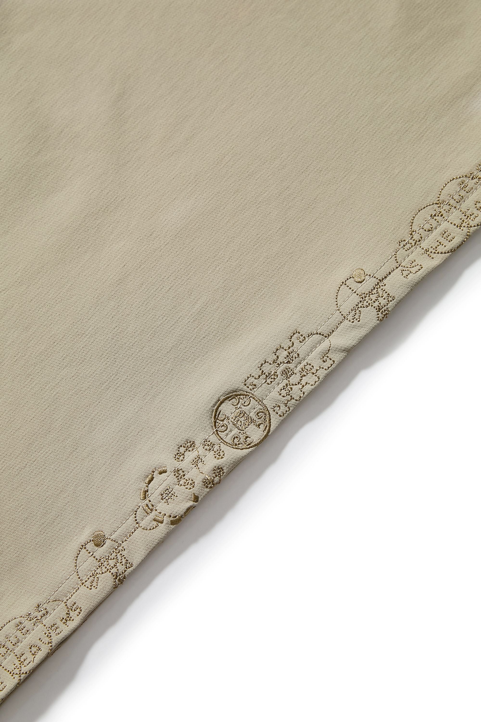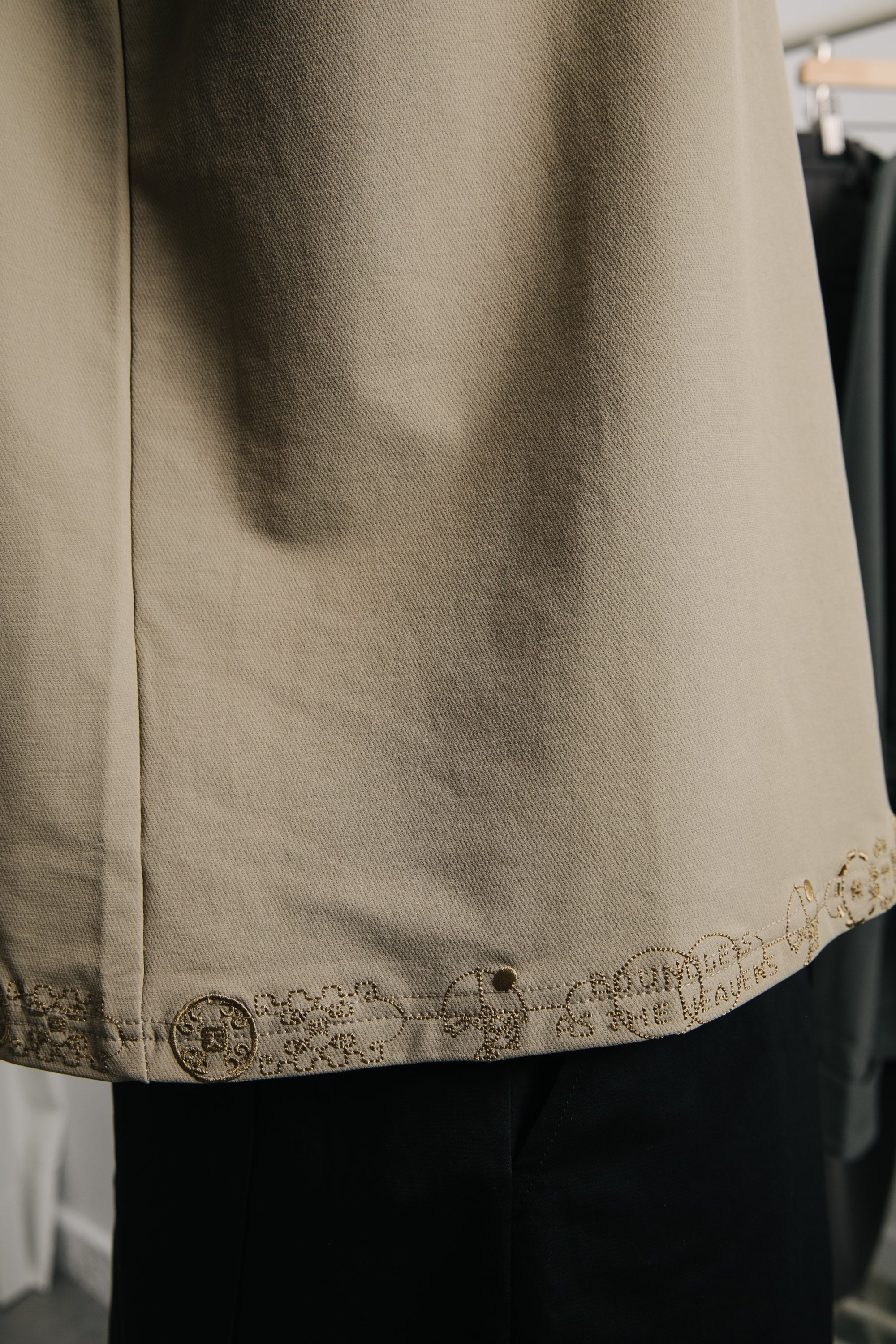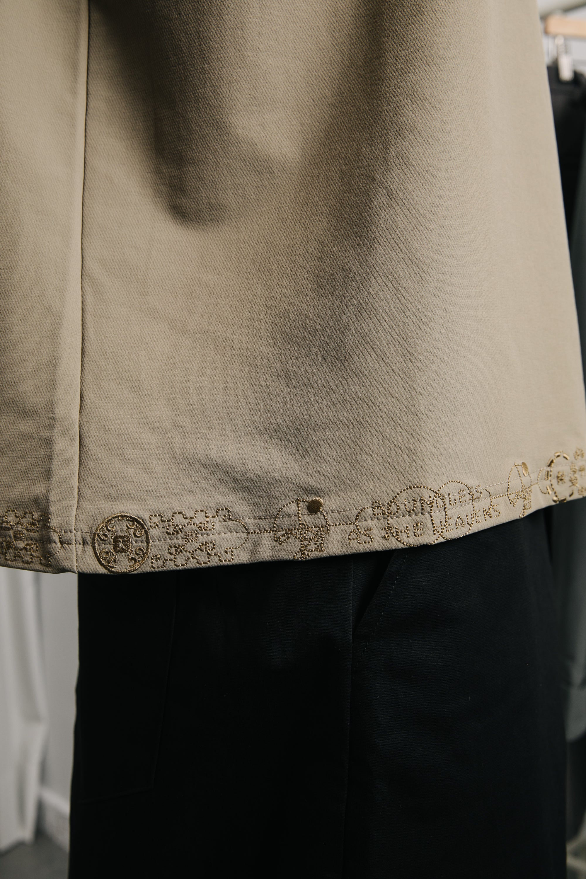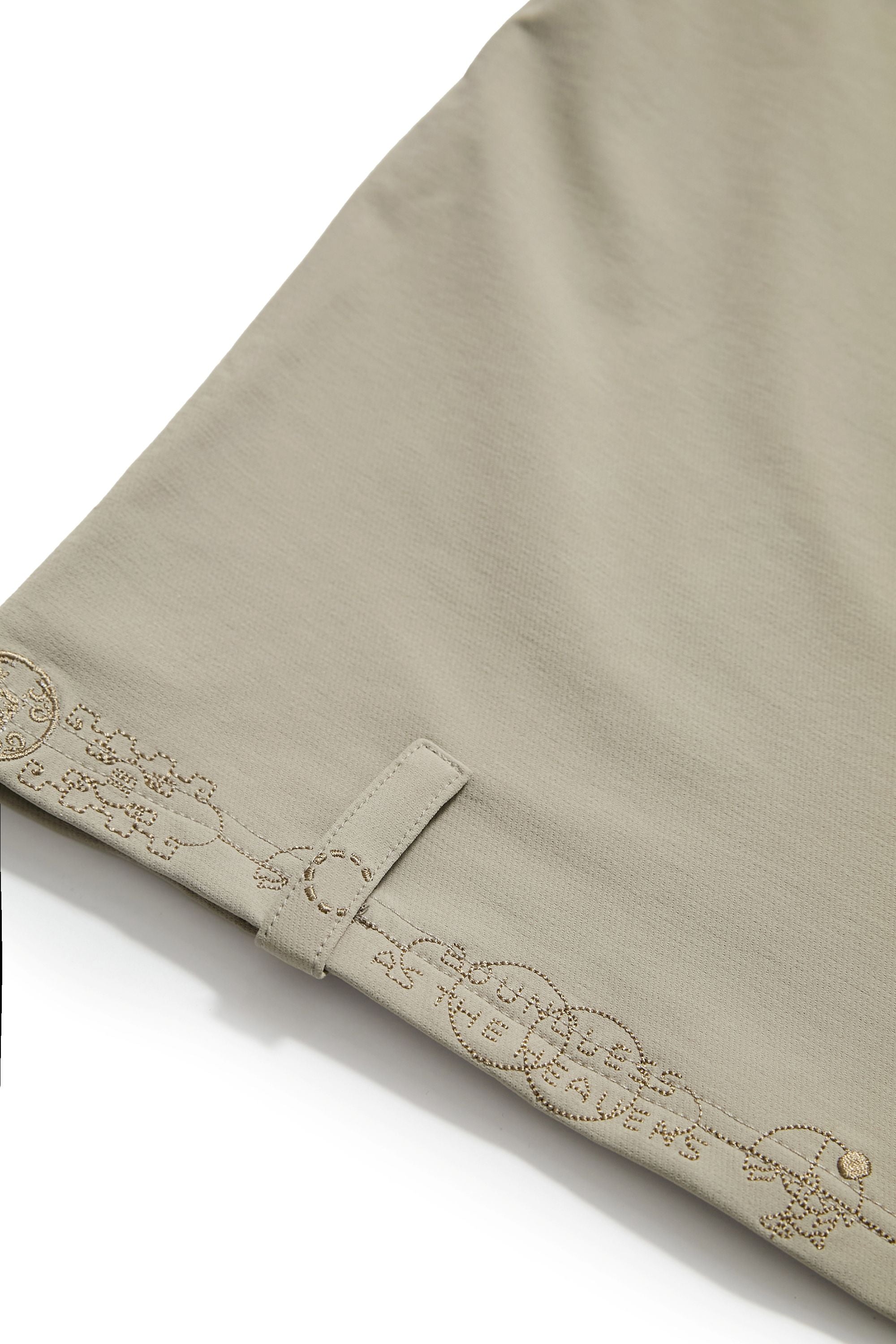 衣身採用輕量高密度尼龍布料,手感滑順、質地舒適。胸前與肩部以同色電繡隱藏本季的核心圖騰,背部則以象徵本季「天圓無界」的圖像低調呈現,內斂卻處處藏有細節張力。