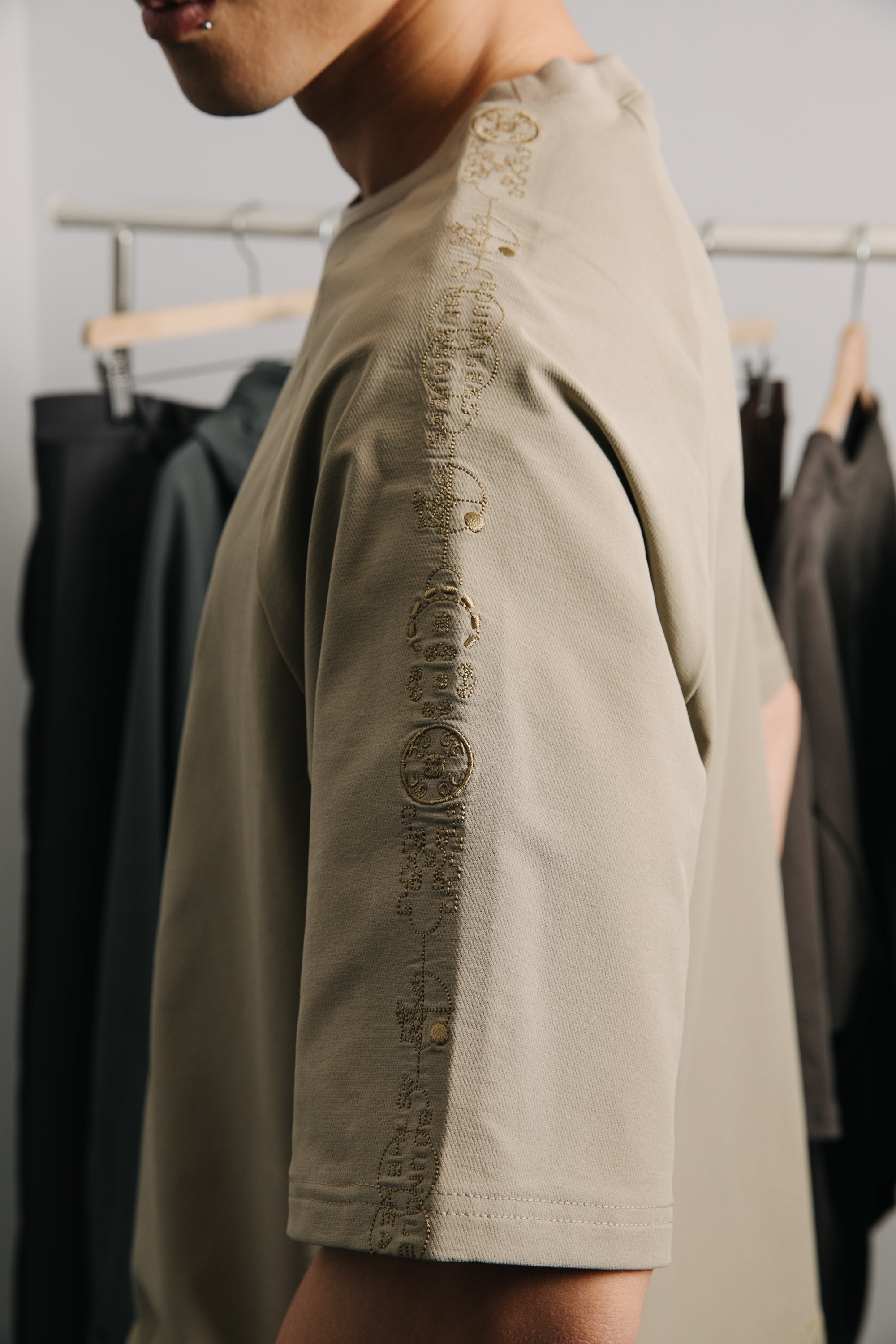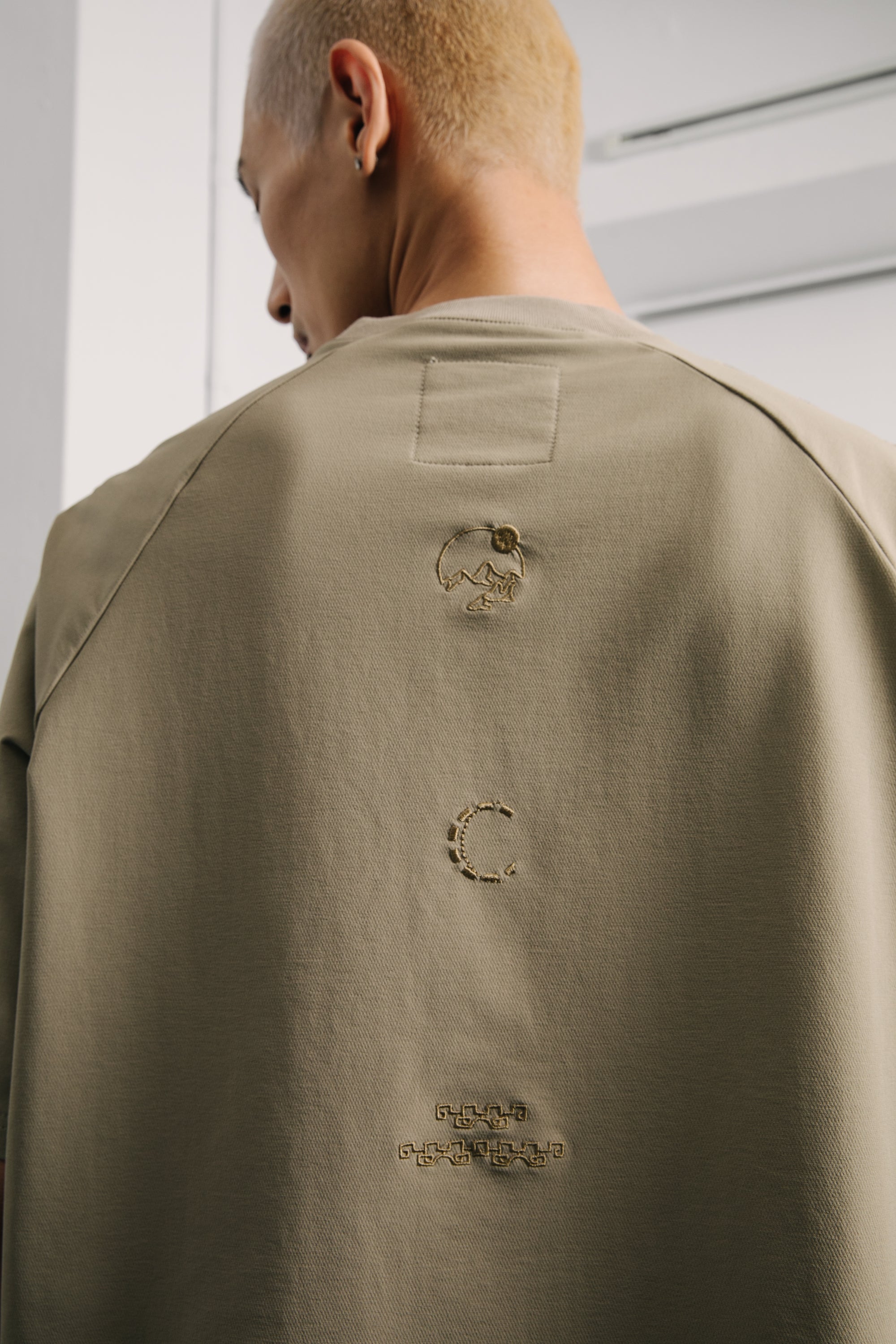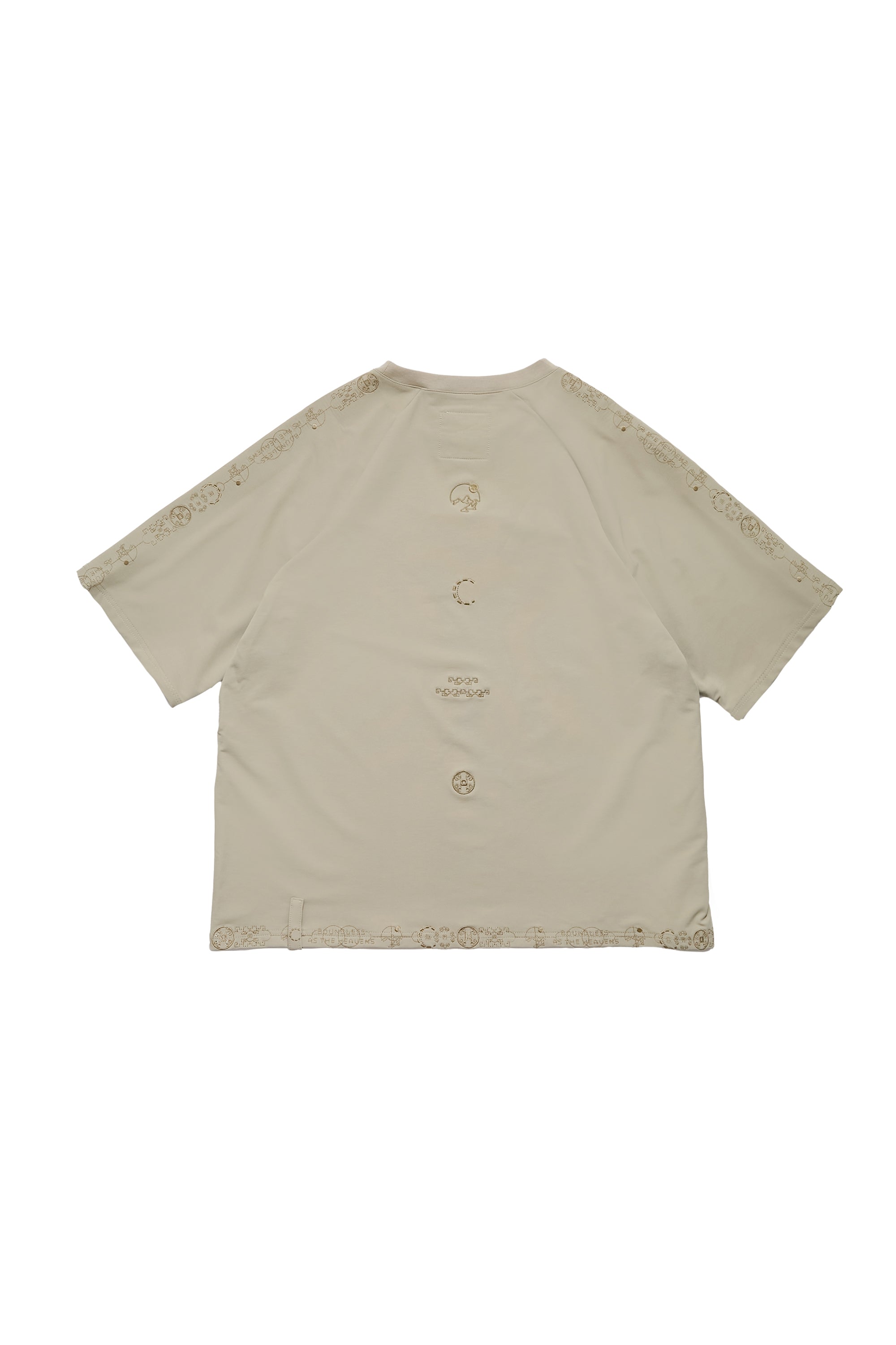 胸前、肩部與背部圖騰轉化自古代「天圓地方」的文化語彙,電繡以未來感方式重新詮釋無界的流動密碼。