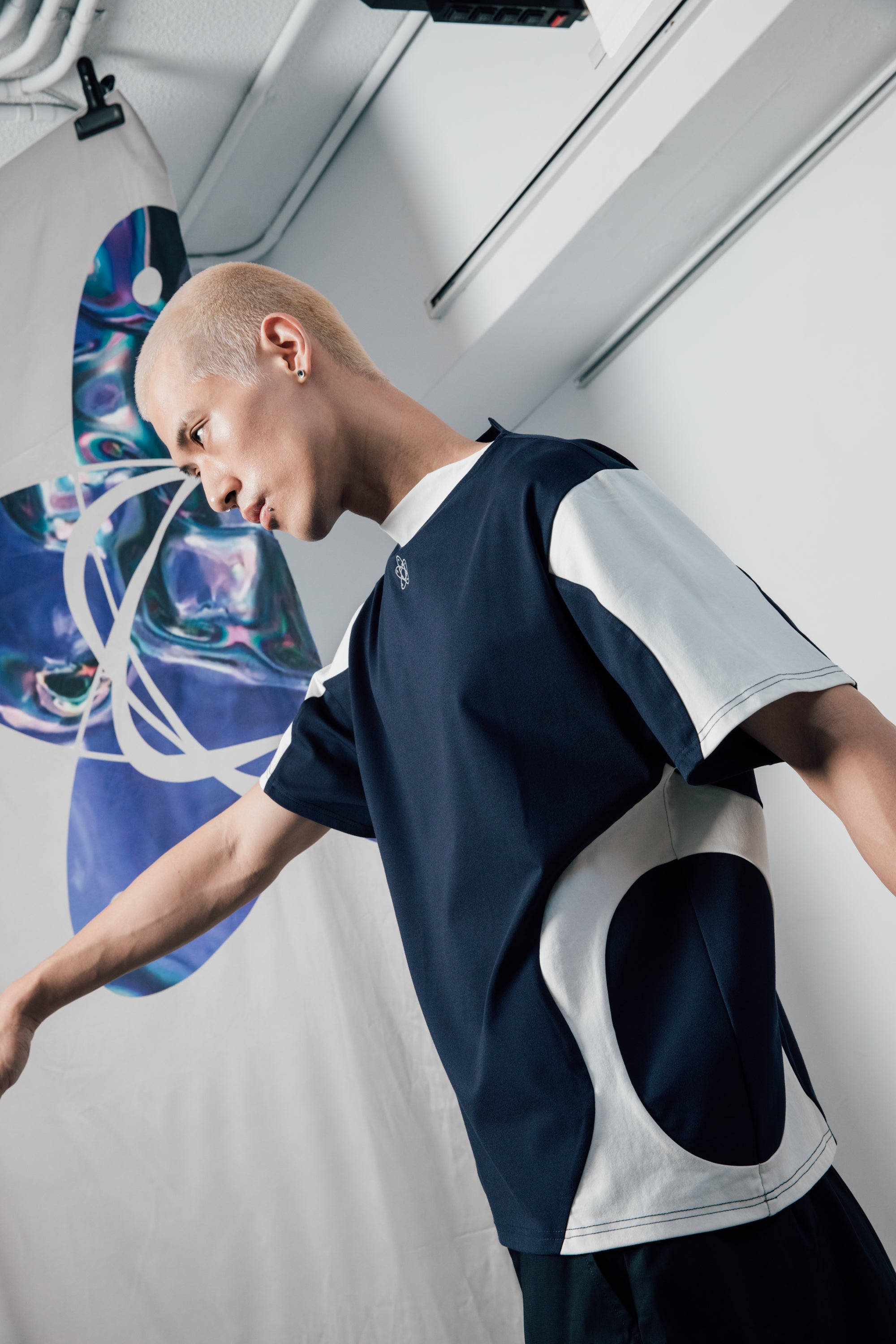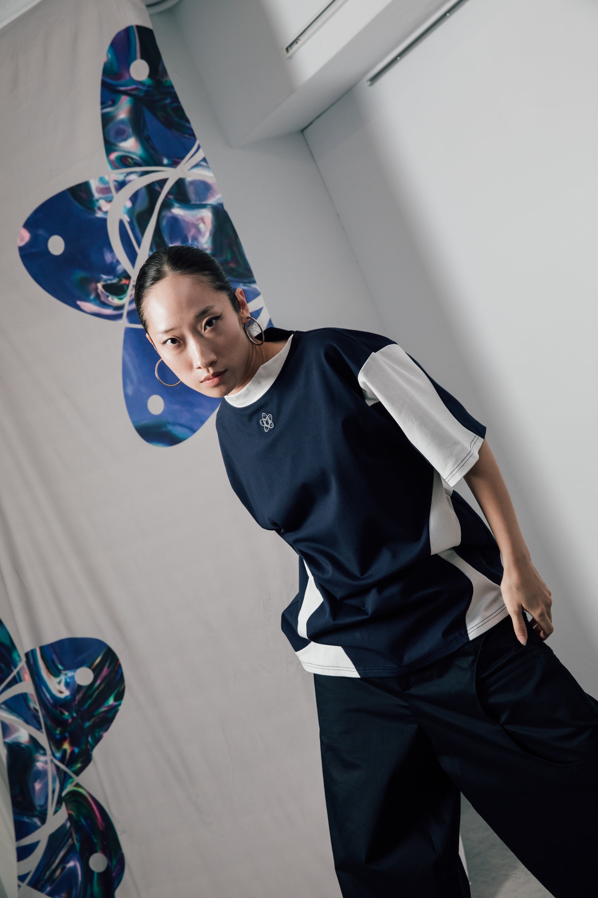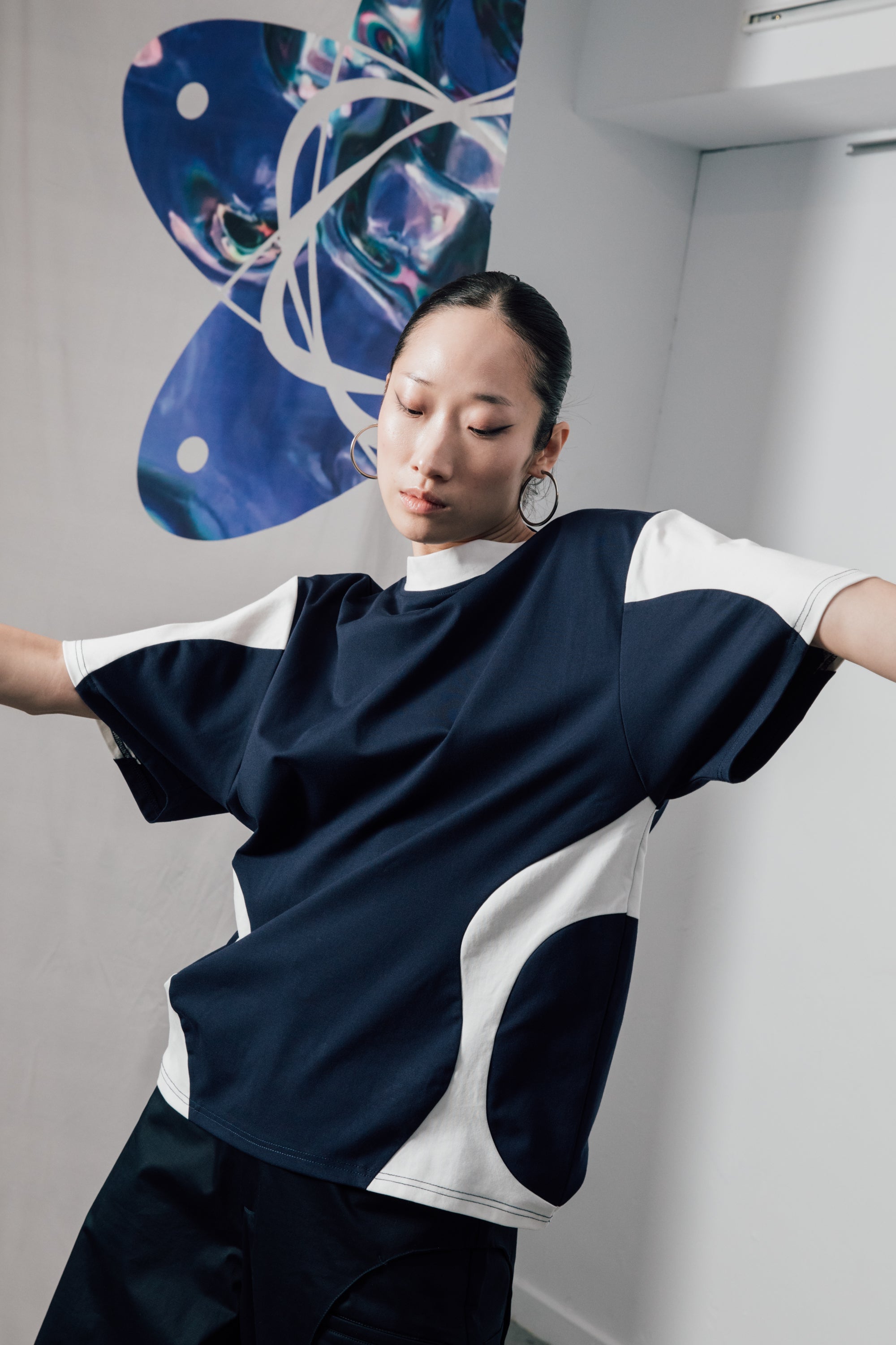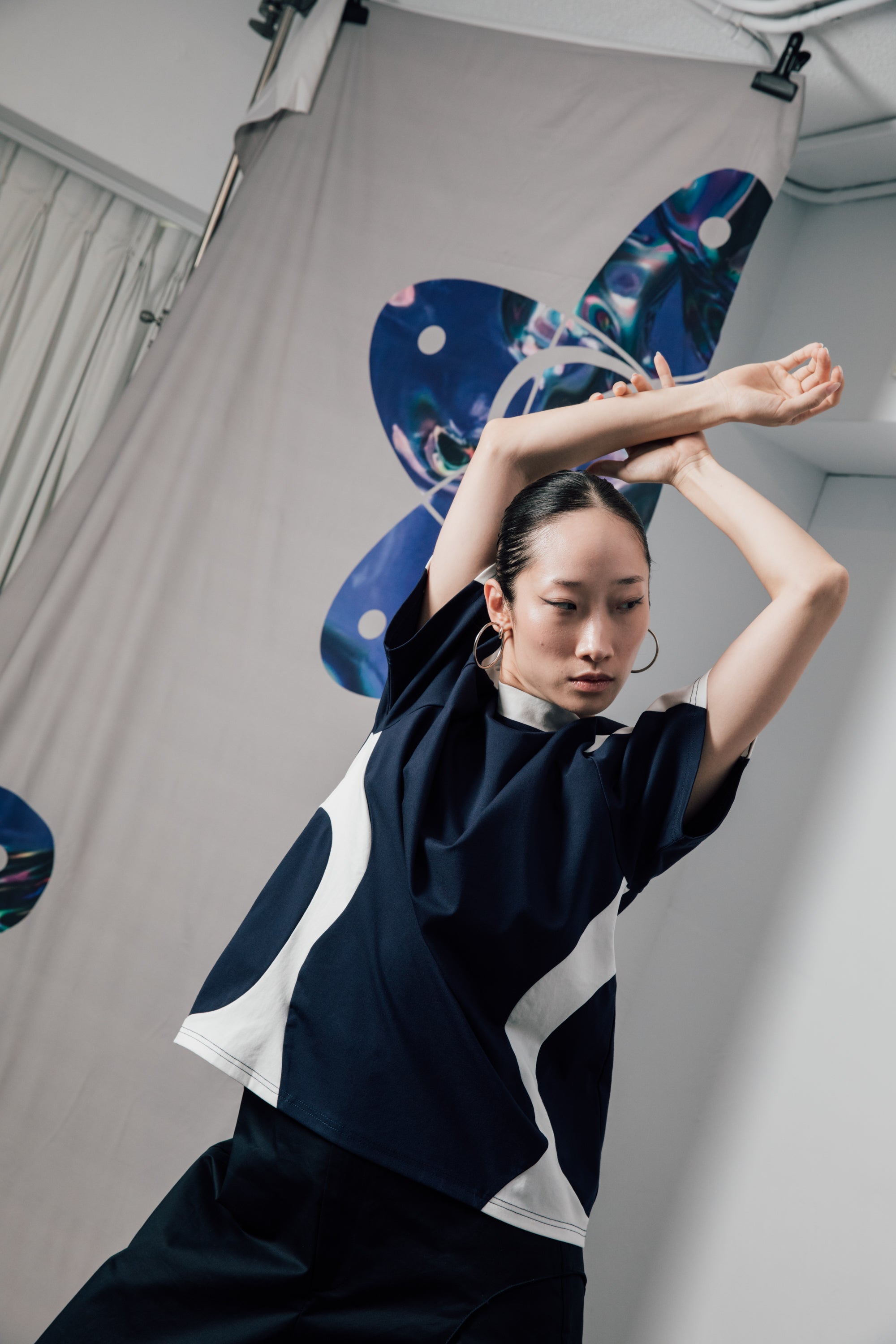 這件立領上衣結合未來感與東方想像,打破傳統T-shirt對稱的制式印象。領片設計融合梅花意象與解構手法,延伸出具有雕塑感的輪廓,修飾頸部線條的同時,重新思考衣服上身後的視覺感,是一件柔中帶剛、個性明確的上衣單品。