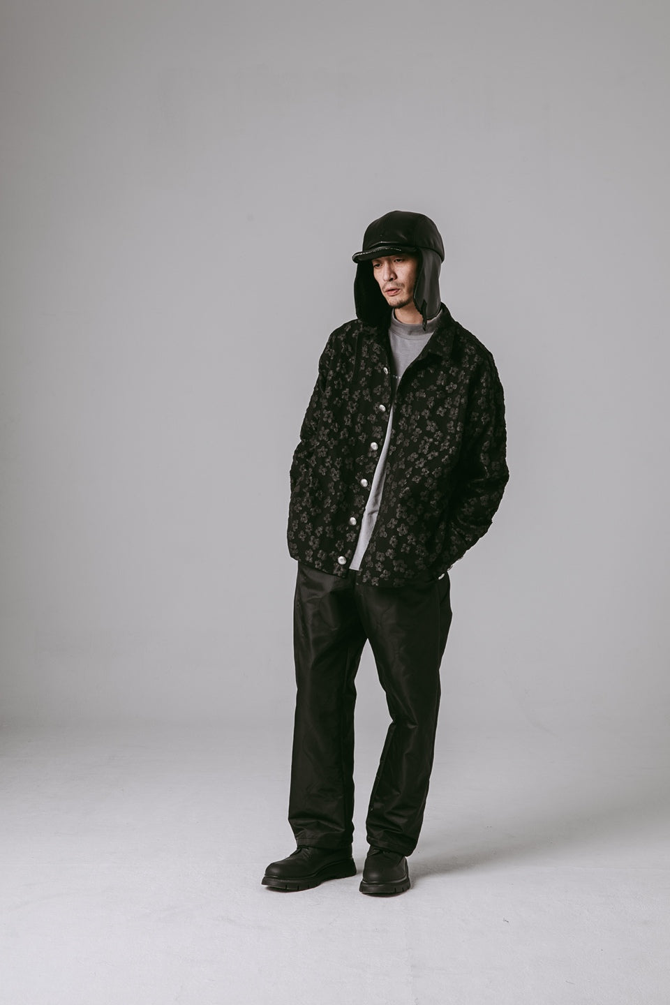 全黑基底象徵沉靜的火種,布面以滿版緹花工藝構築出細膩花紋,透過浮雕般的紋理與光影變化,呈現燃界主題下的「暗燃」意象。