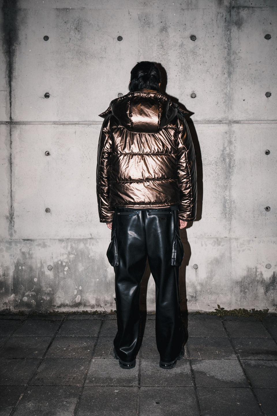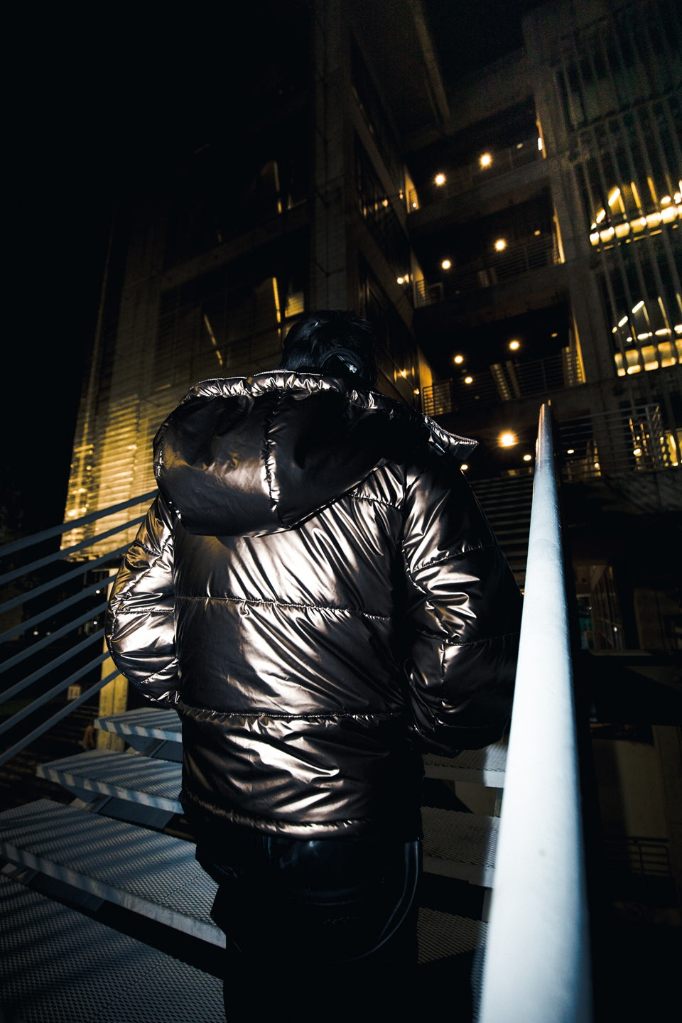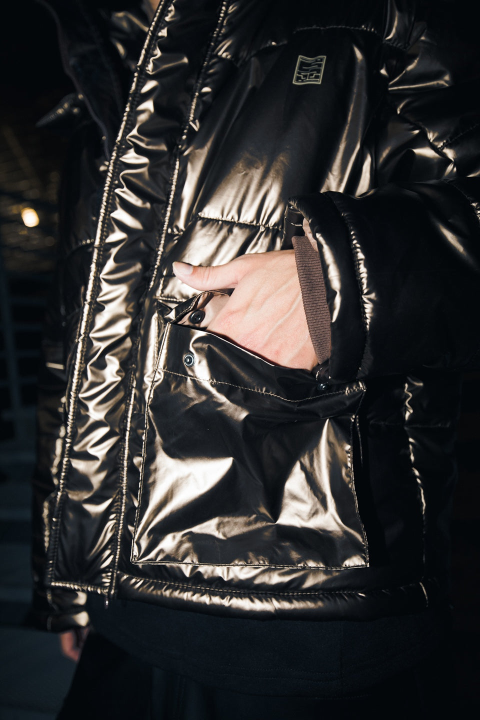 外層選用具金屬光澤的高密度聚酯纖維面料,映照出如火焰在金屬表面流動的光感。內部則是鋪棉厚實飽滿,帶來強效保暖性能,