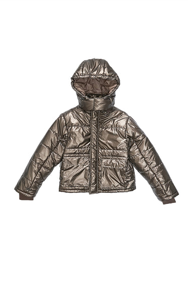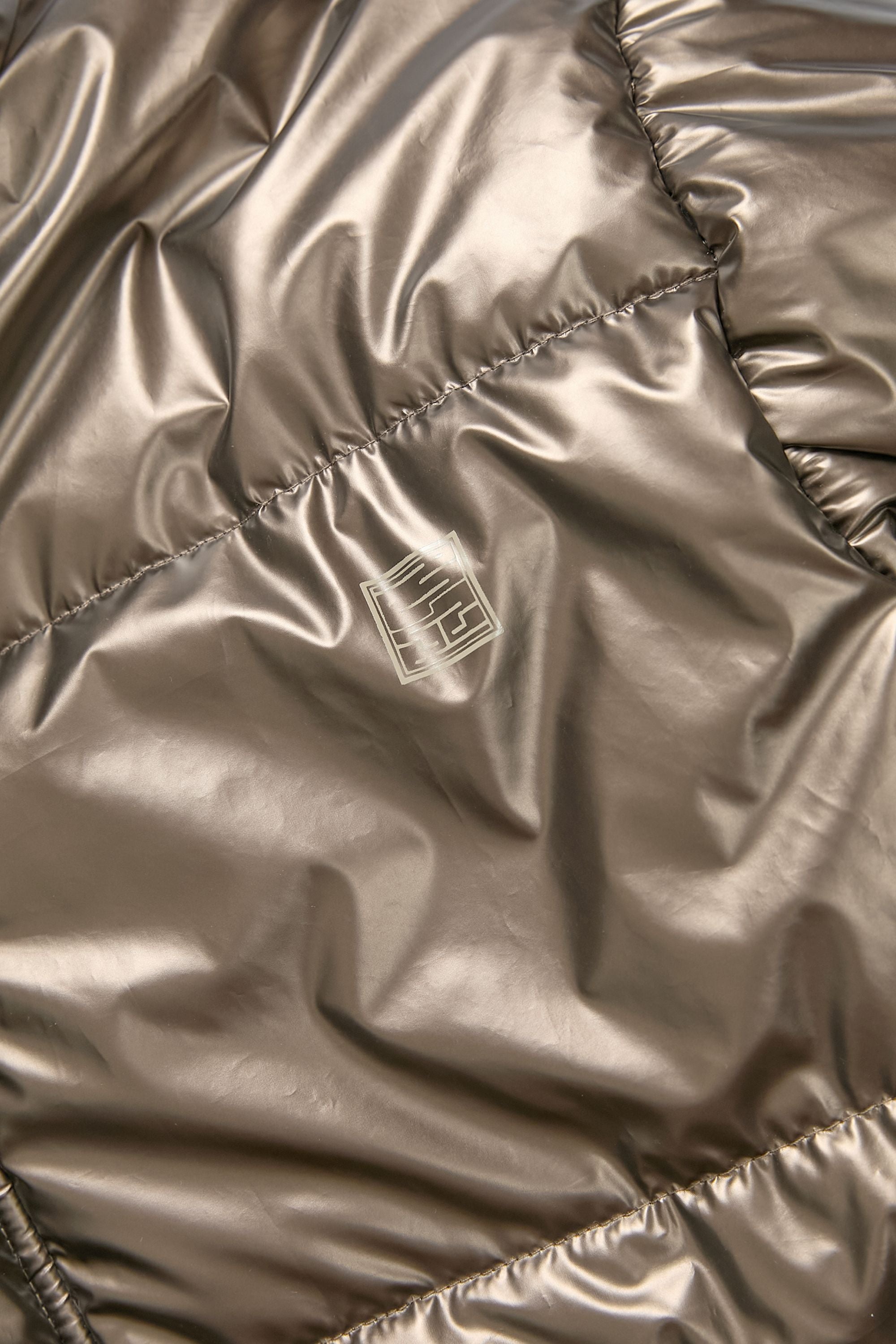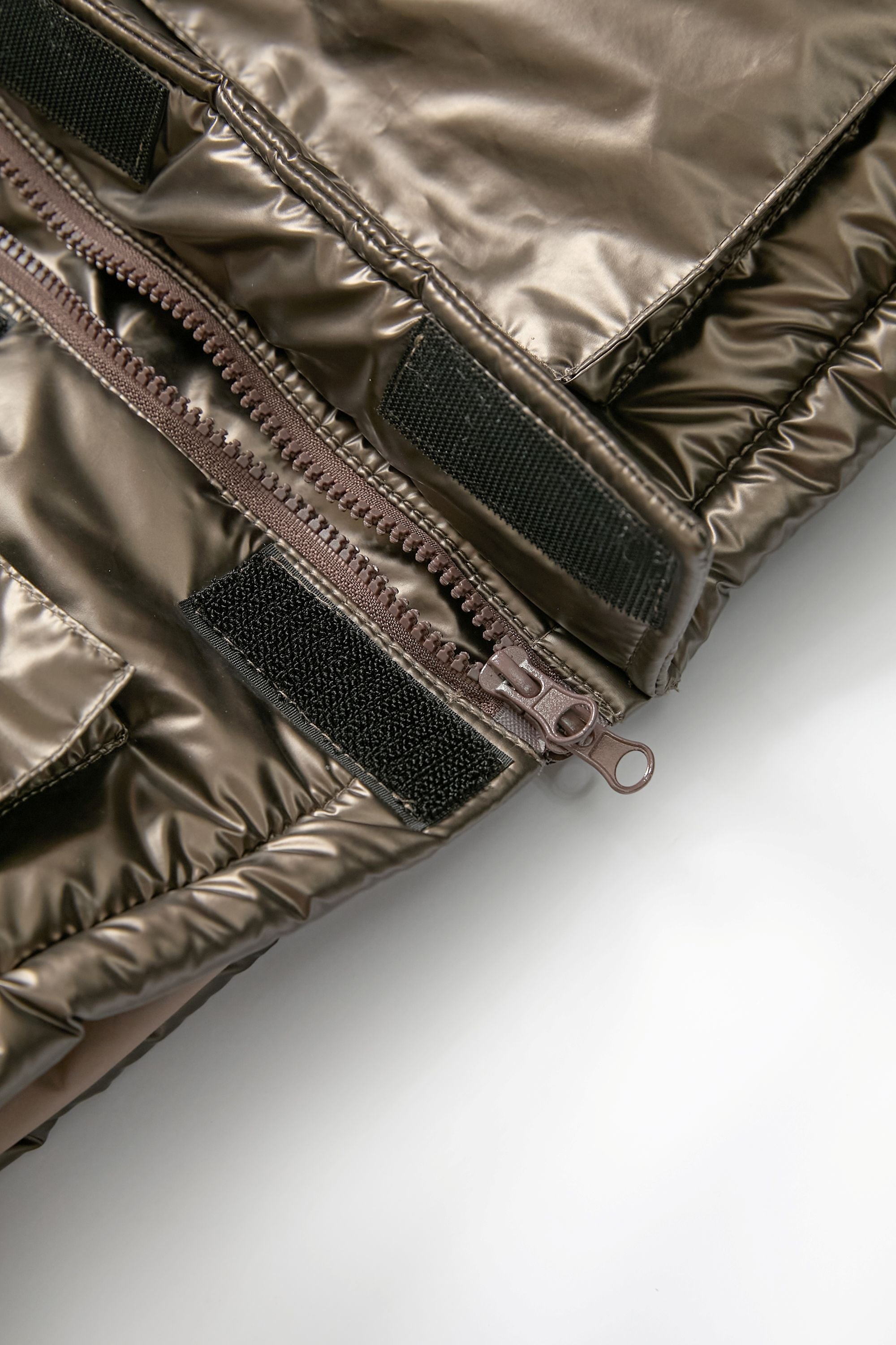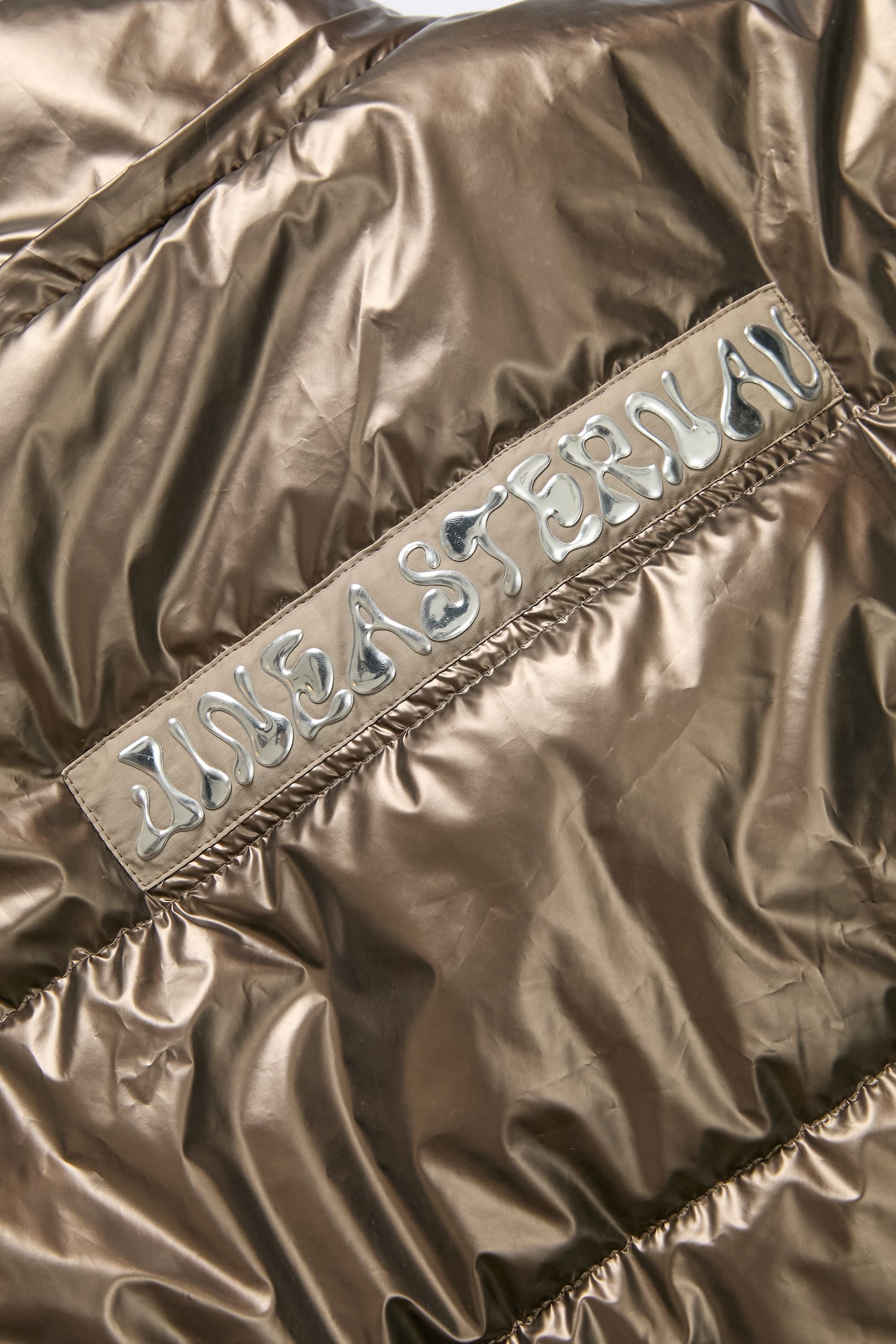 外層選用具金屬光澤的高密度聚酯纖維面料,映照出如火焰在金屬表面流動的光感。內部則是鋪棉厚實飽滿,帶來強效保暖性能,