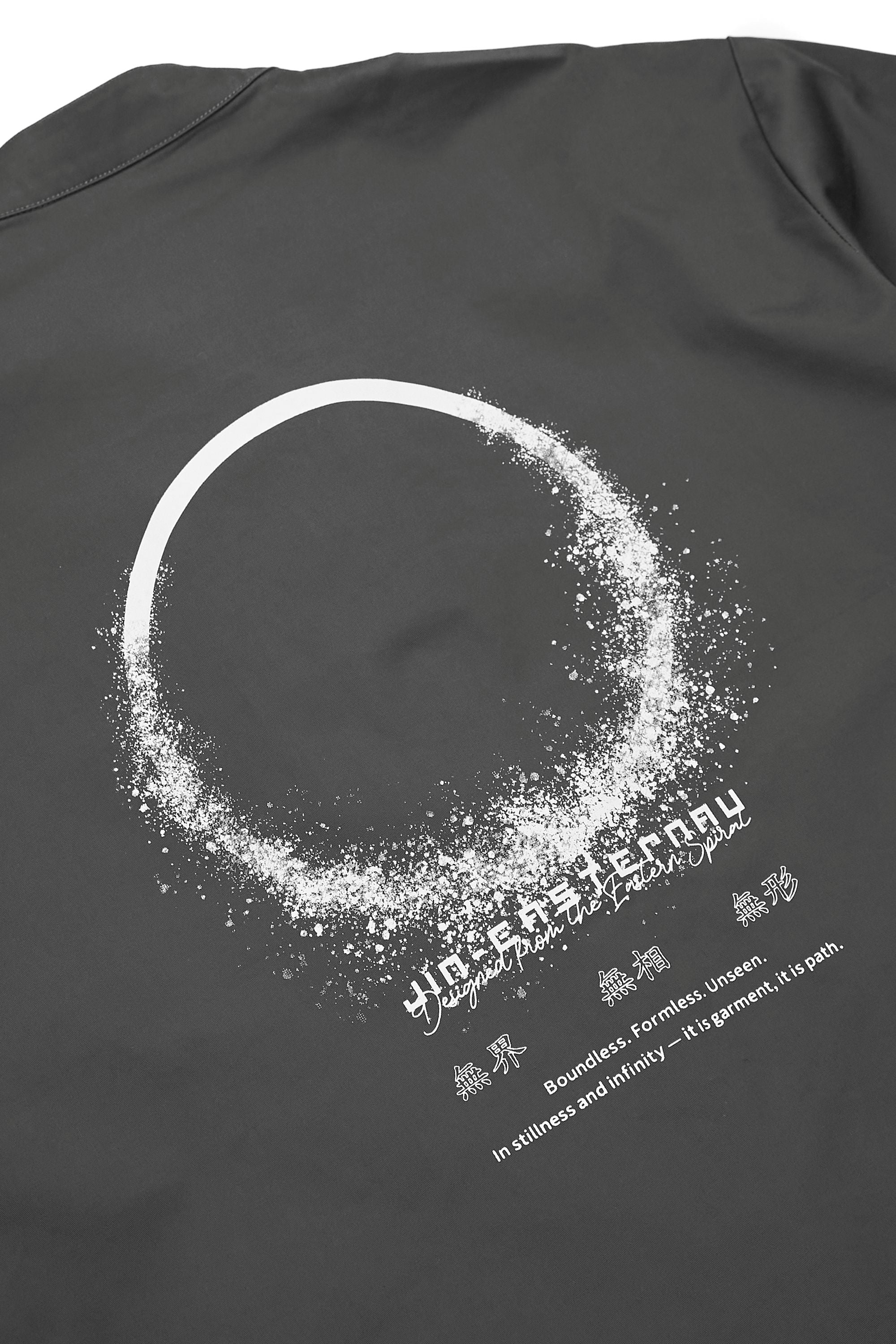 背後的圓形圖像,從虛到實、由淡入深,象徵佛學中的「無界、無相、無形」——超越形體與邊界,回歸純粹與空寂。