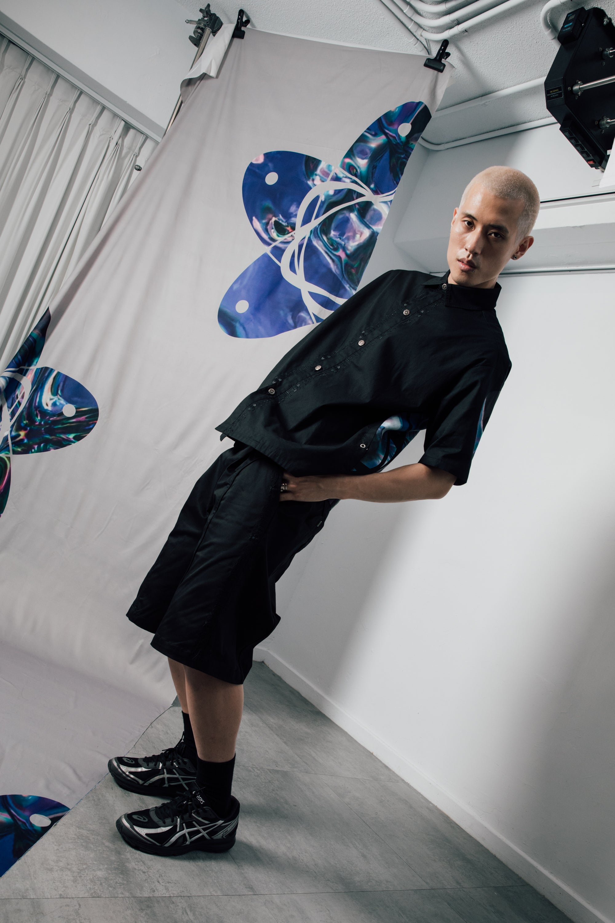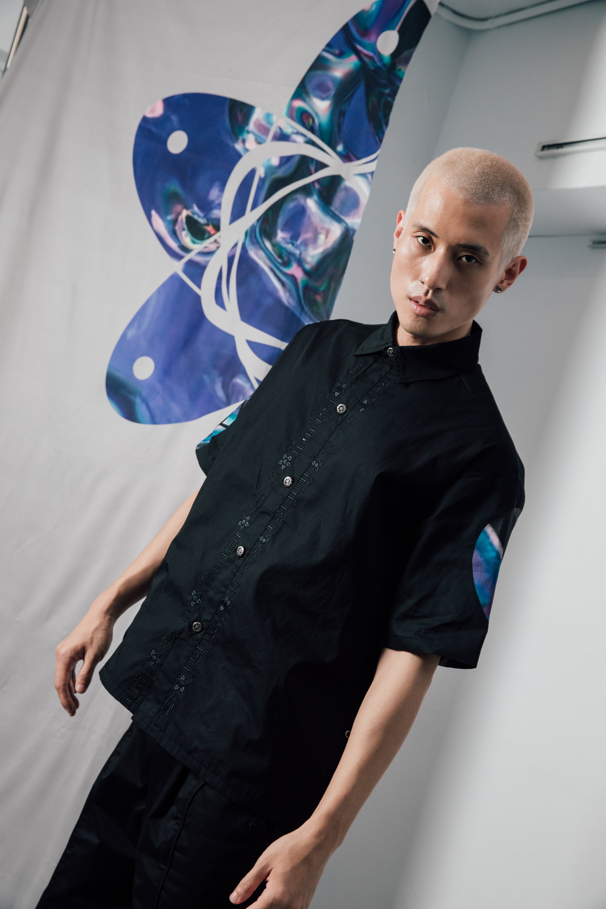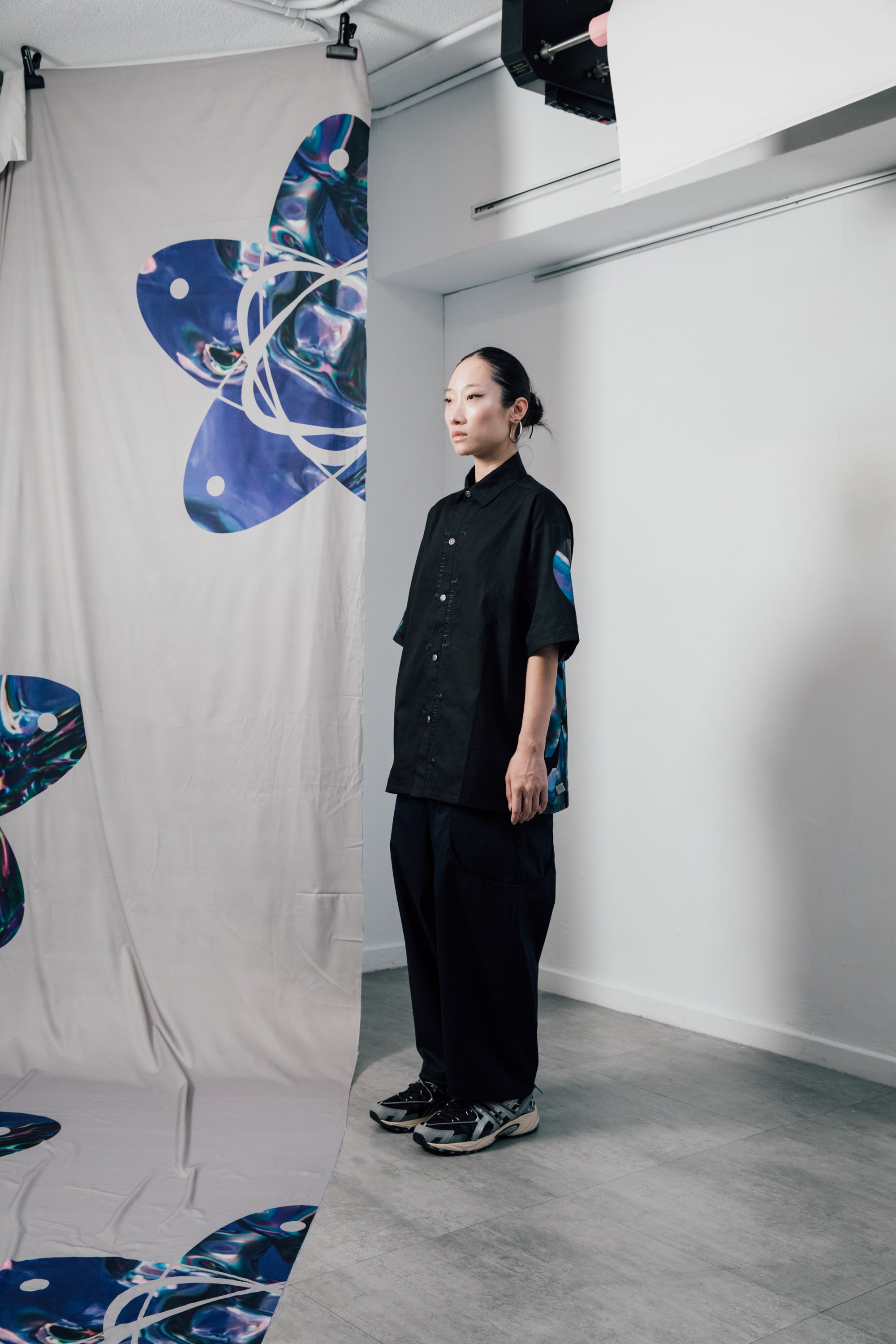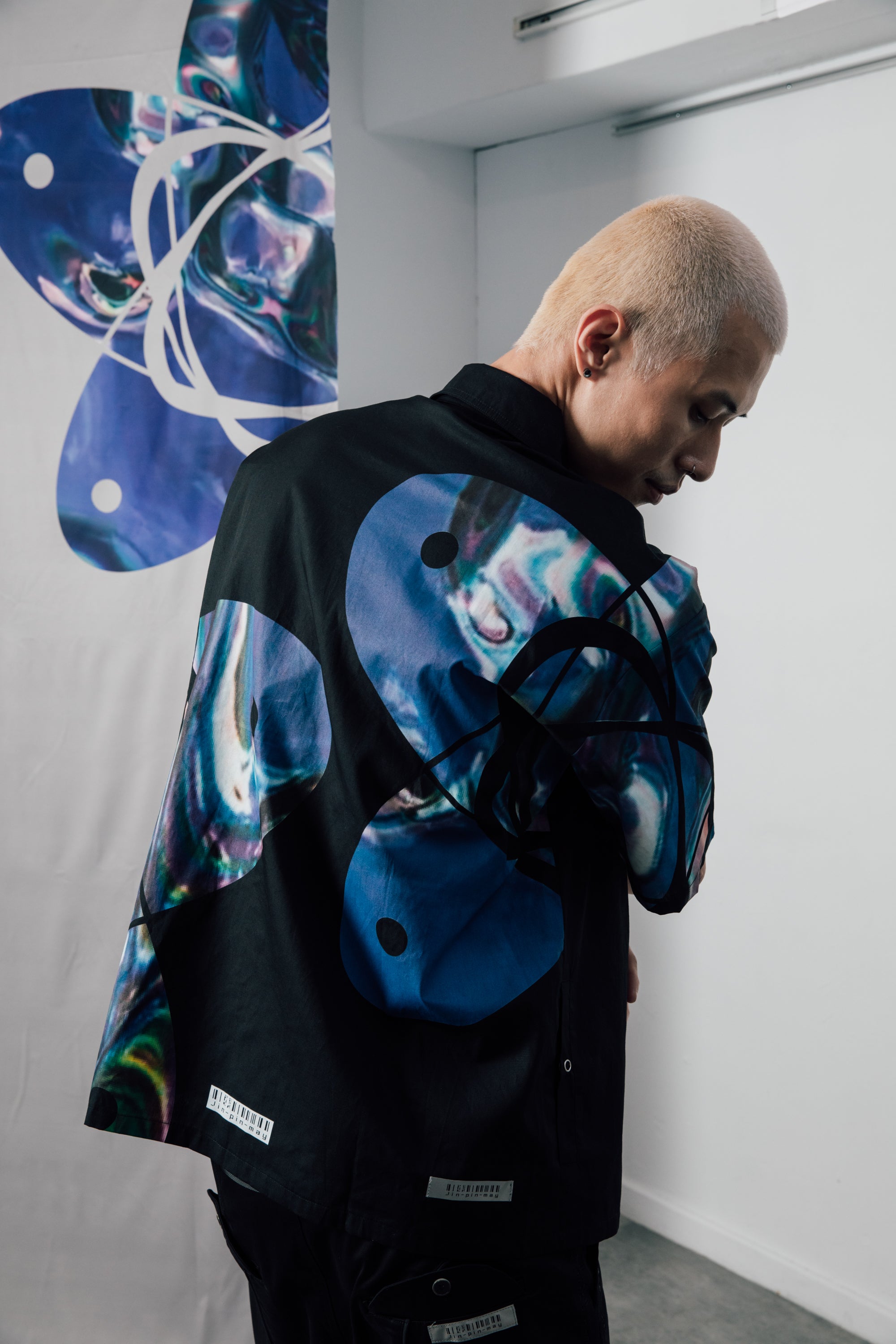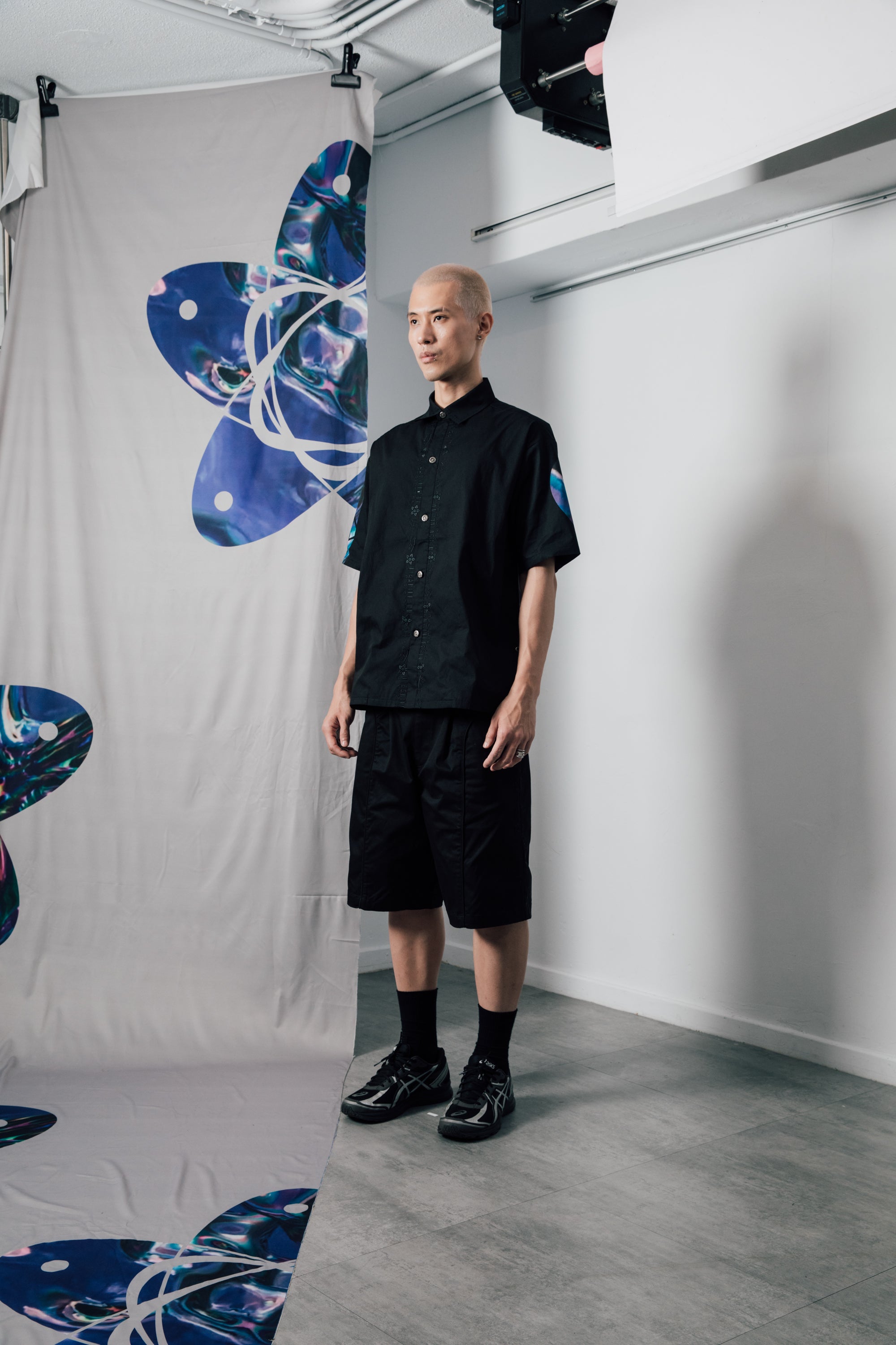 從 PINHENG 擅長的圖騰轉化出發,結合 JINEASTERNAU 的東方與未來感,將梅花符號透過熱轉印與繡花層層疊合,建構出一種未來感的襯衫單品。背後大面積漸變印花呼應「金萍梅 Jinpinmay」 對未來文化的重構,而門襟兩側更藏有系列標誌物件的電繡暗語,在沉穩中釋放鮮明視覺張力。