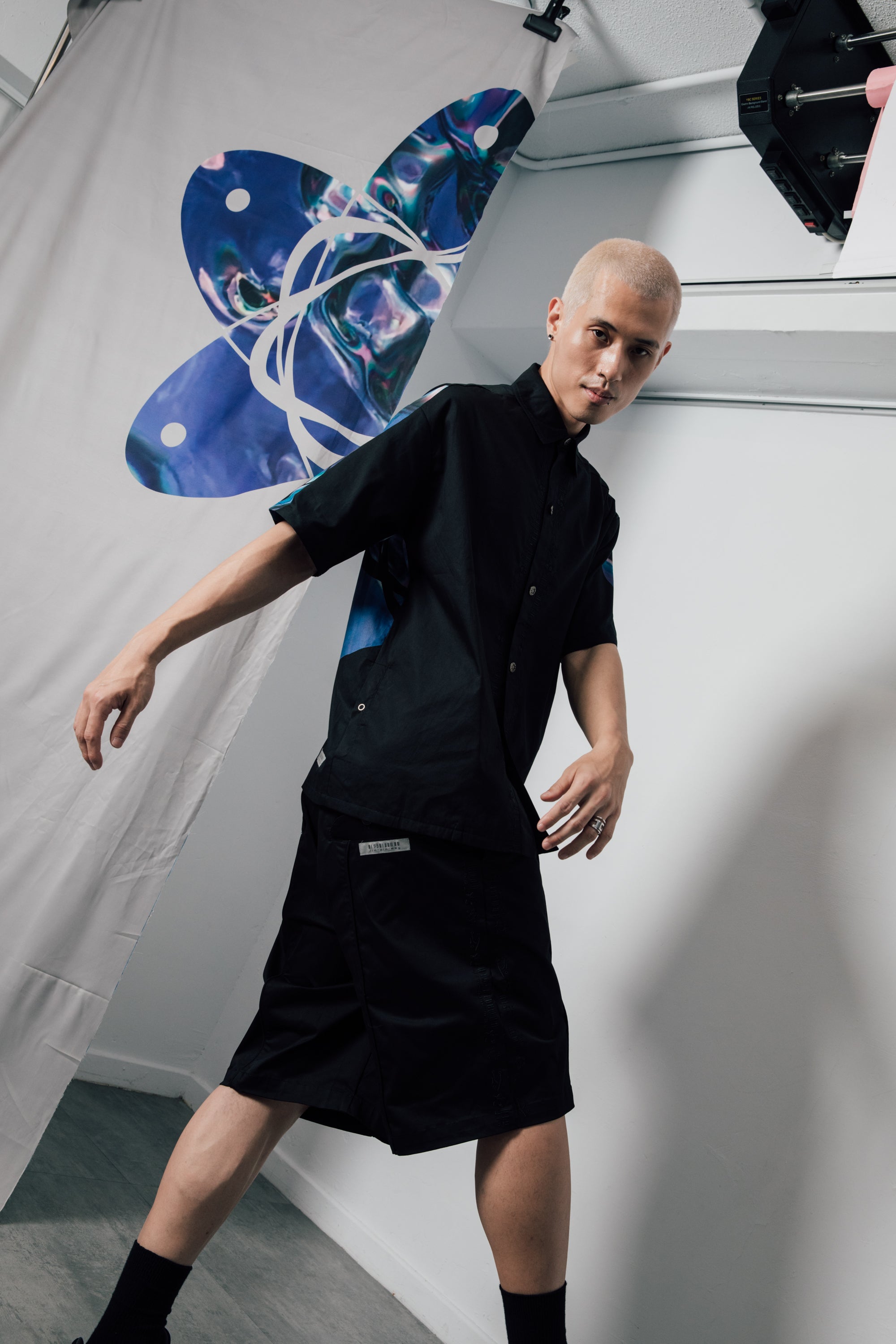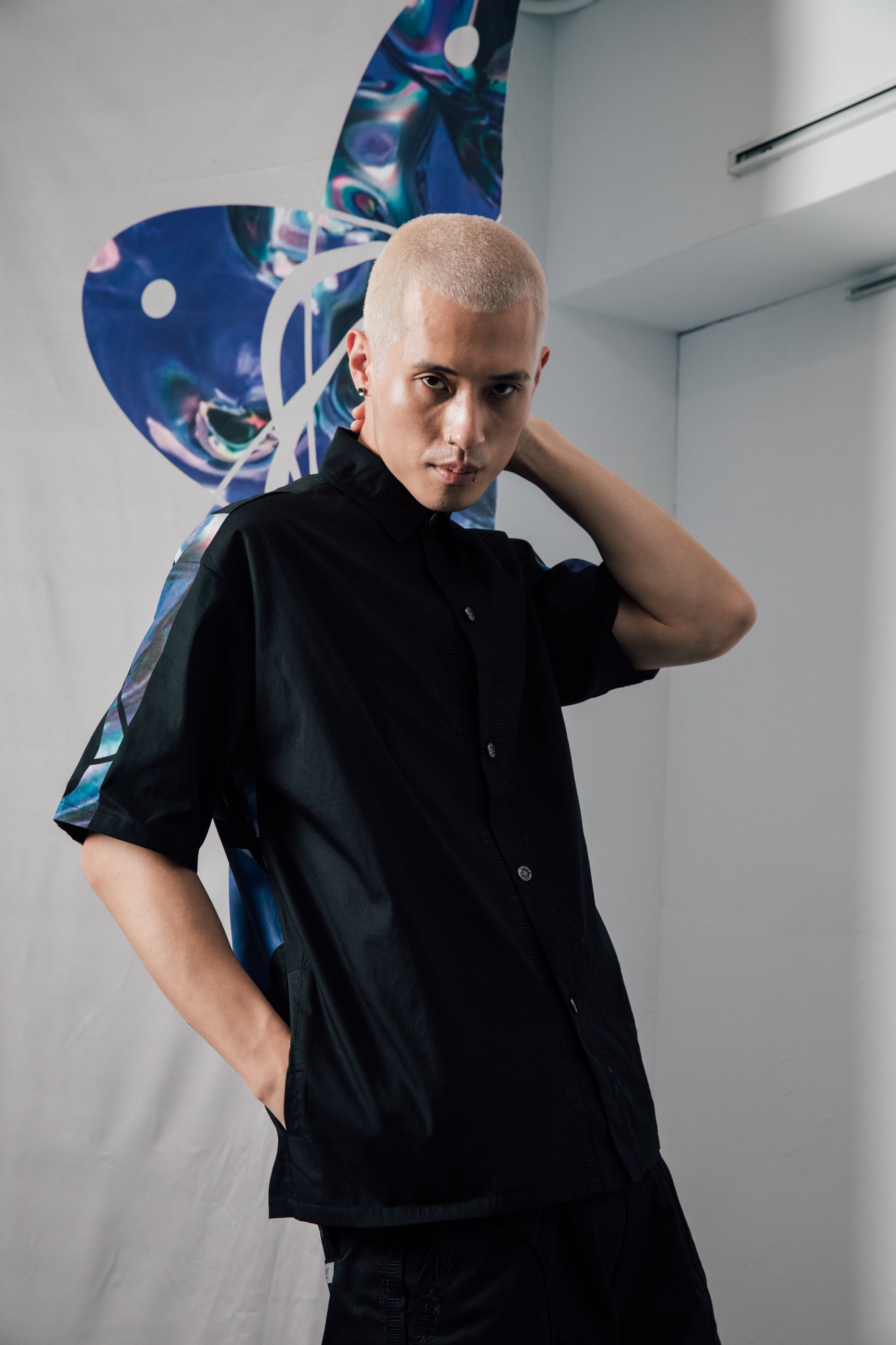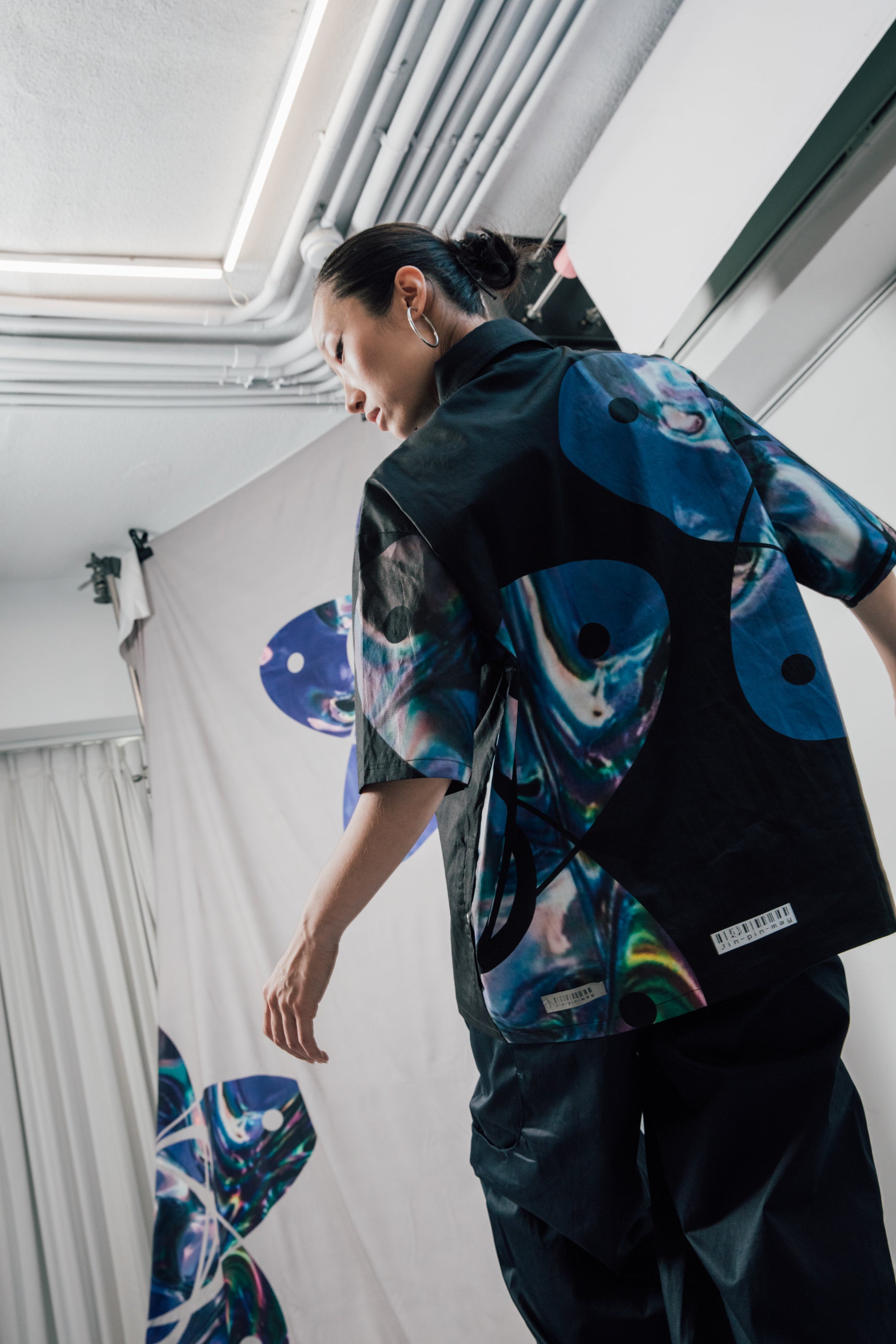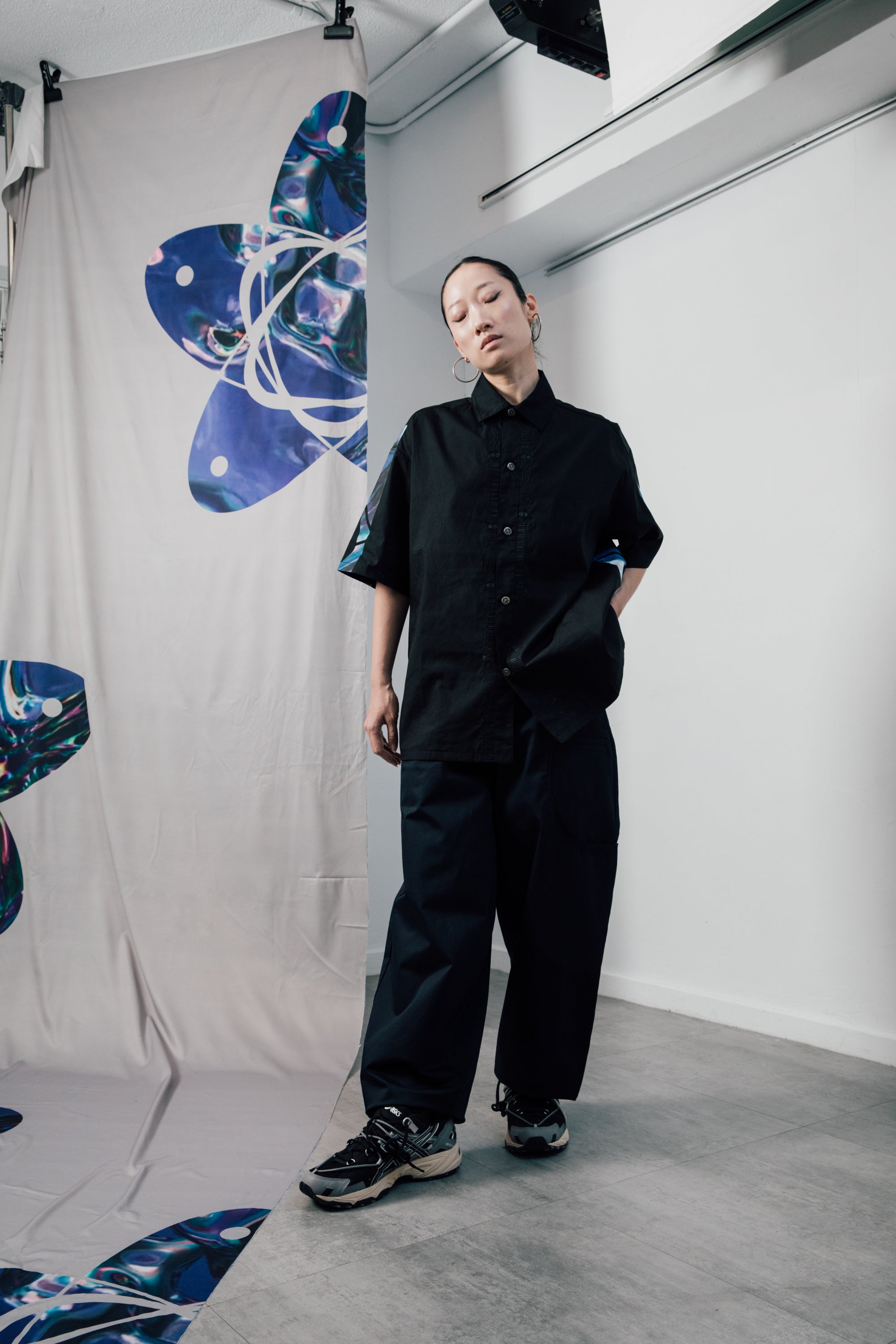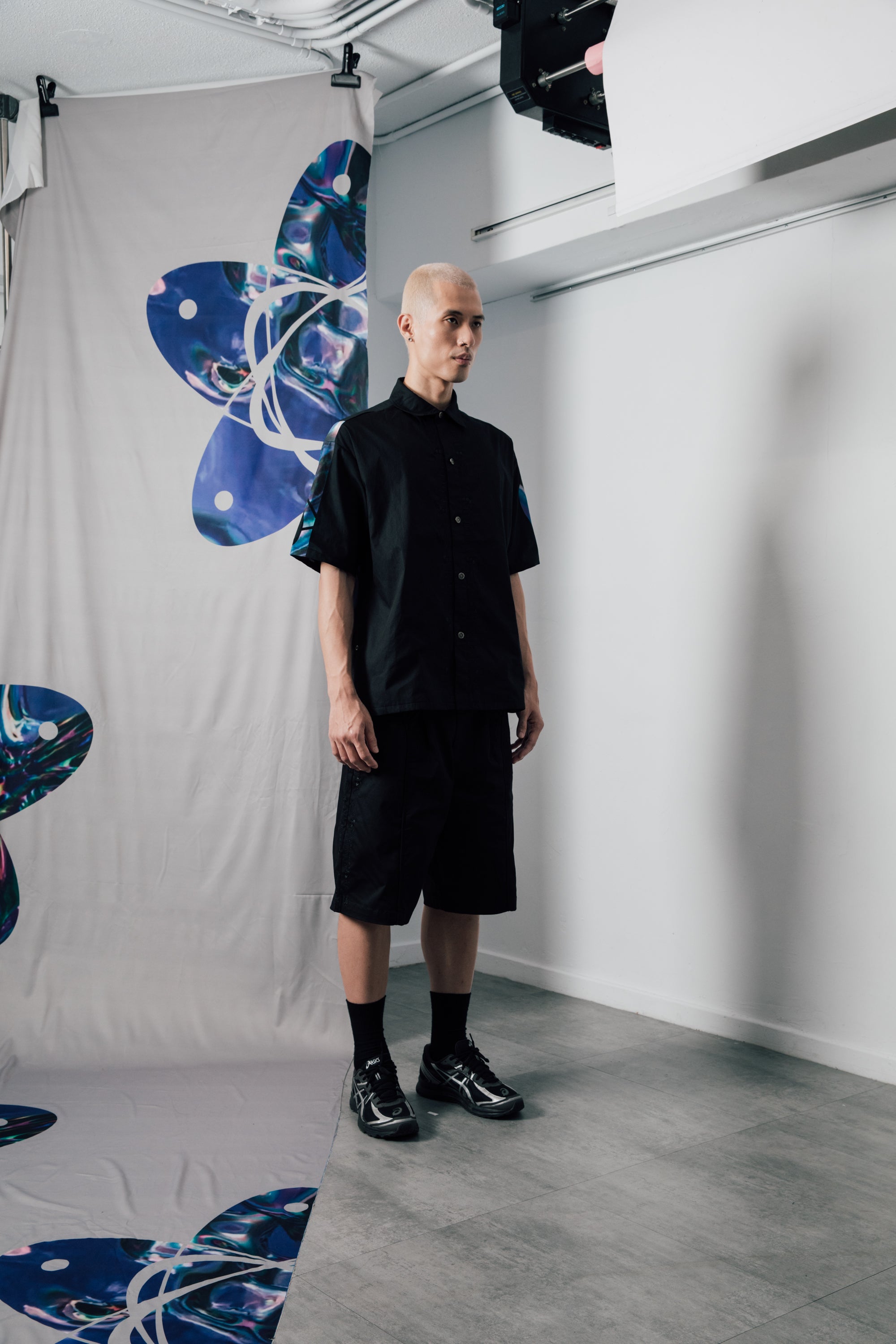 從 PINHENG 擅長的圖騰轉化出發,結合 JINEASTERNAU 的東方與未來感,將梅花符號透過熱轉印與繡花層層疊合,建構出一種未來感的襯衫單品。背後大面積漸變印花呼應「金萍梅 Jinpinmay」 對未來文化的重構,而門襟兩側更藏有系列標誌物件的電繡暗語,在沉穩中釋放鮮明視覺張力。