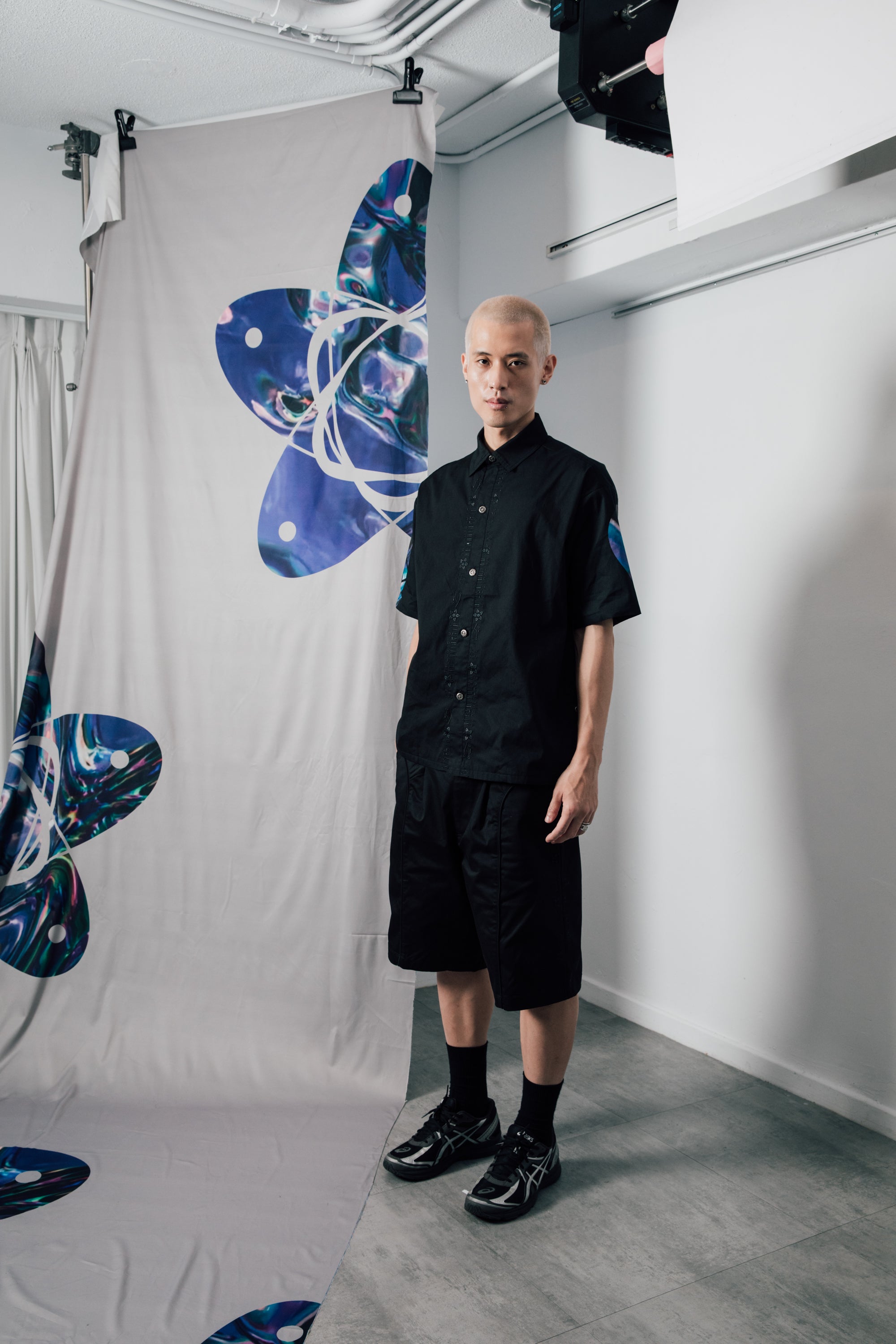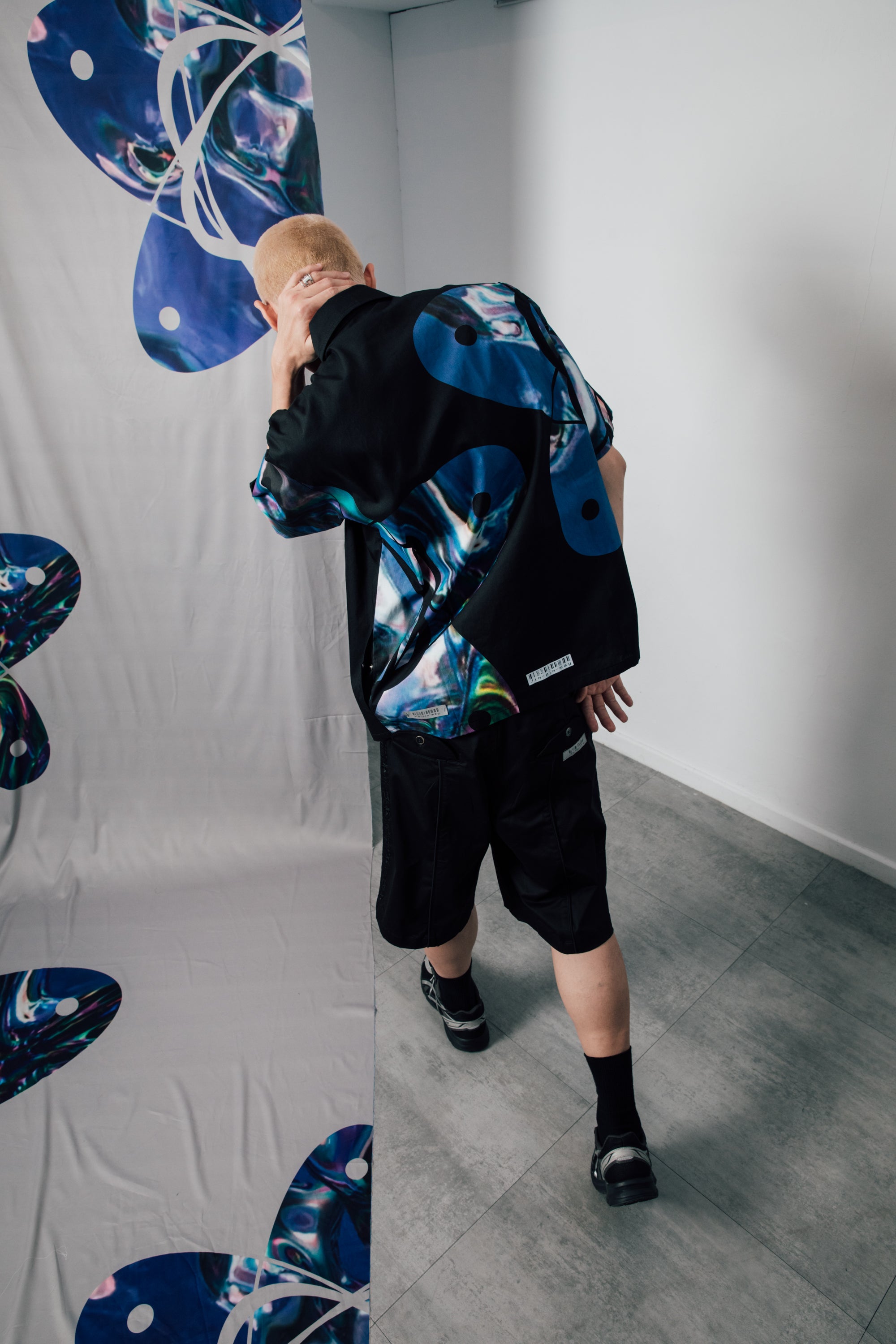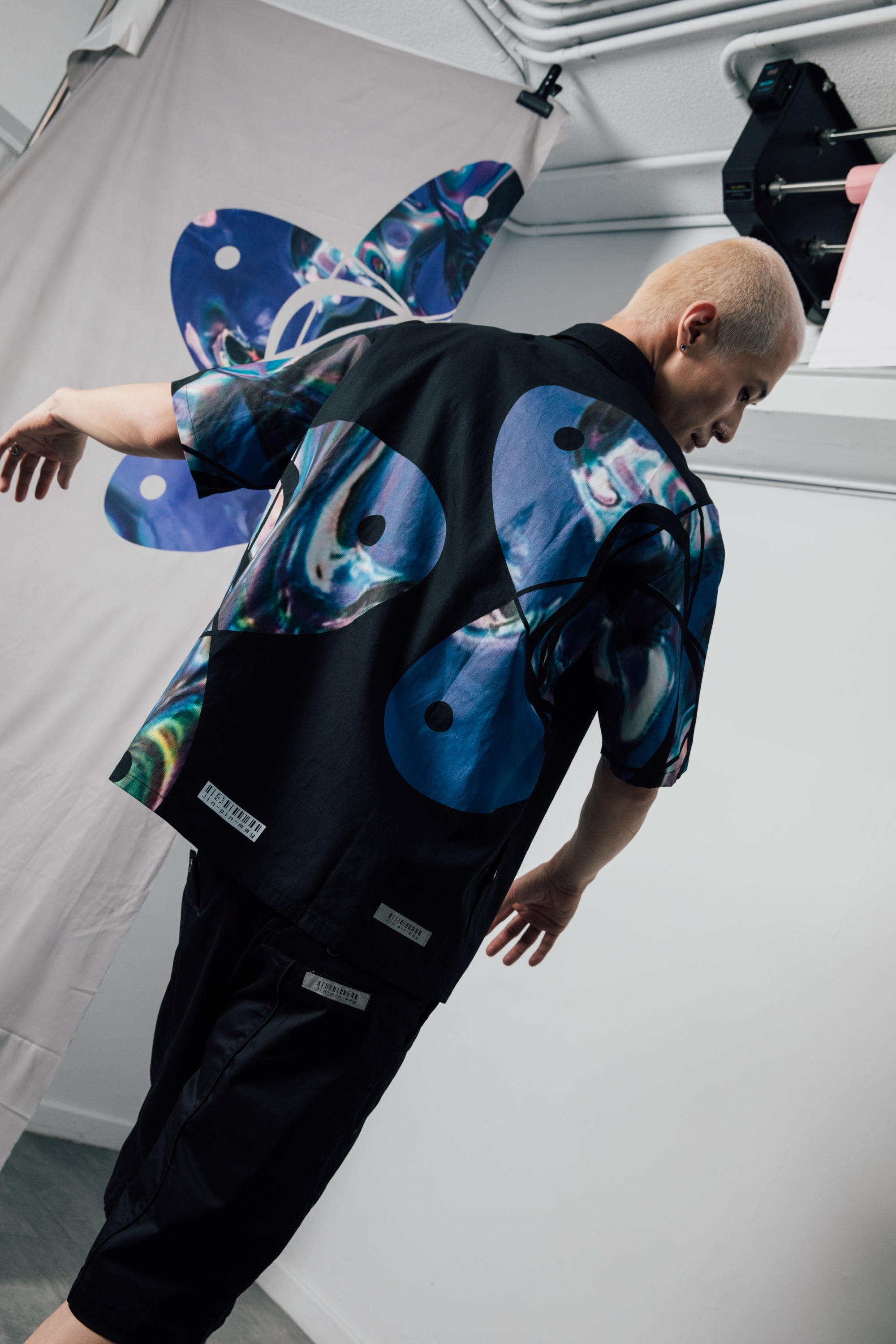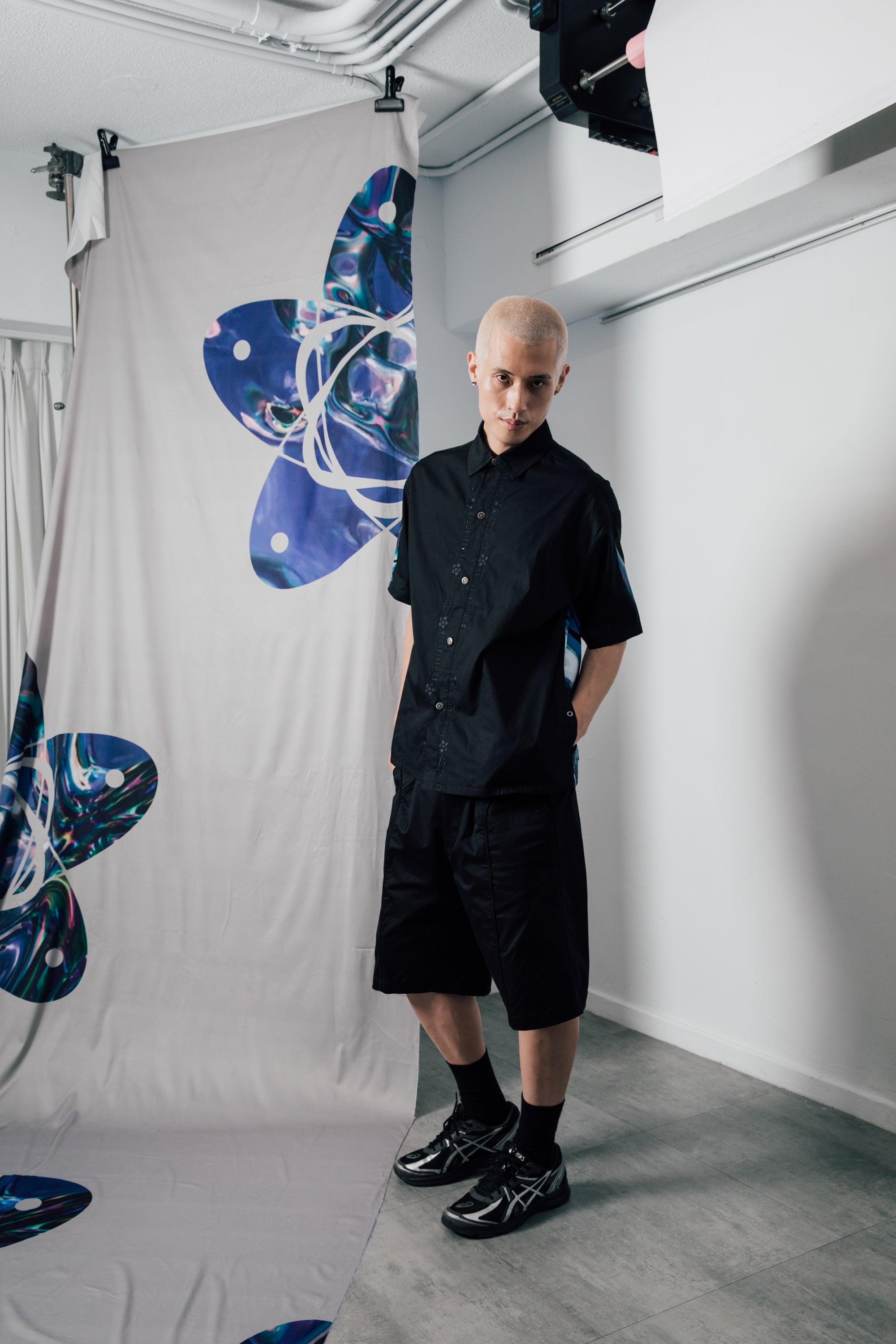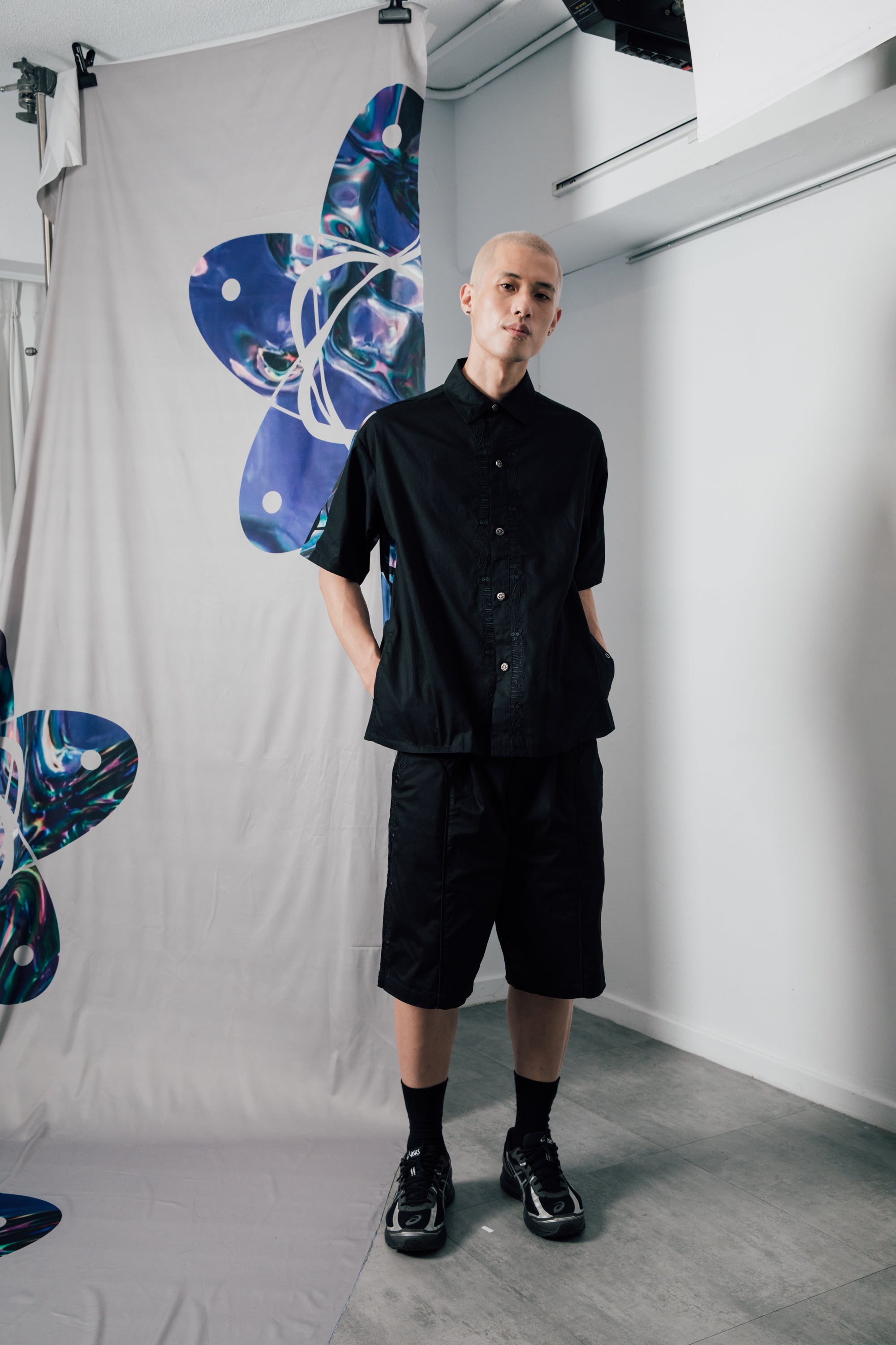 從 PINHENG 擅長的圖騰轉化出發,結合 JINEASTERNAU 的東方與未來感,將梅花符號透過熱轉印與繡花層層疊合,建構出一種未來感的襯衫單品。背後大面積漸變印花呼應「金萍梅 Jinpinmay」 對未來文化的重構,而門襟兩側更藏有系列標誌物件的電繡暗語,在沉穩中釋放鮮明視覺張力。