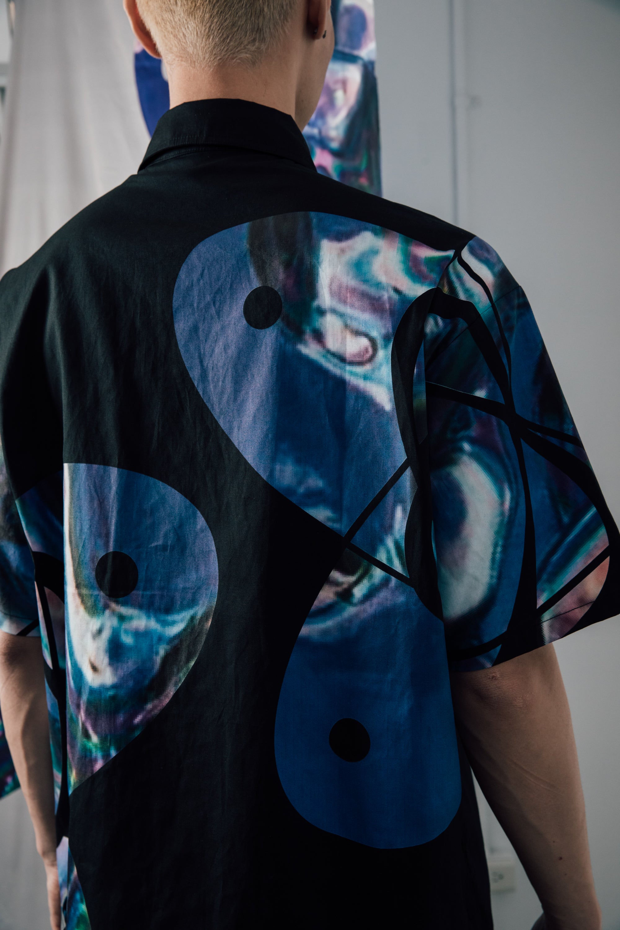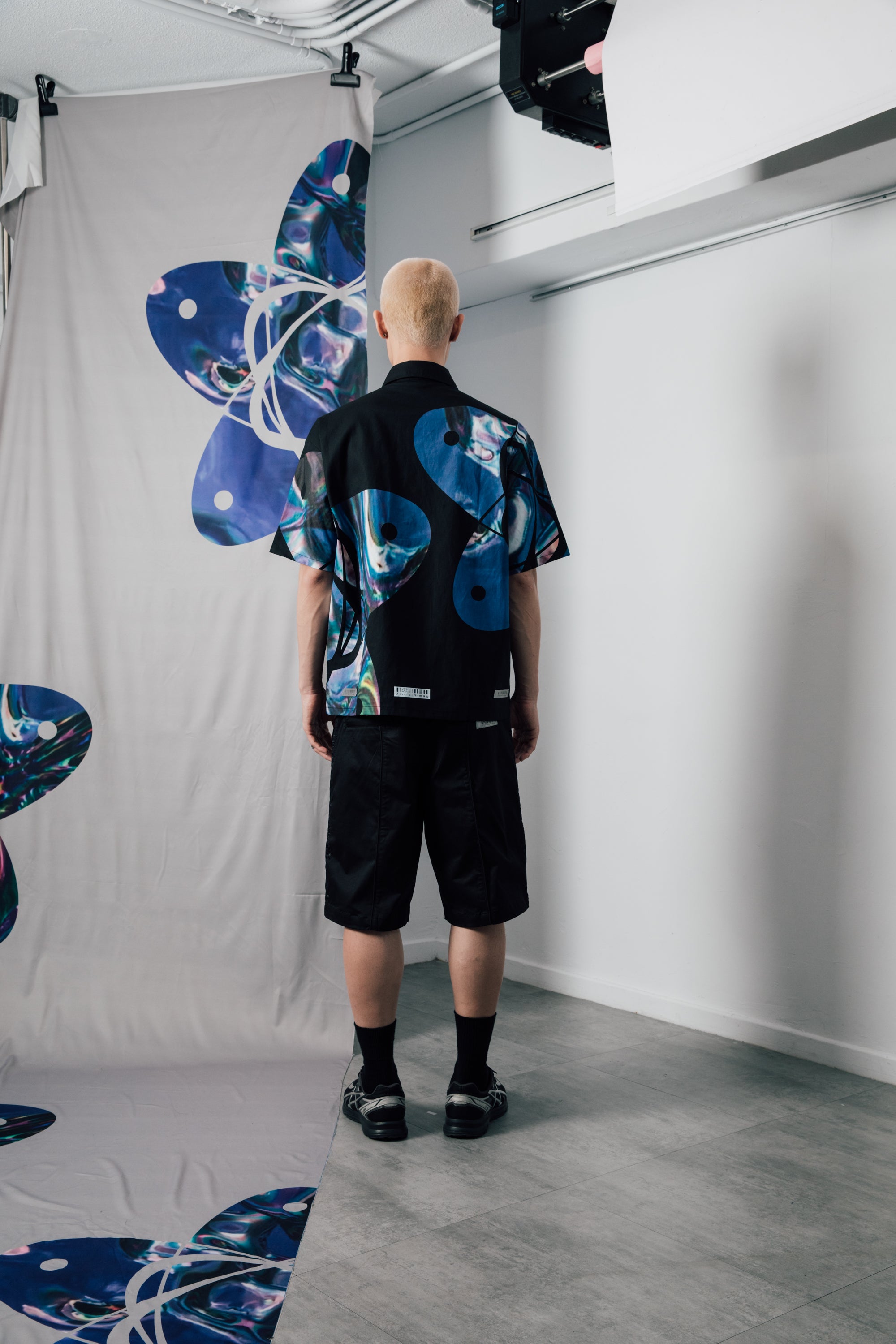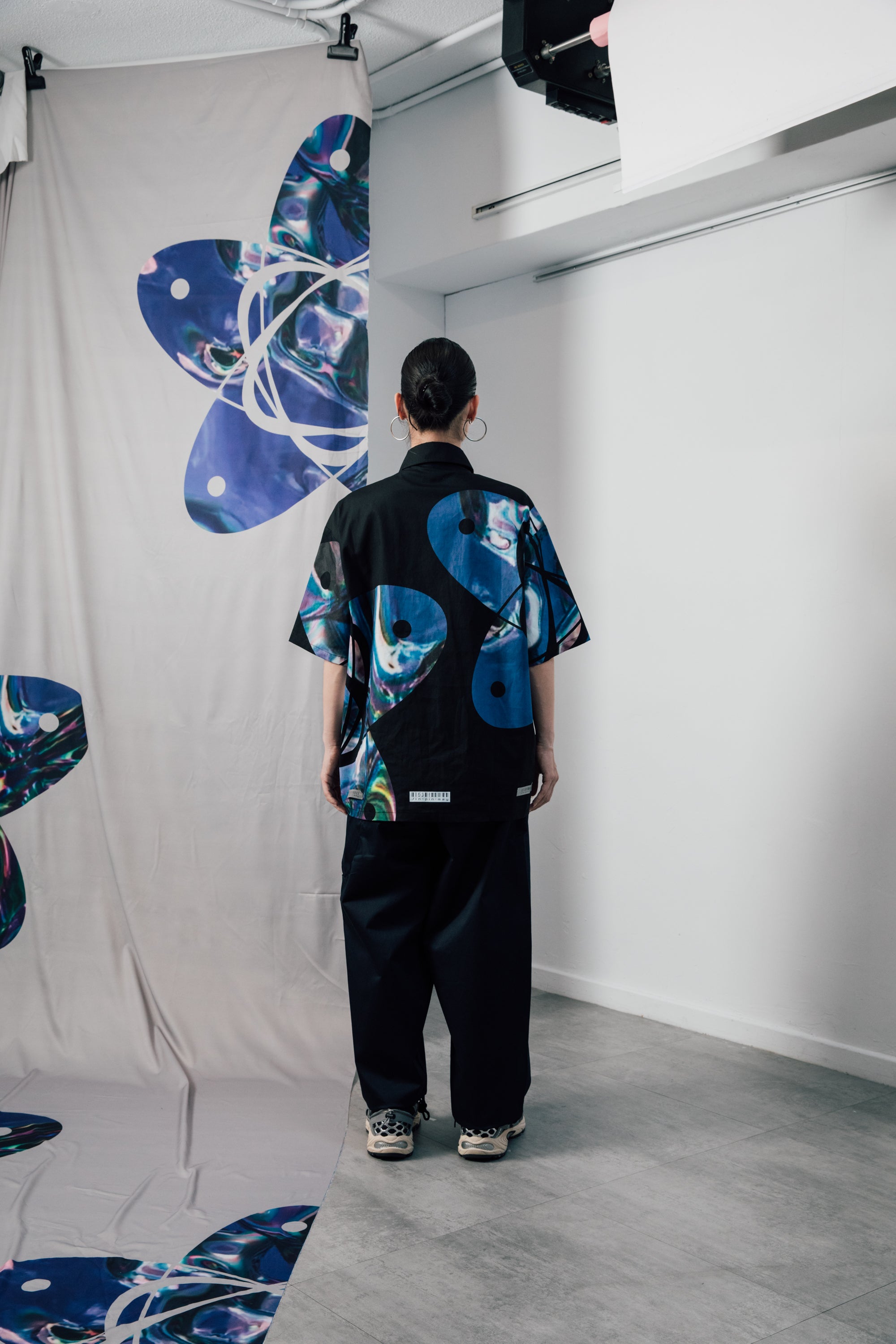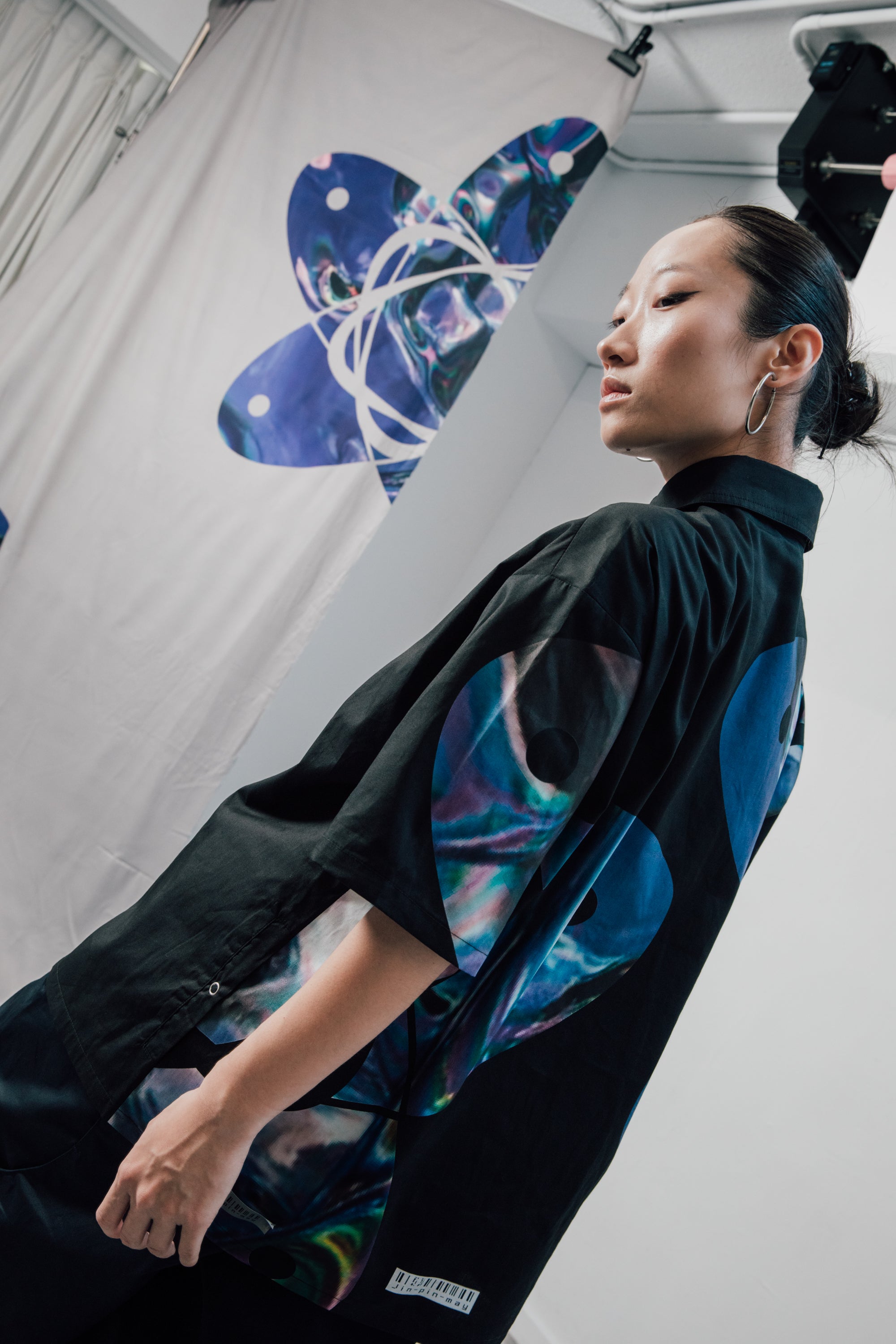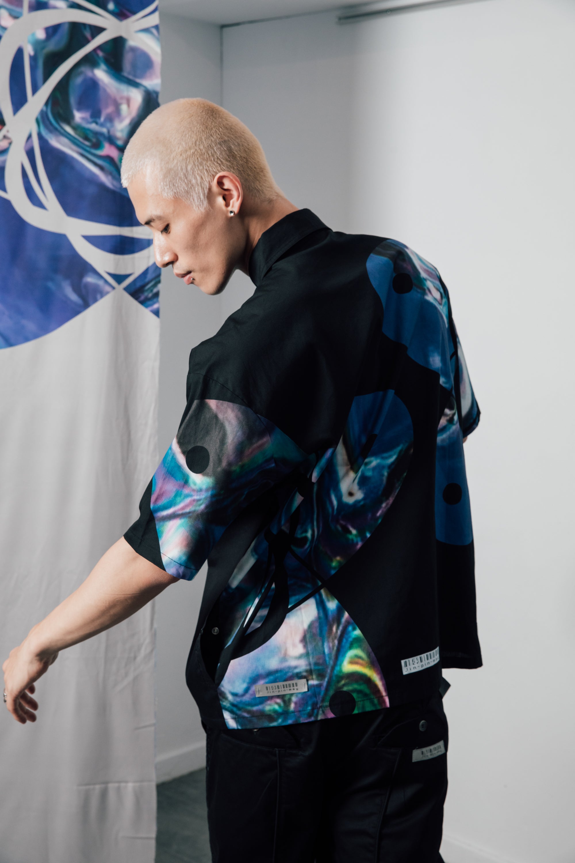 從 PINHENG 擅長的圖騰轉化出發,結合 JINEASTERNAU 的東方與未來感,將梅花符號透過熱轉印與繡花層層疊合,建構出一種未來感的襯衫單品。背後大面積漸變印花呼應「金萍梅 Jinpinmay」 對未來文化的重構,而門襟兩側更藏有系列標誌物件的電繡暗語,在沉穩中釋放鮮明視覺張力。