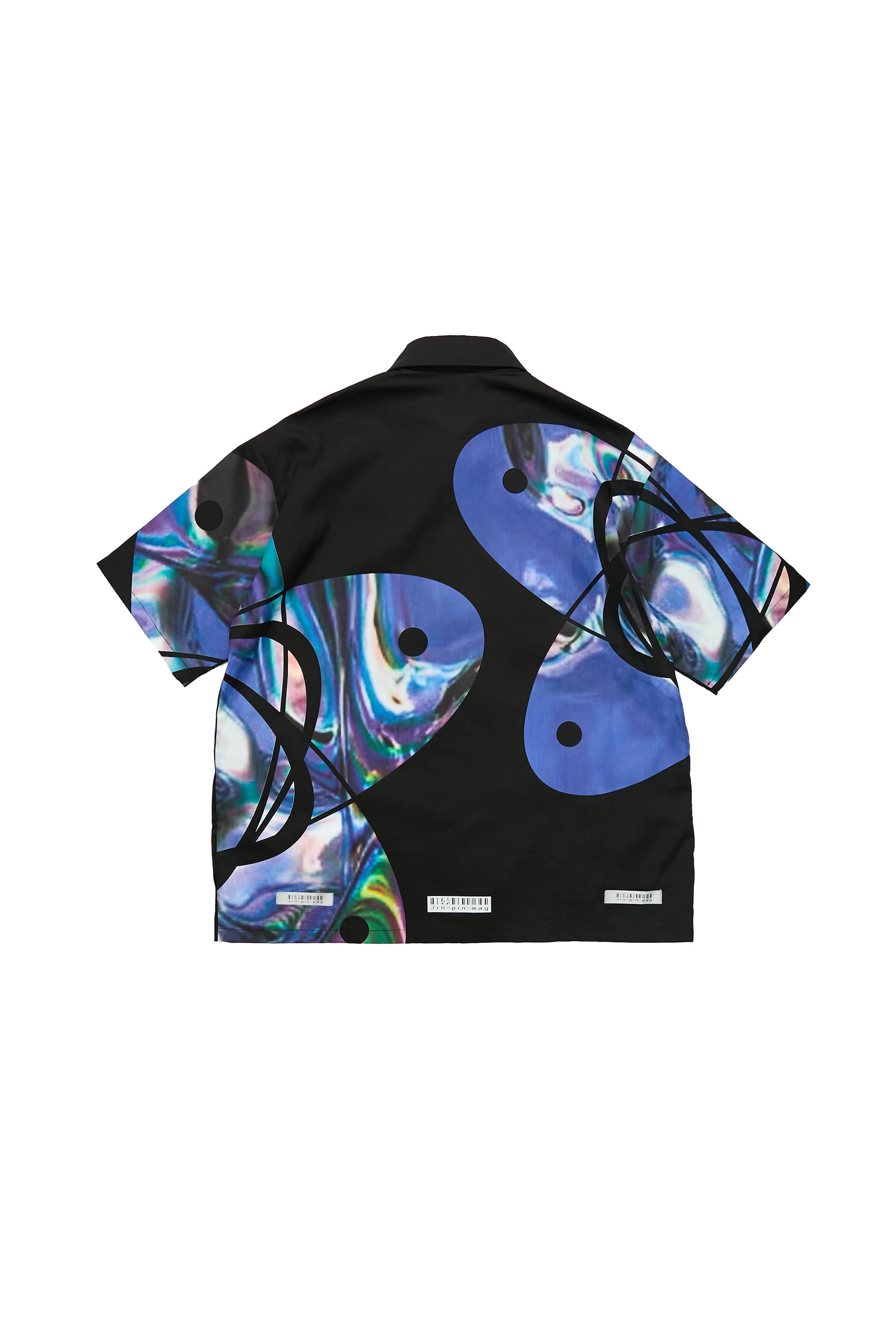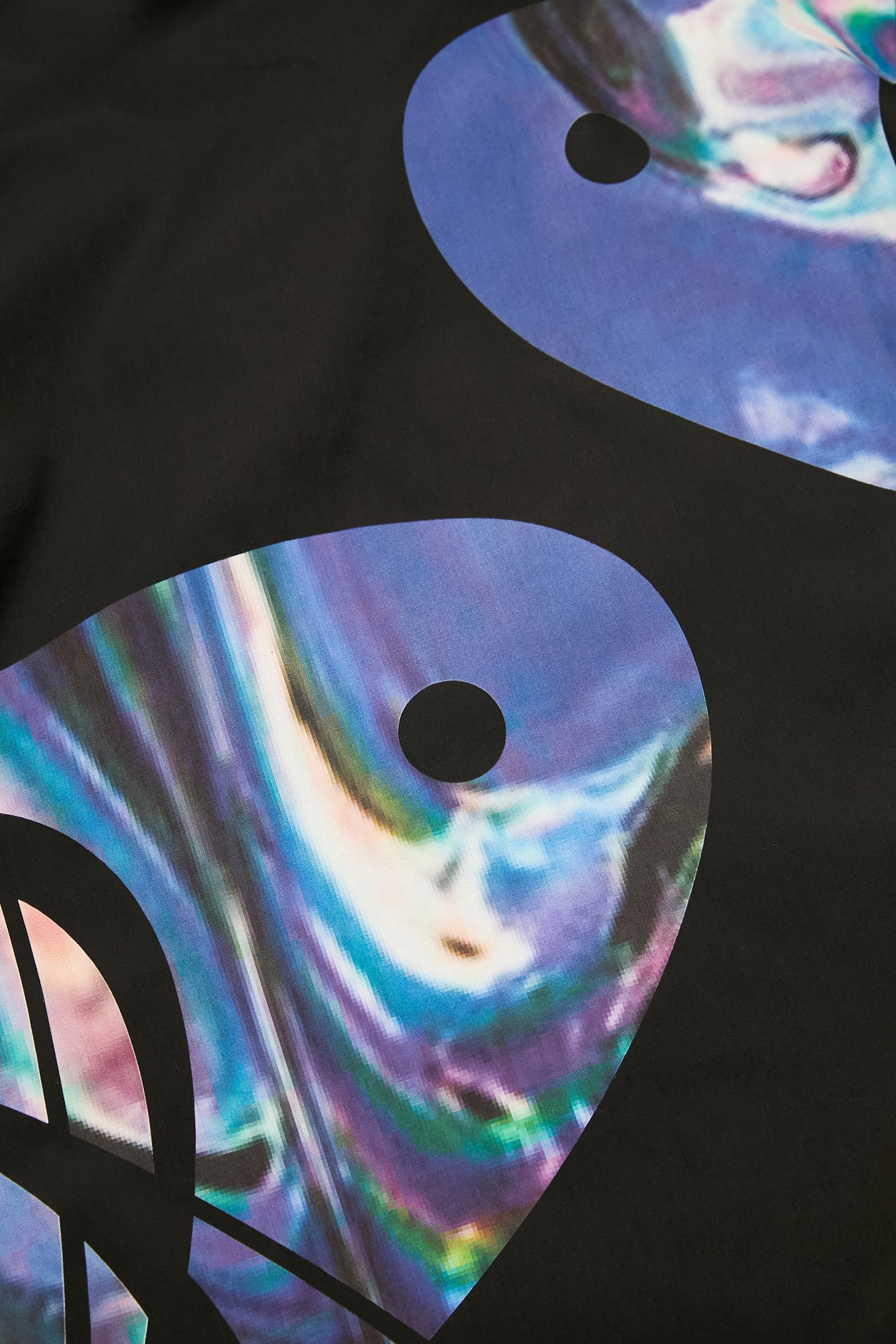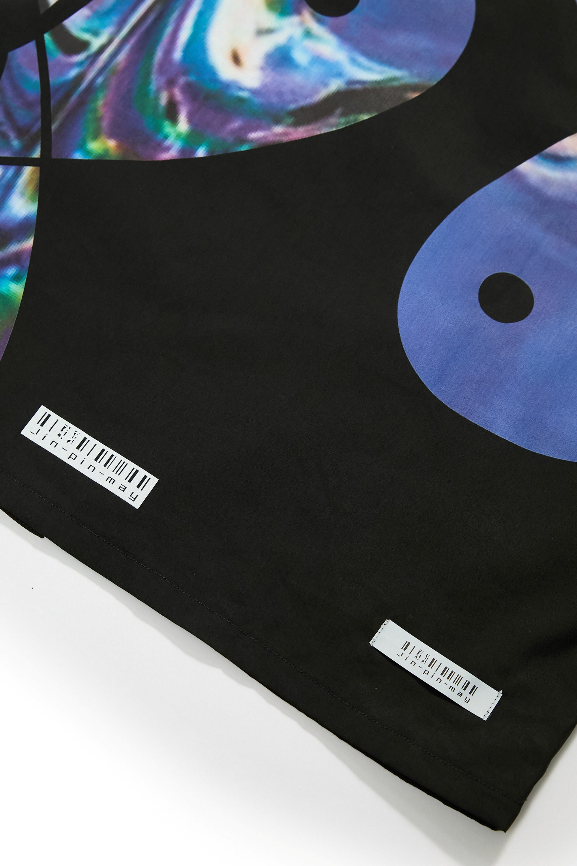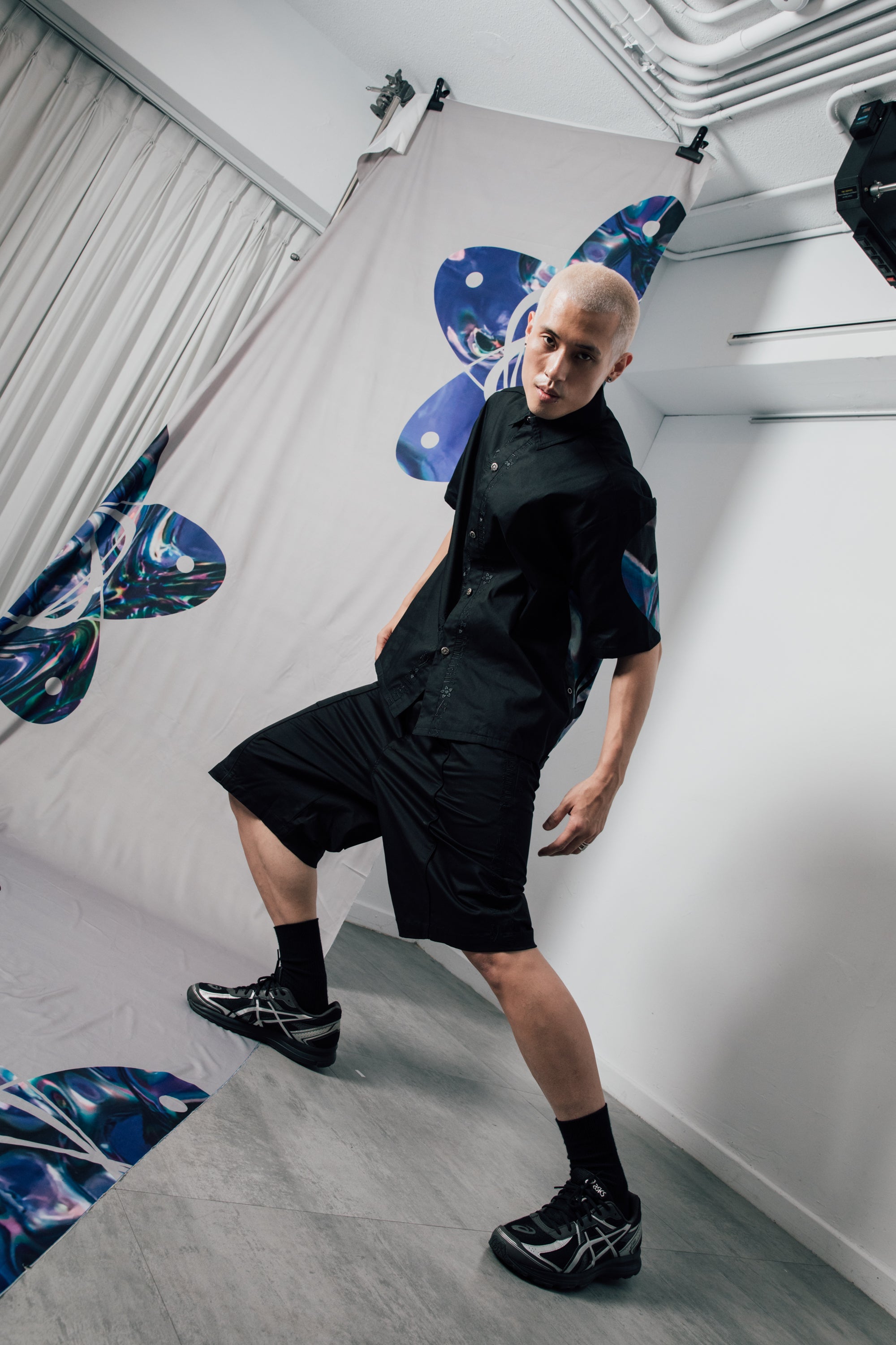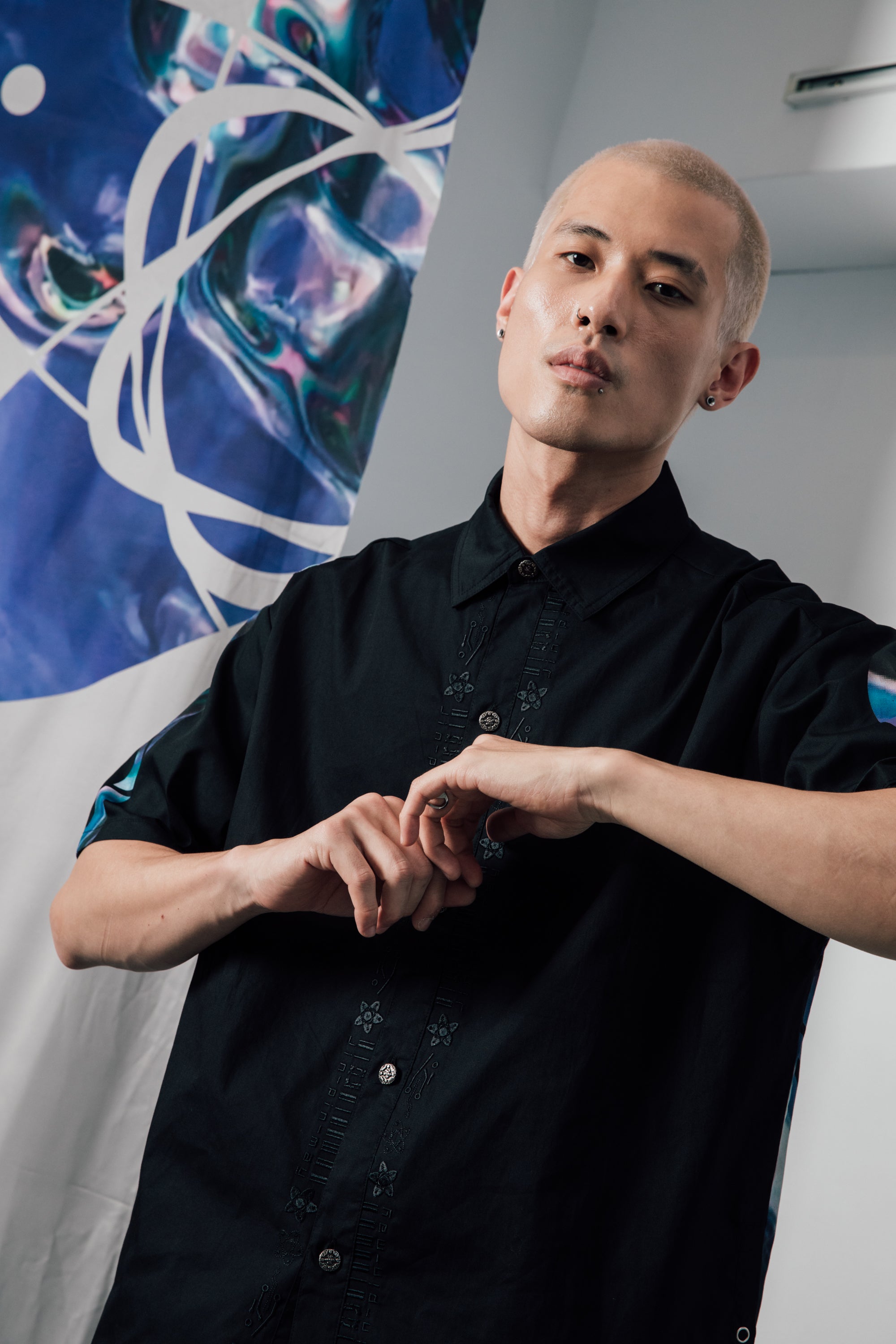 從 PINHENG 擅長的圖騰轉化出發,結合 JINEASTERNAU 的東方與未來感,將梅花符號透過熱轉印與繡花層層疊合,建構出一種未來感的襯衫單品。背後大面積漸變印花呼應「金萍梅 Jinpinmay」 對未來文化的重構,而門襟兩側更藏有系列標誌物件的電繡暗語,在沉穩中釋放鮮明視覺張力。
