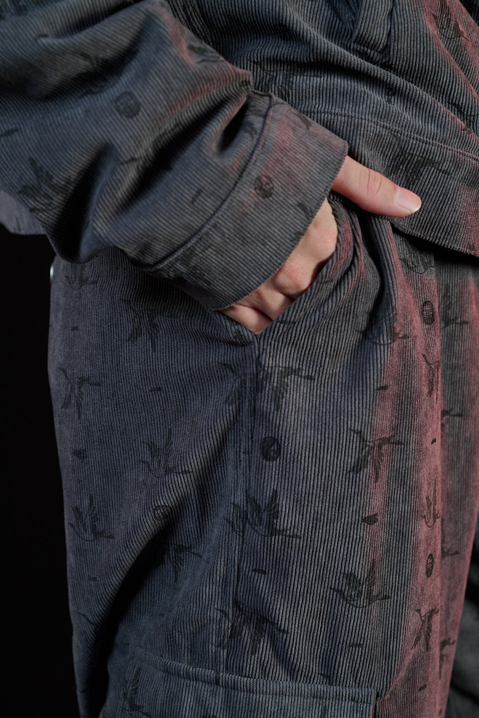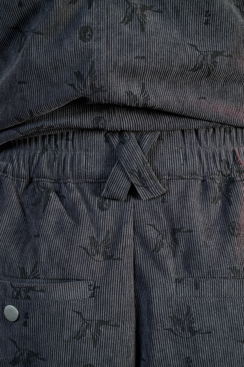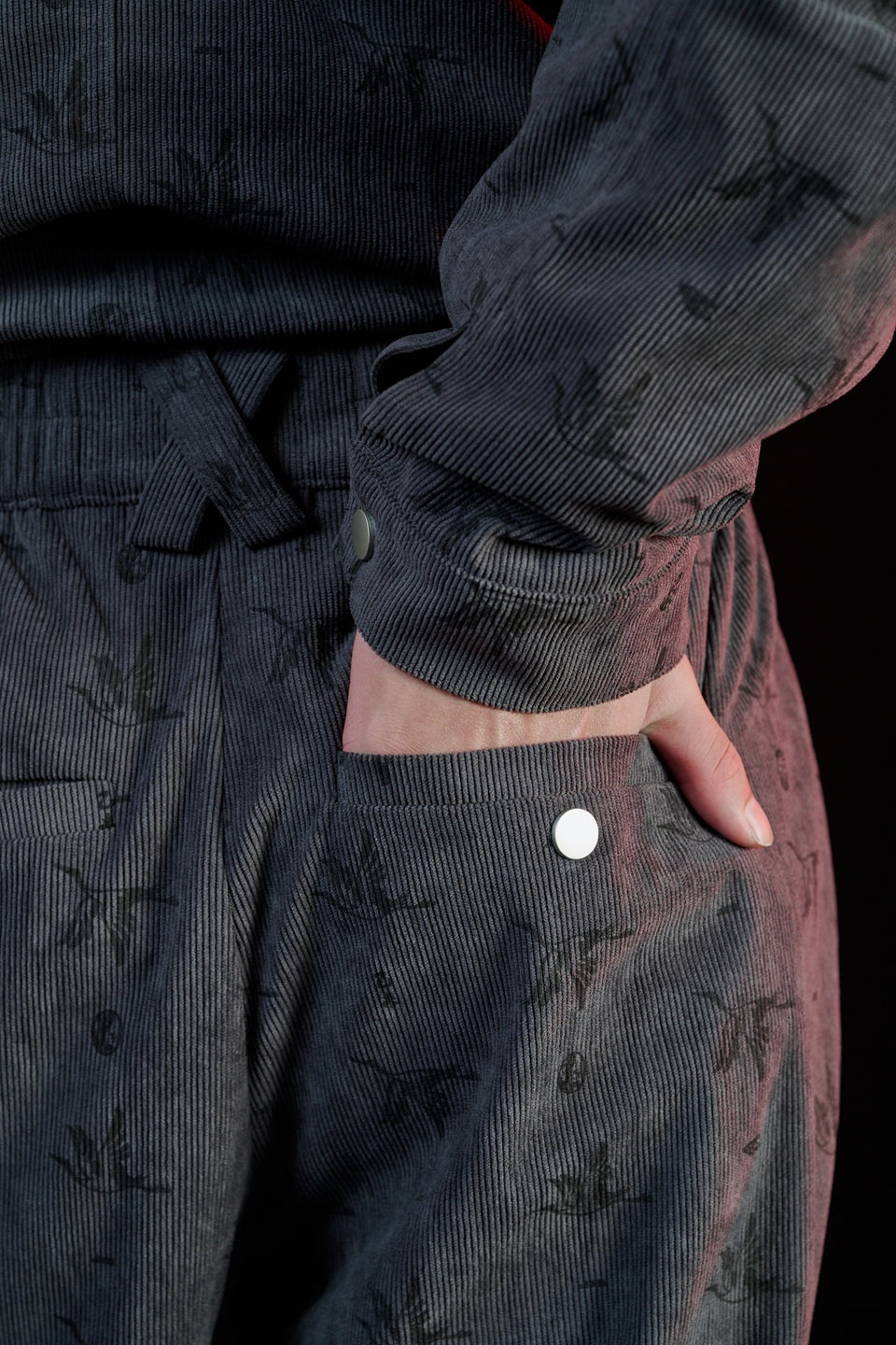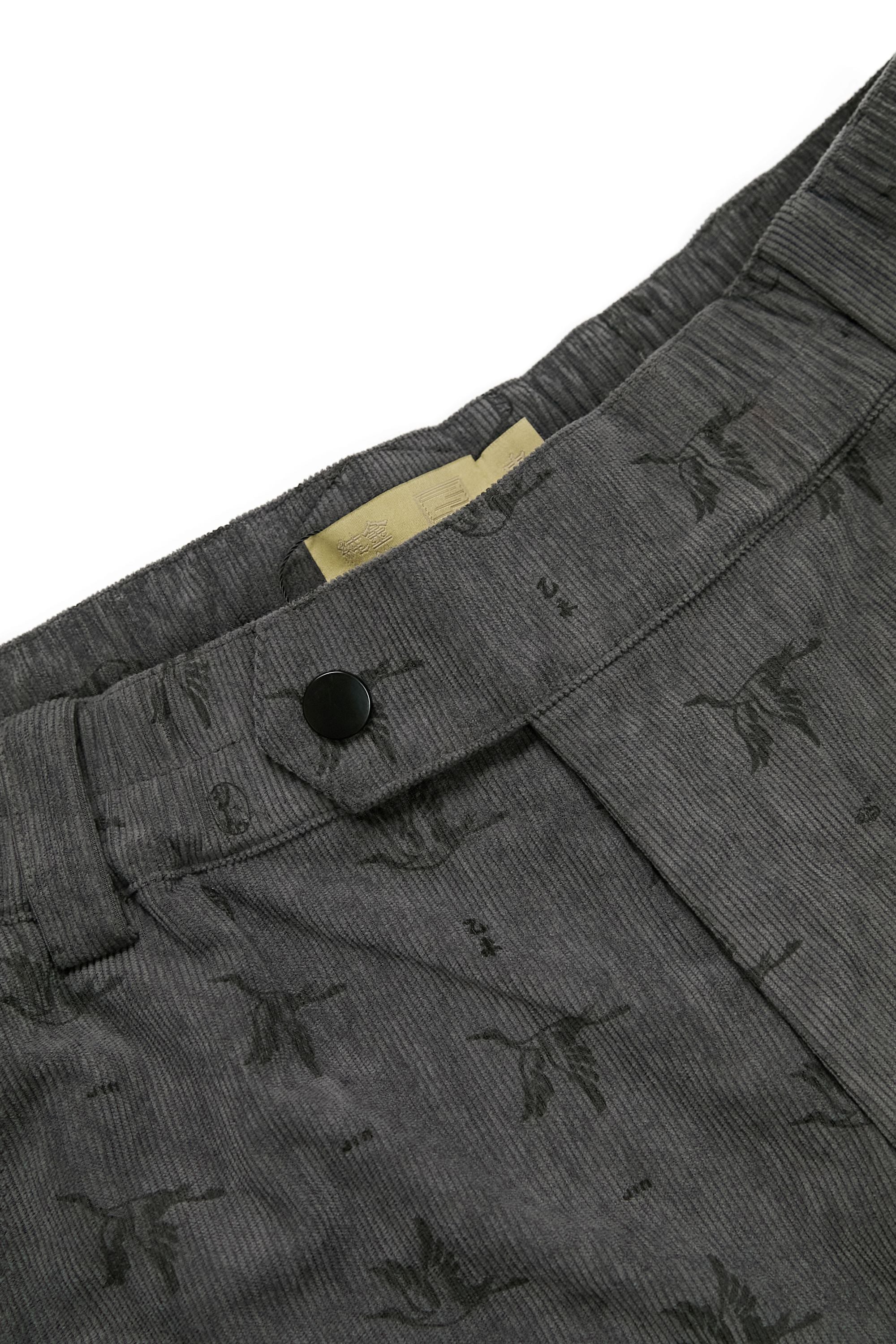 布料選用細緻燈芯絨材質,保留秋冬特有的溫潤觸感,厚實,柔軟並有良好的保暖性,使褲身在活動時維持穩定線條,不失份量感。