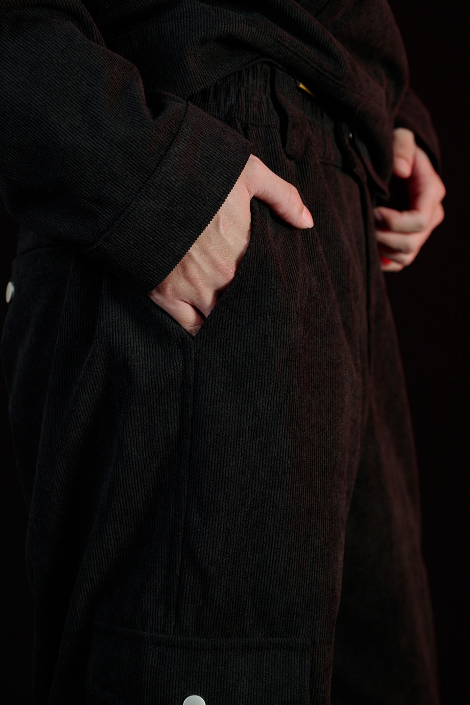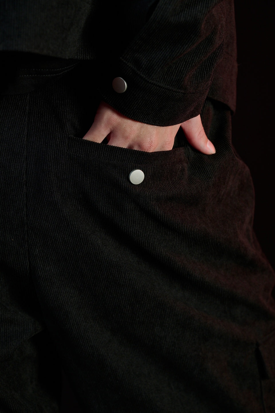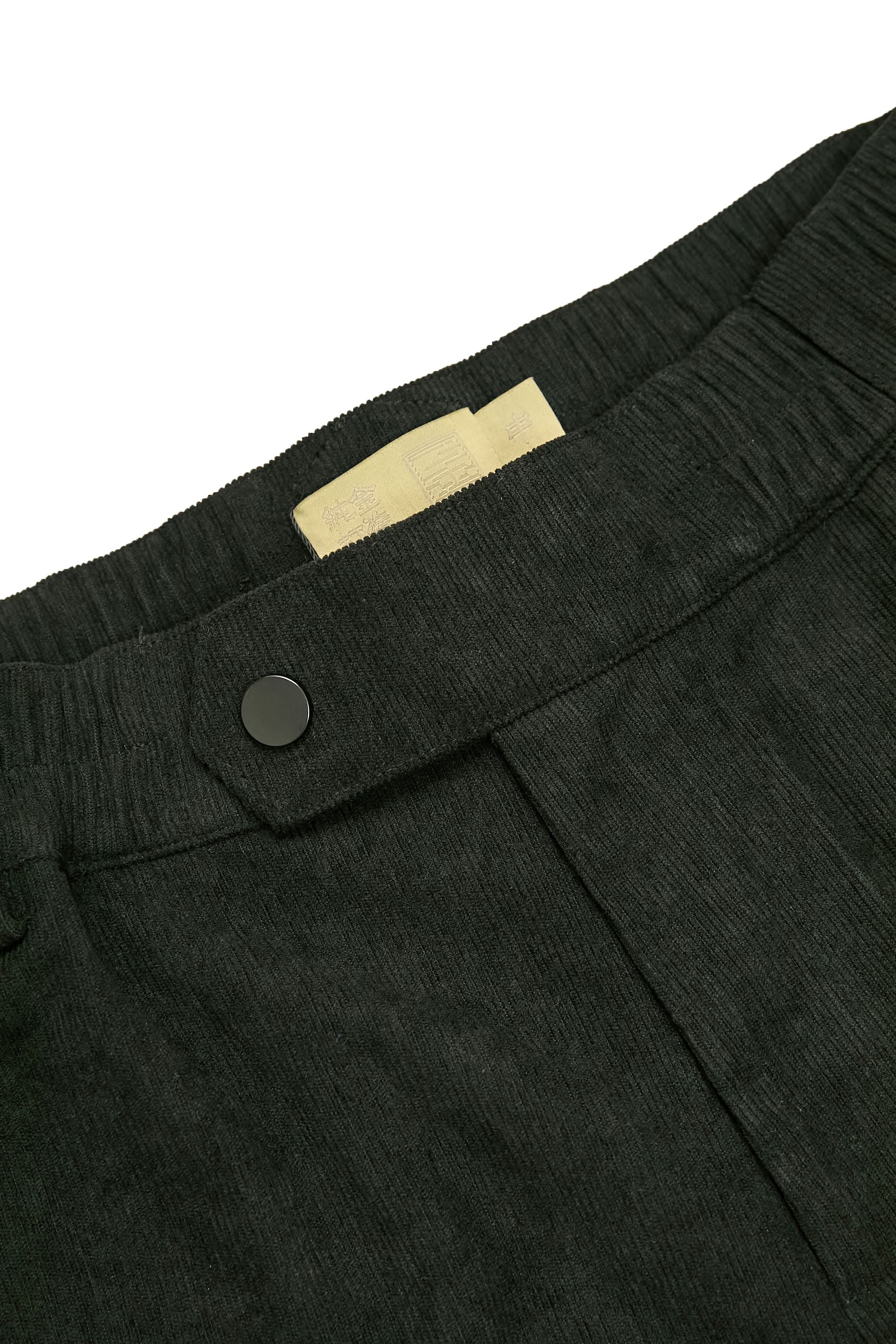 布料選用細緻燈芯絨材質,保留秋冬特有的溫潤觸感,厚實,柔軟並有良好的保暖性,使褲身在活動時維持穩定線條,不失份量感。