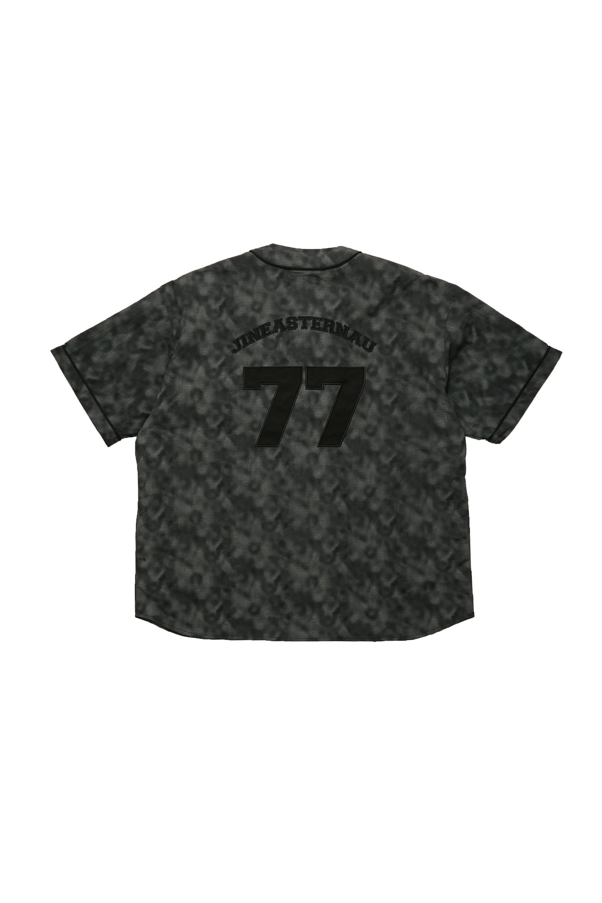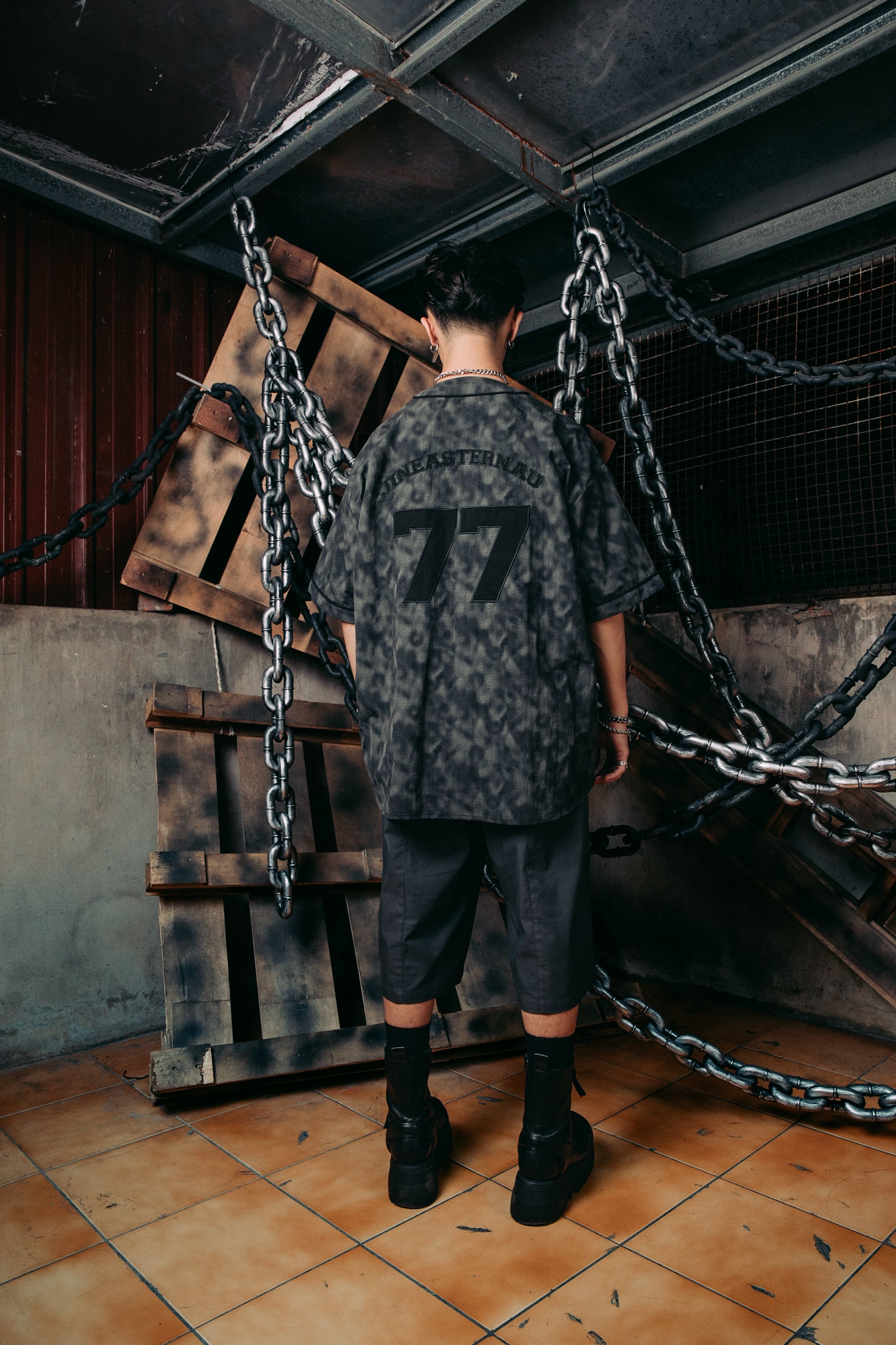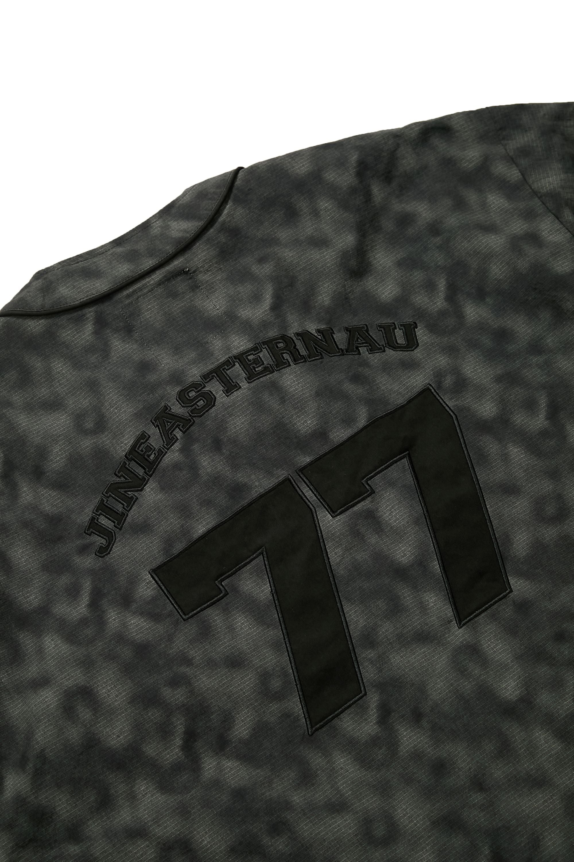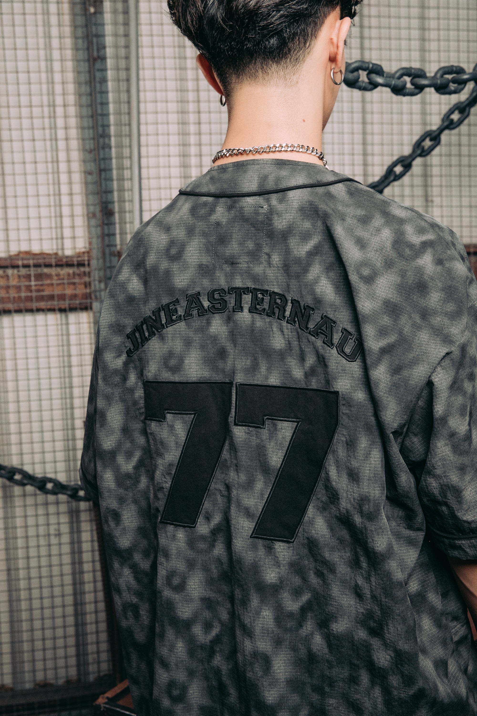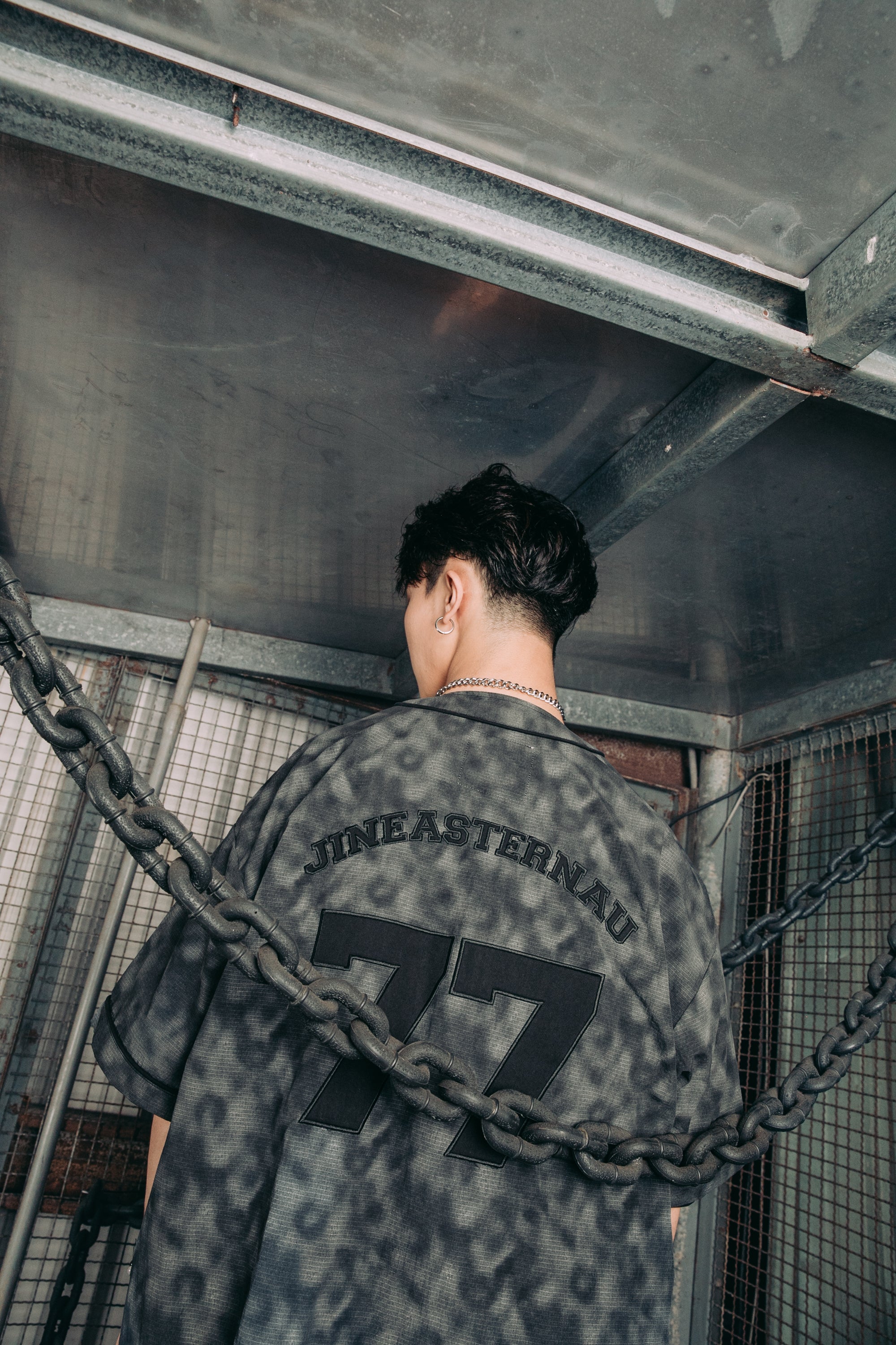 This time, JINEASTERNAU continues its exploration of fabrics, showcasing two distinct textures. A custom-made embroidered textured fabric and a dyed and printed tear-resistant fabric create a jarring harmony across the Tang suit and baseball jersey. Black budding accents create a sharp, three-dimensional line, outlining the garment's structure and futuristic aesthetic. The "77" appliqué on the back references the Eslite store's address in Jinwuchang, symbolizing the brand's connection to the city.