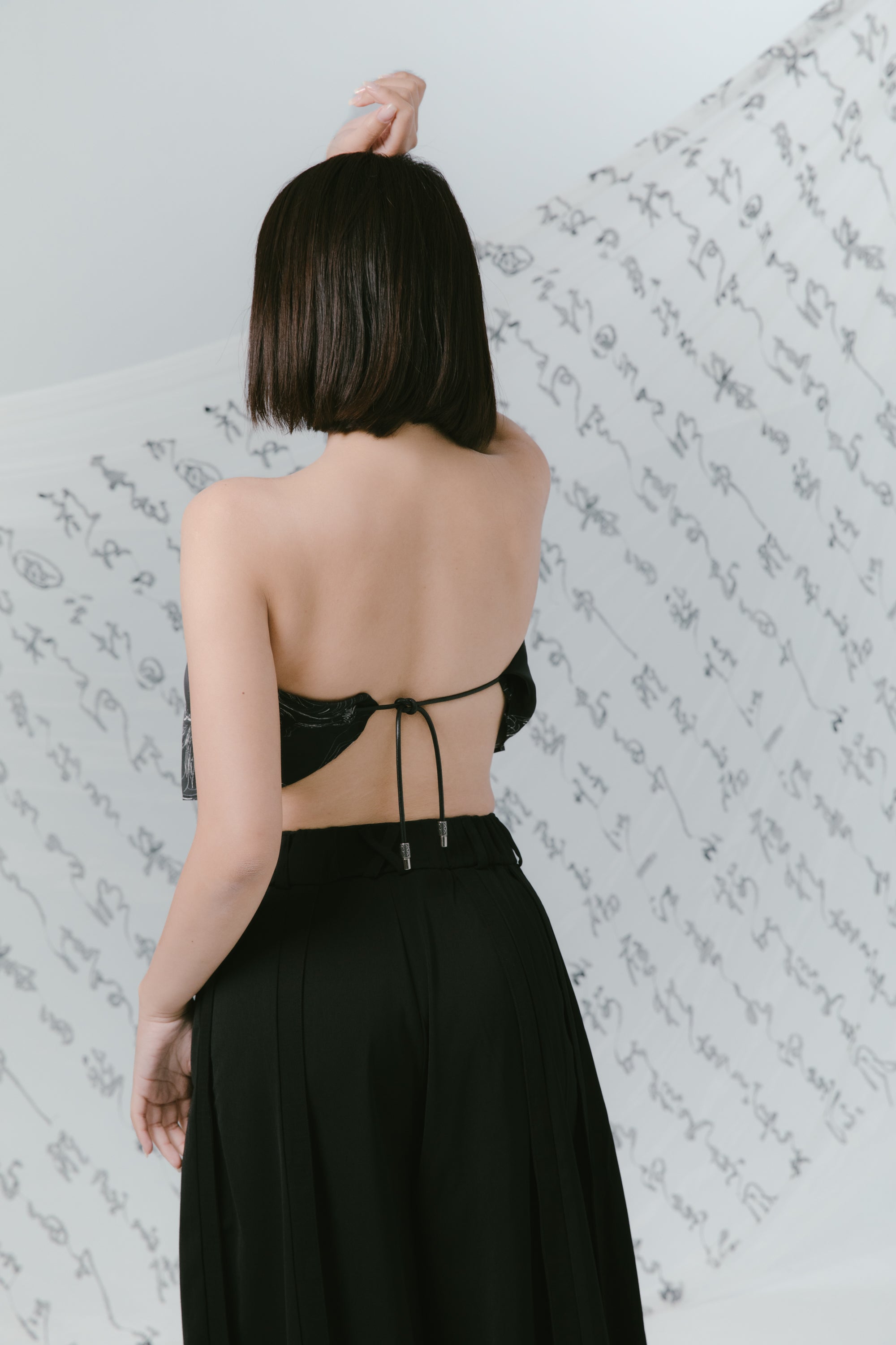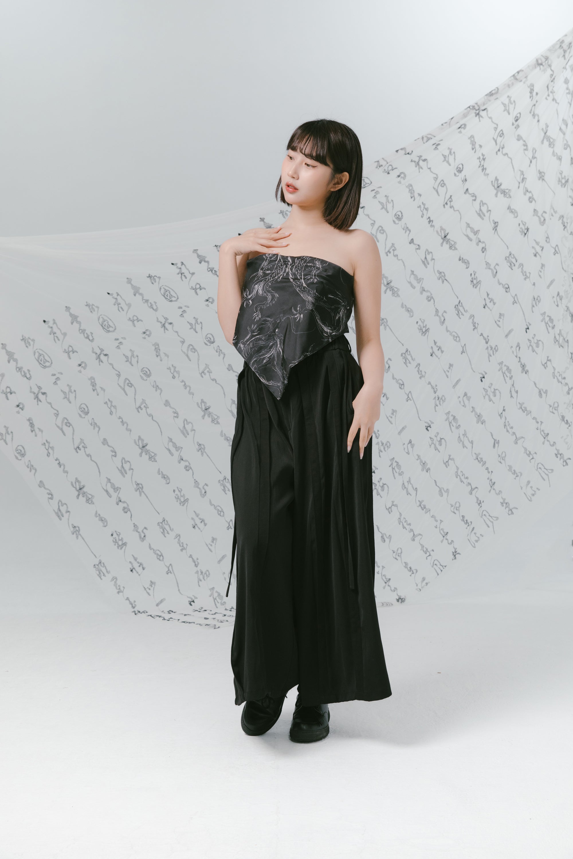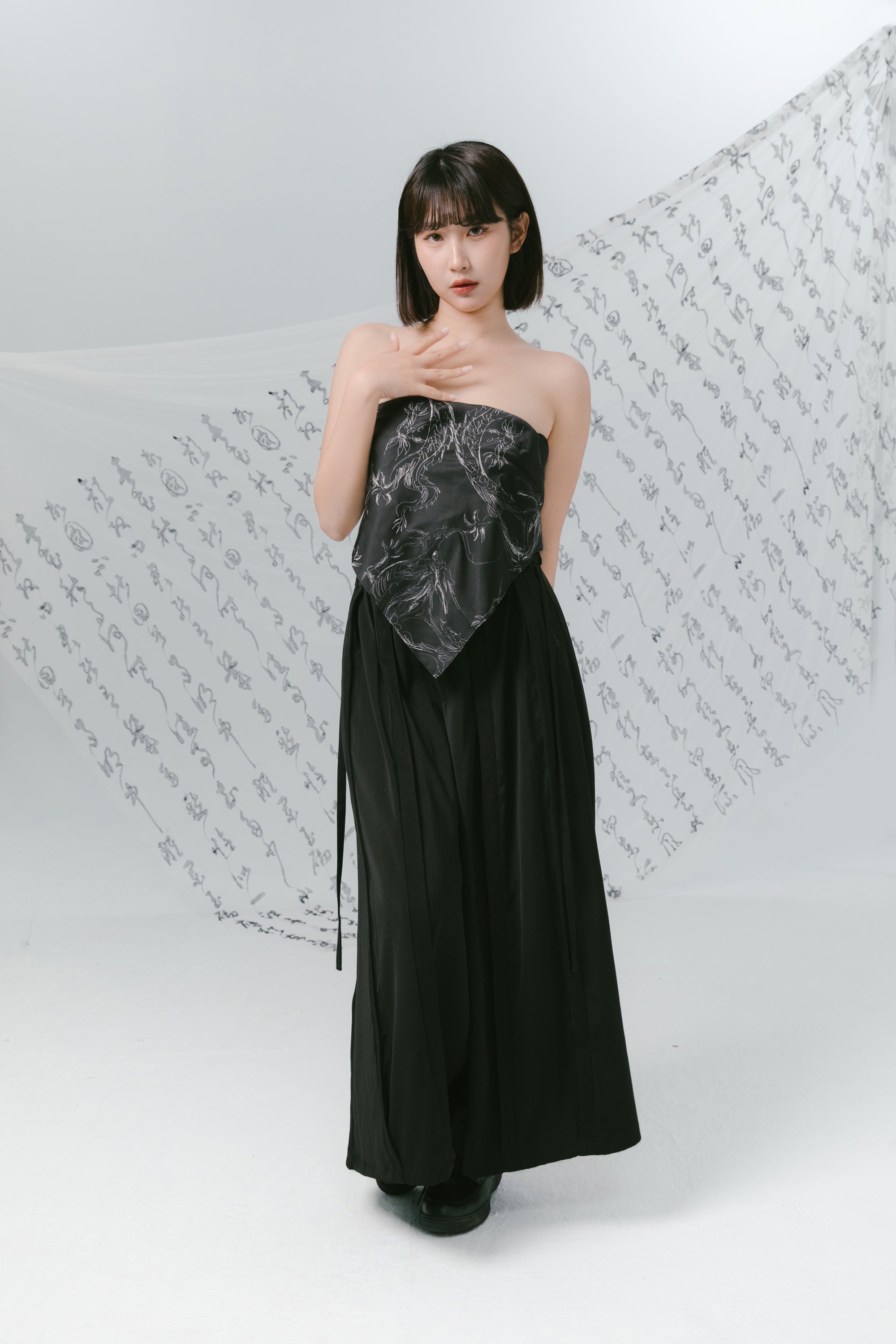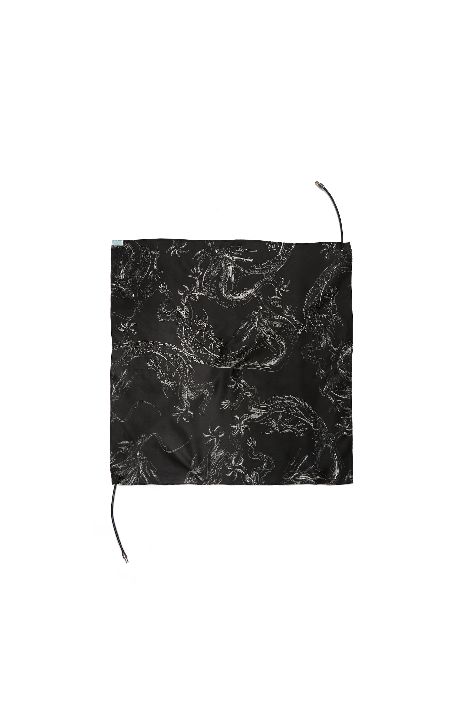 特殊帶有素描龍紋的銅氨絲印花布料,以手繪感線條描繪龍的形體,猶如能量殘影般潛伏於布面上。布料本身具備極佳的柔軟度與垂墜感,搭配綁繩的設計,可以方便使用在各種模式,當頭巾、綁在褲耳做裝飾,甚至作為領巾使用都非常適合。