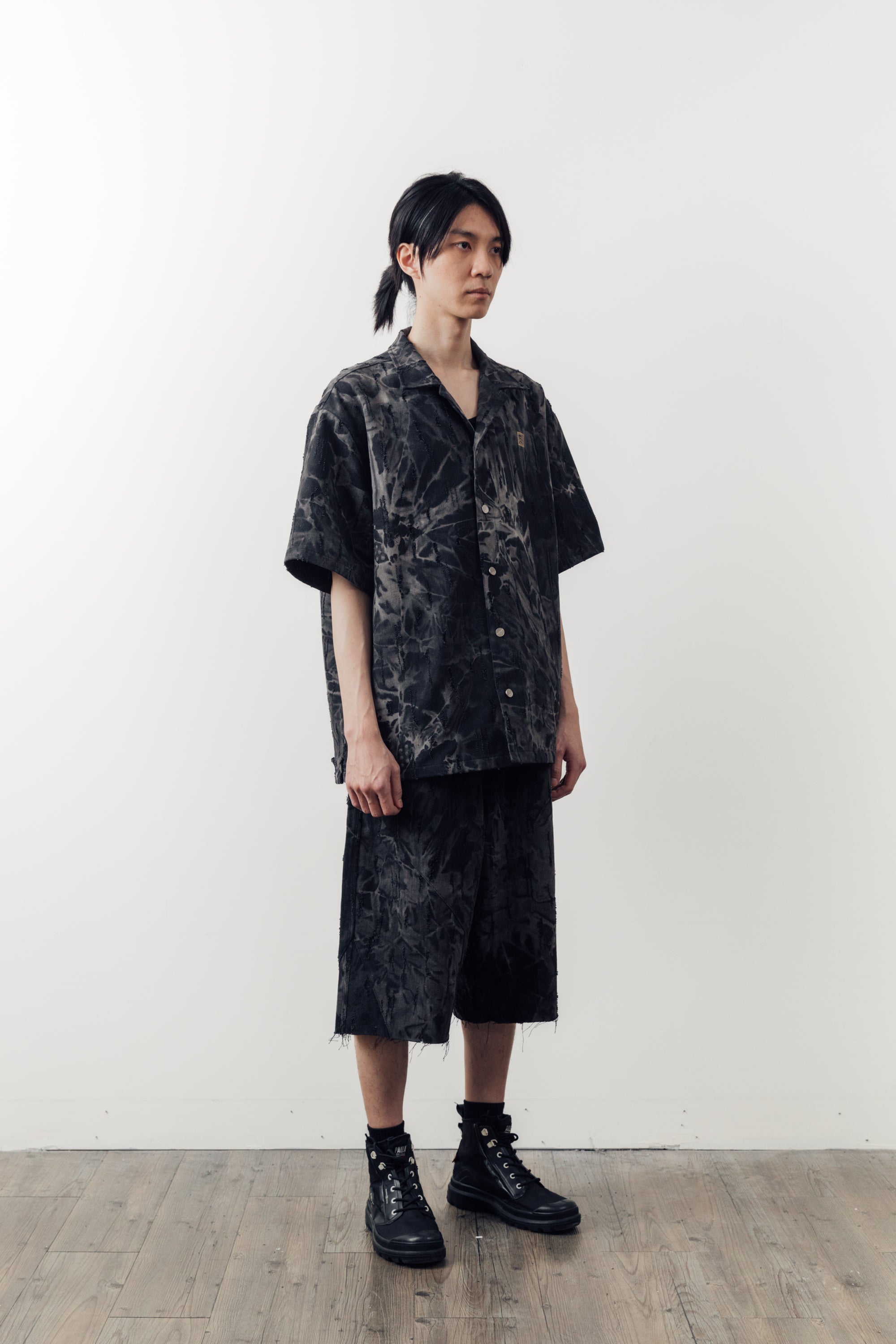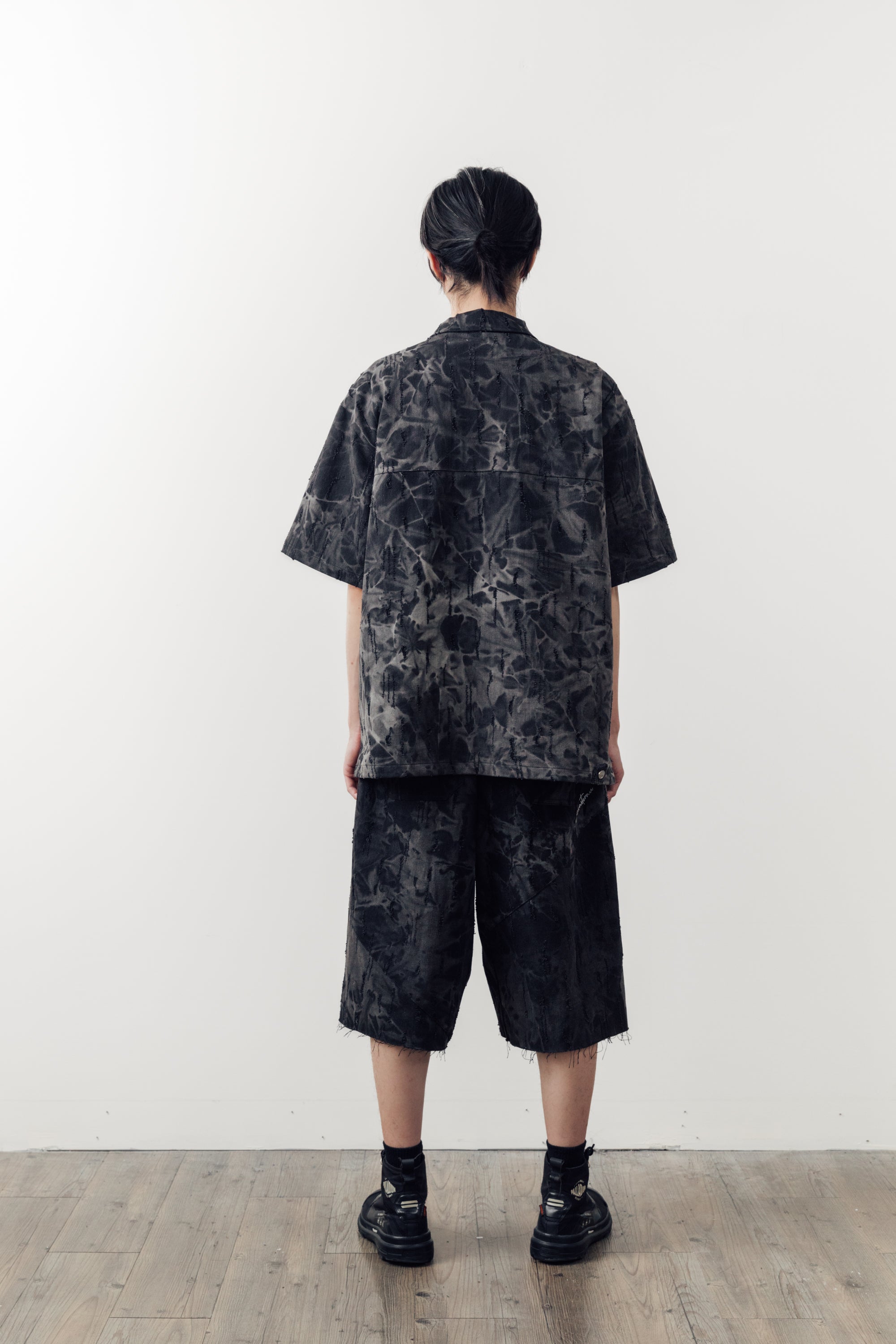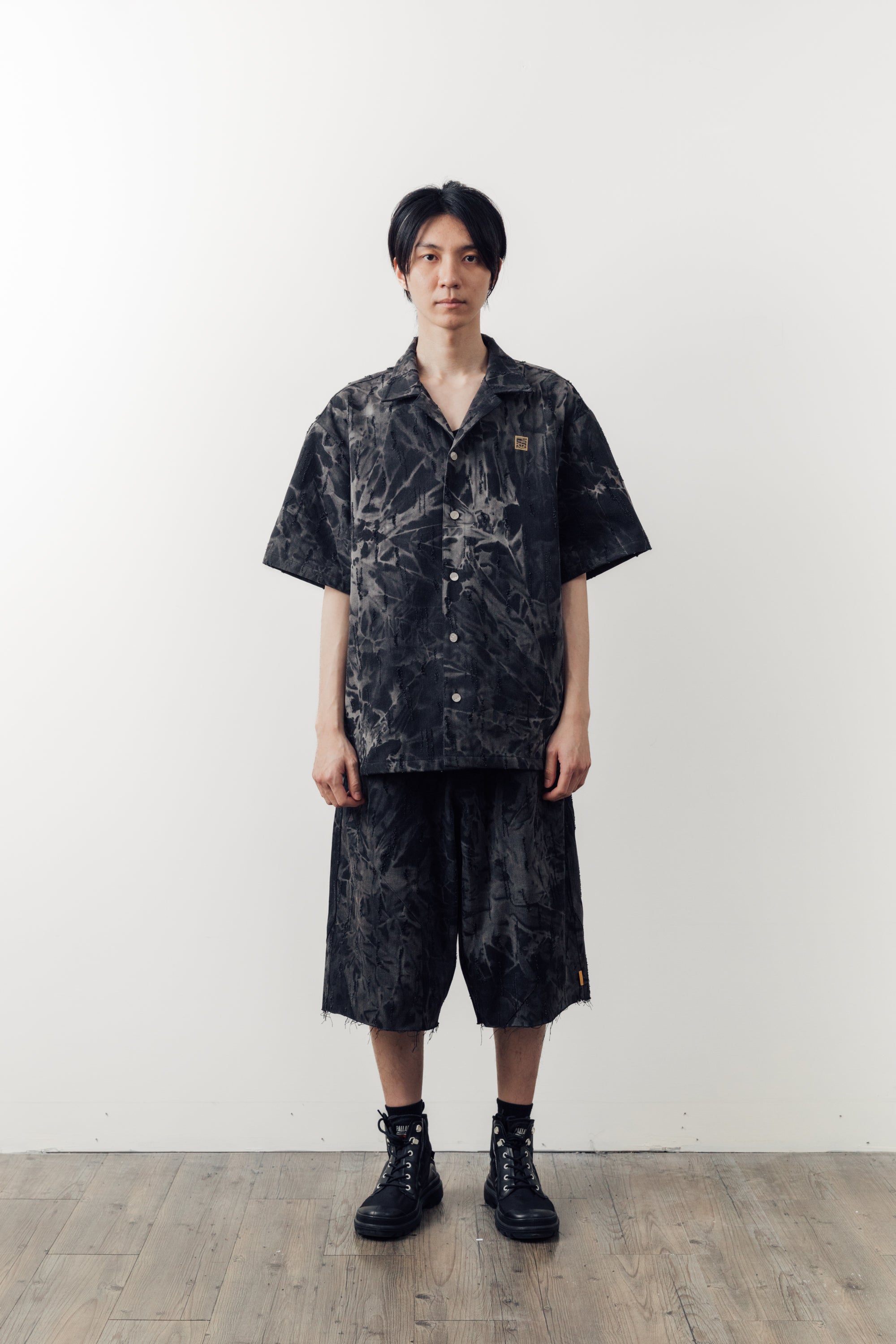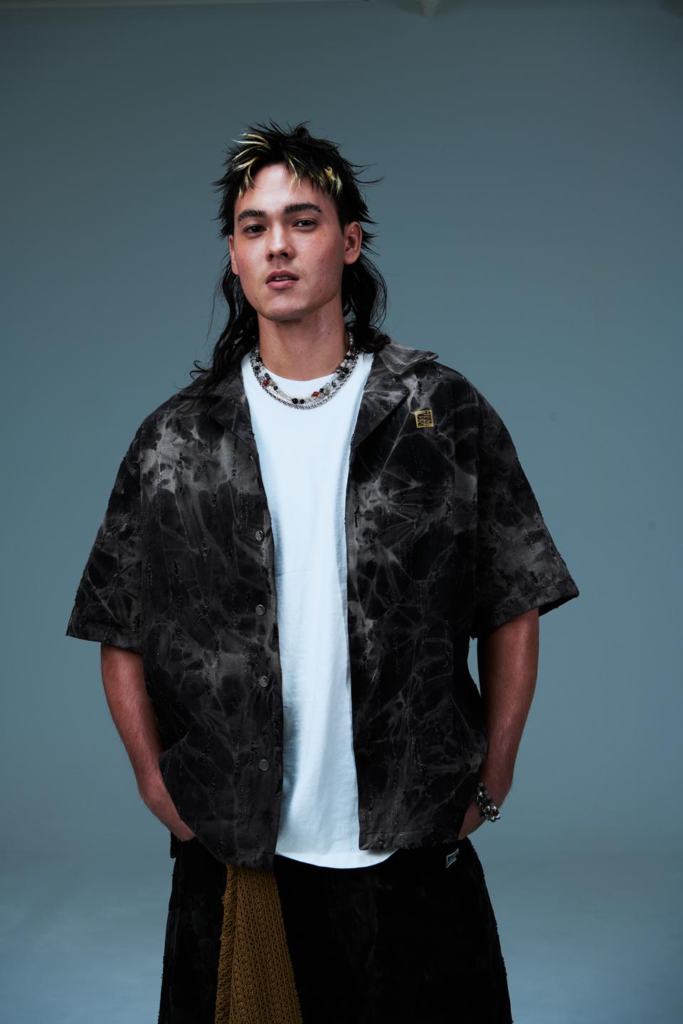 このシャツは、100%コットンデニムをベースに、タイダイ染めの技法を用いて自然な藍染を表現しています。クロッシェ編みで表面の質感を再構築し、生地を重ねることで立体的でありながらしなやかな風合いを生み出しています。無骨なデニムの風合いの中に、繊細な手織りのディテールが織り込まれ、文化的な深みと視覚的な魅力を兼ね備えた半袖シャツに仕上がっています。