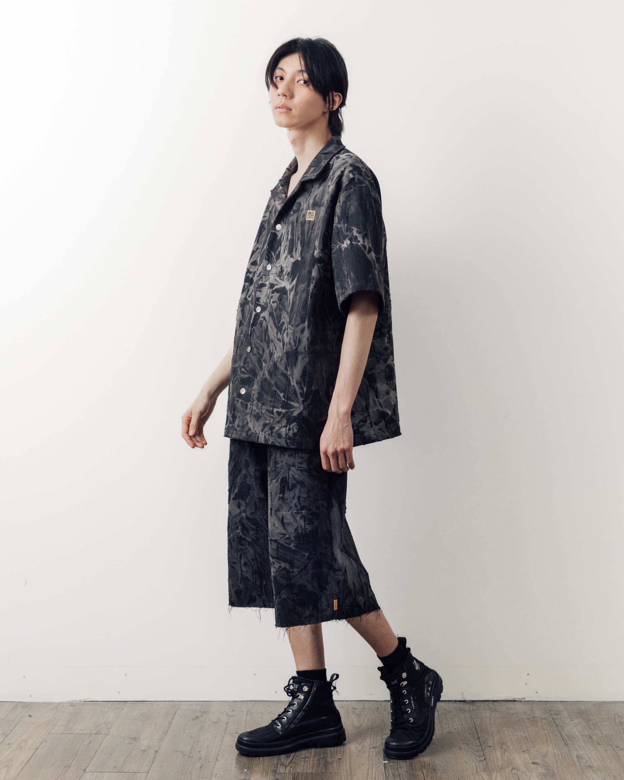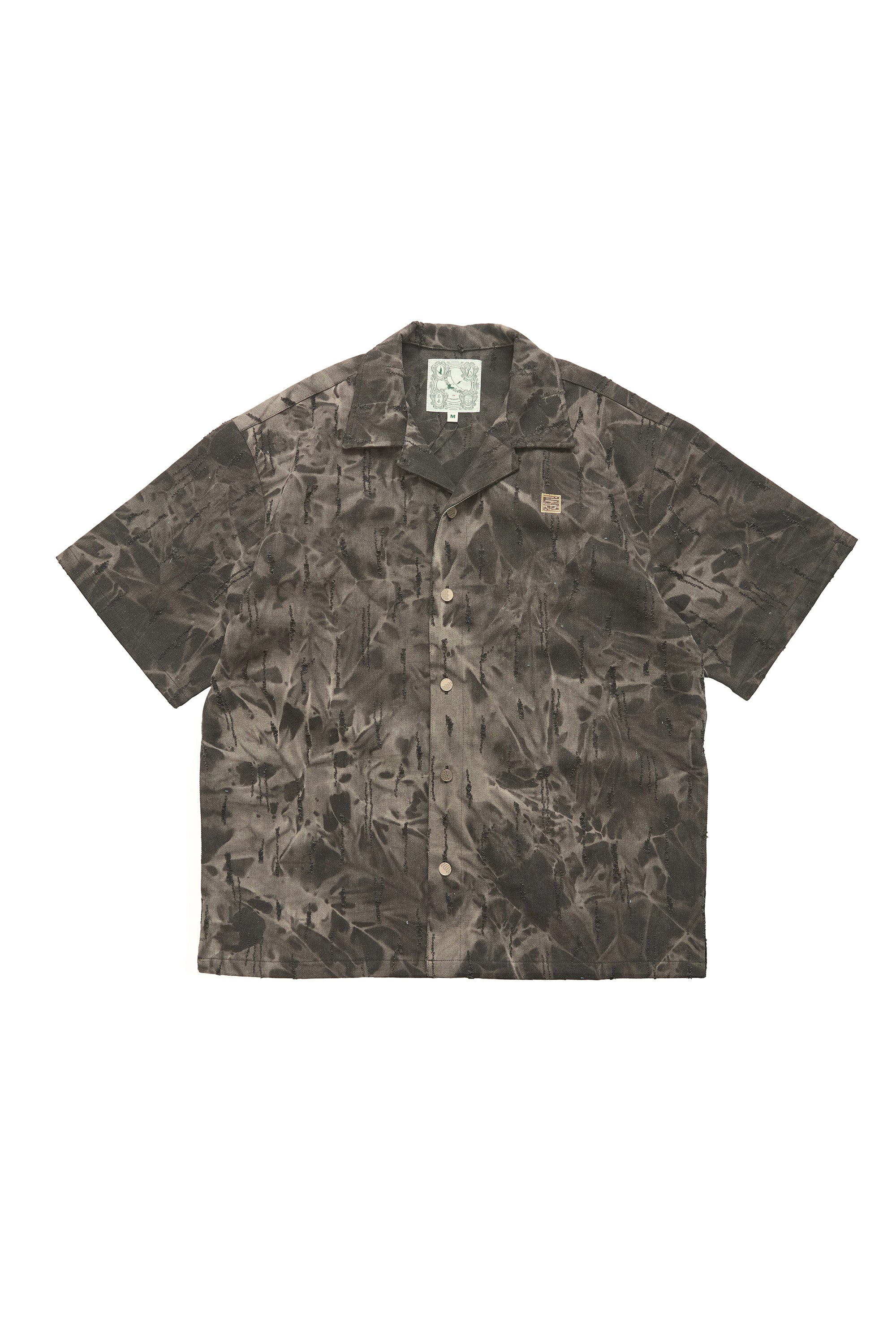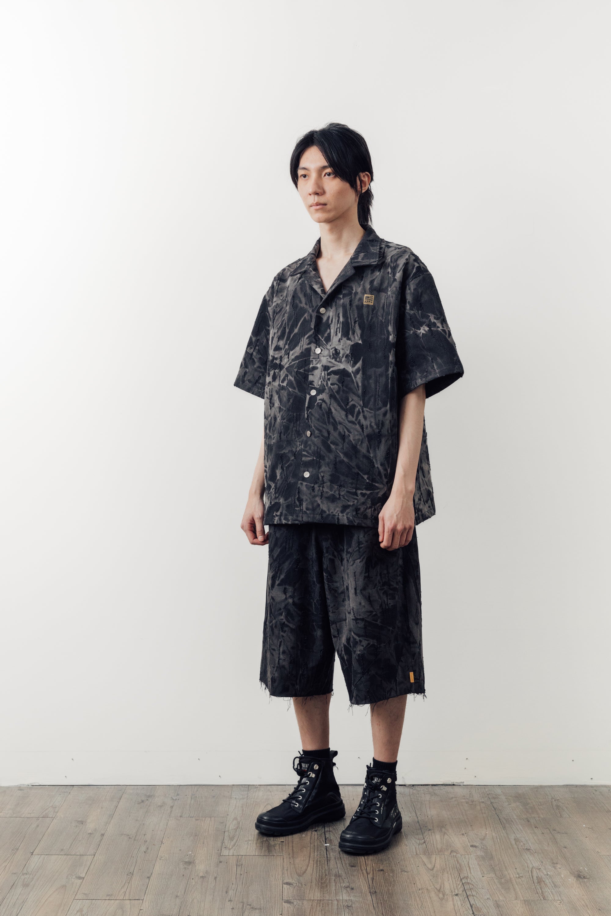このシャツは、100%コットンデニムをベースに、タイダイ染めの技法を用いて自然な藍染を表現しています。クロッシェ編みで表面の質感を再構築し、生地を重ねることで立体的でありながらしなやかな風合いを生み出しています。無骨なデニムの風合いの中に、繊細な手織りのディテールが織り込まれ、文化的な深みと視覚的な魅力を兼ね備えた半袖シャツに仕上がっています。