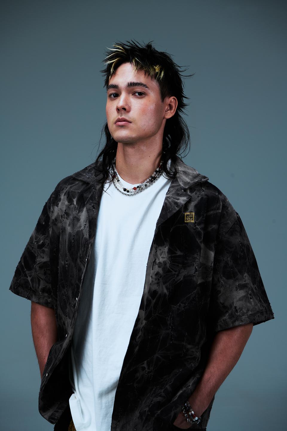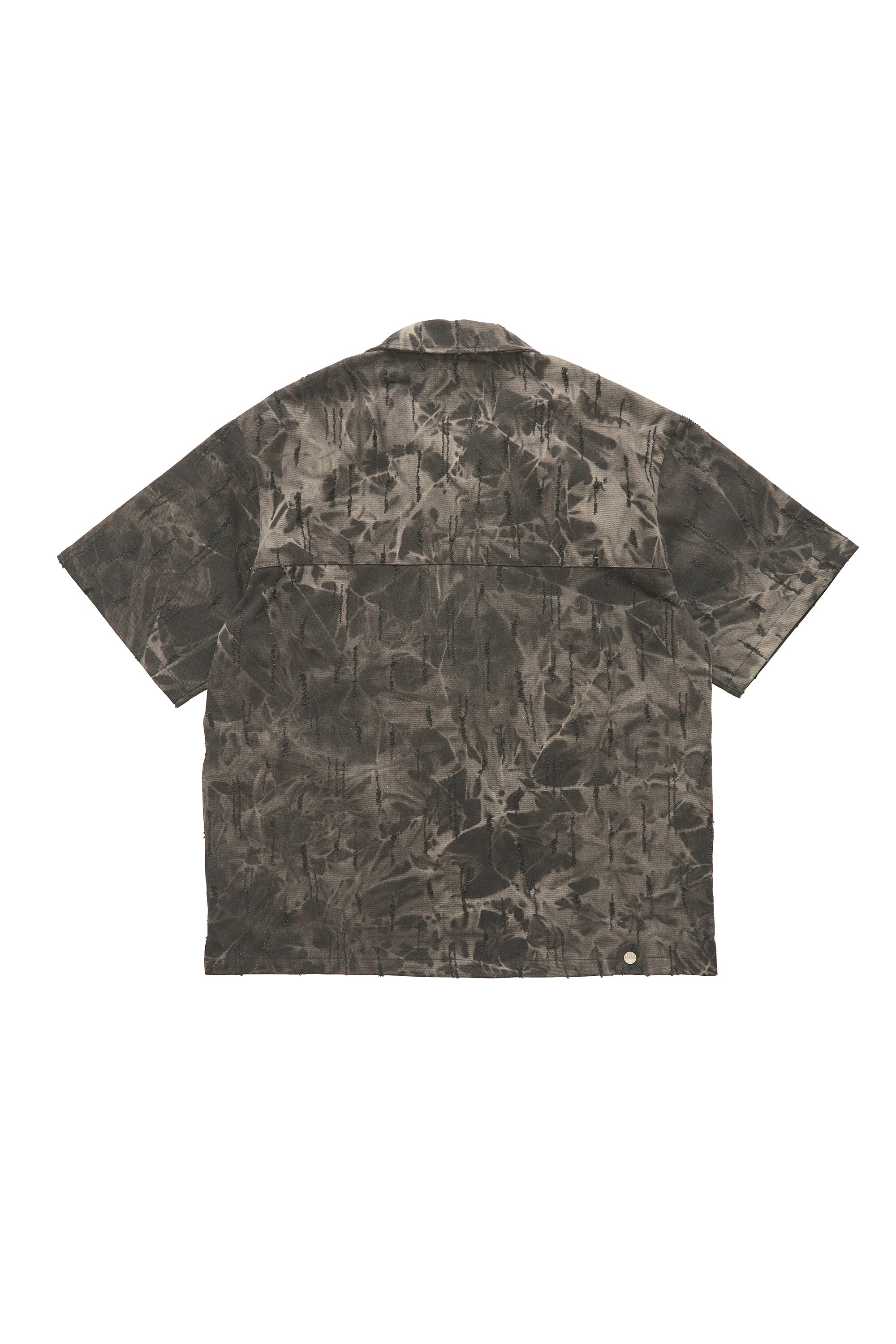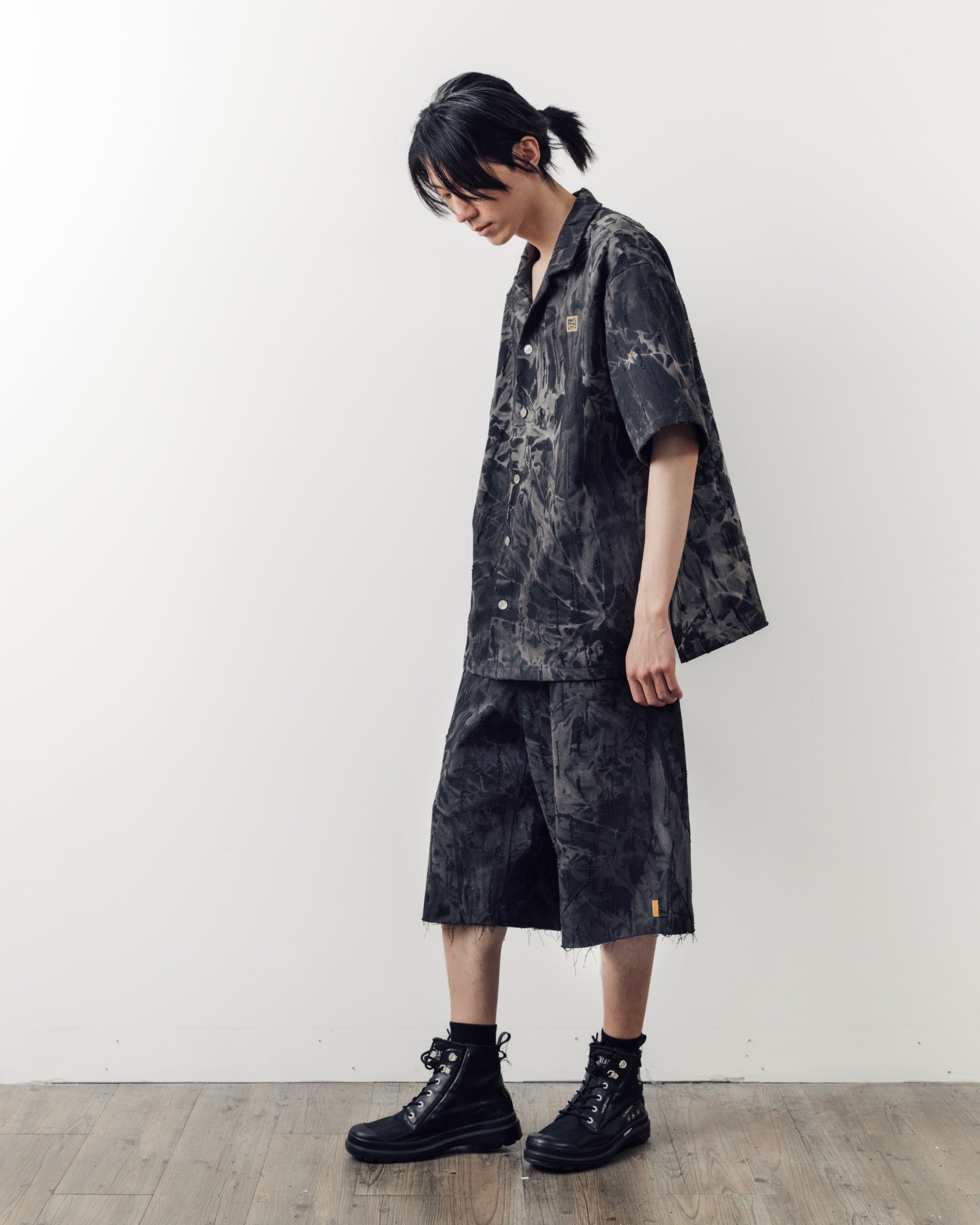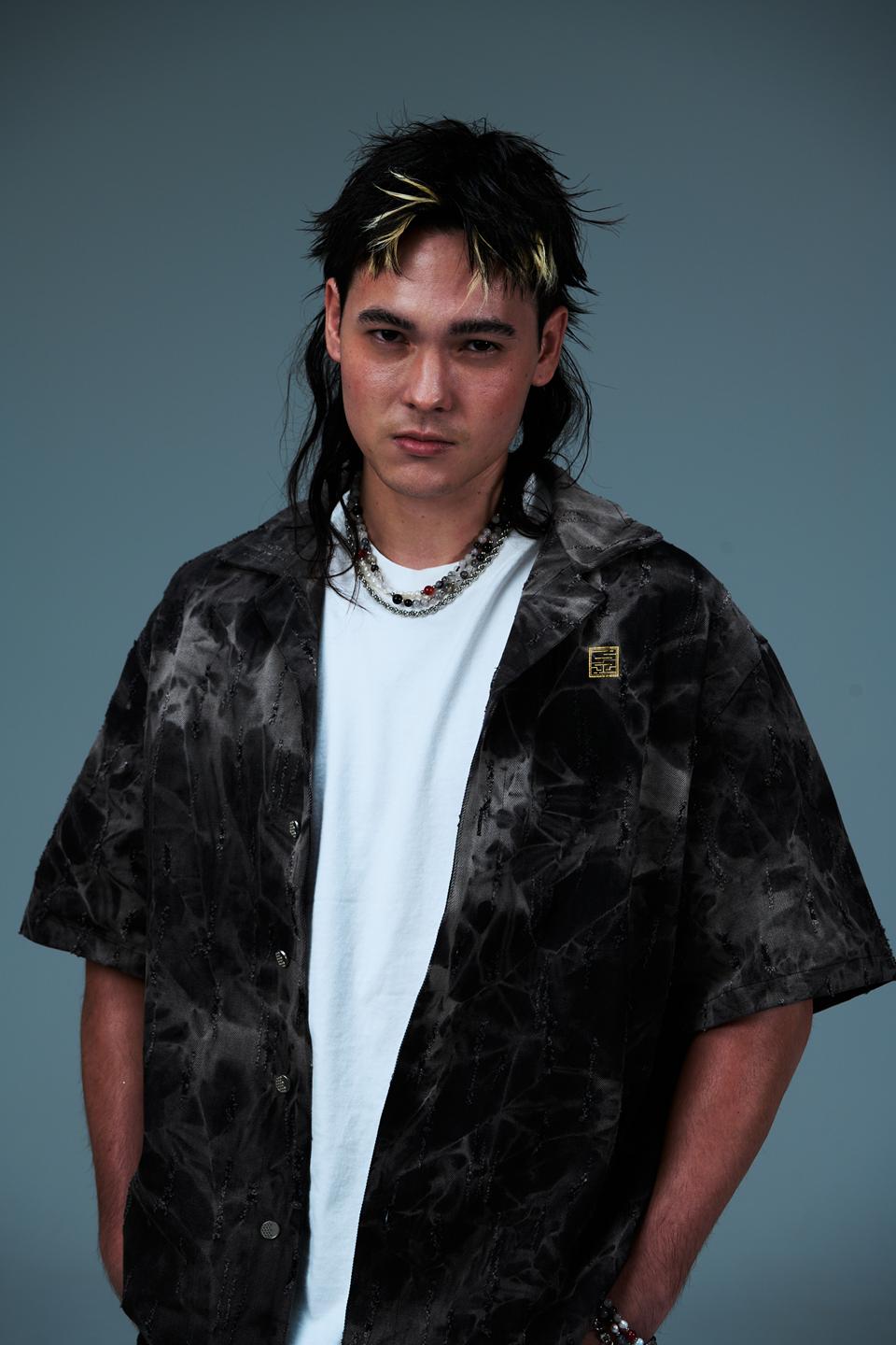 このシャツは、100%コットンデニムをベースに、タイダイ染めの技法を用いて自然な藍染を表現しています。クロッシェ編みで表面の質感を再構築し、生地を重ねることで立体的でありながらしなやかな風合いを生み出しています。無骨なデニムの風合いの中に、繊細な手織りのディテールが織り込まれ、文化的な深みと視覚的な魅力を兼ね備えた半袖シャツに仕上がっています。